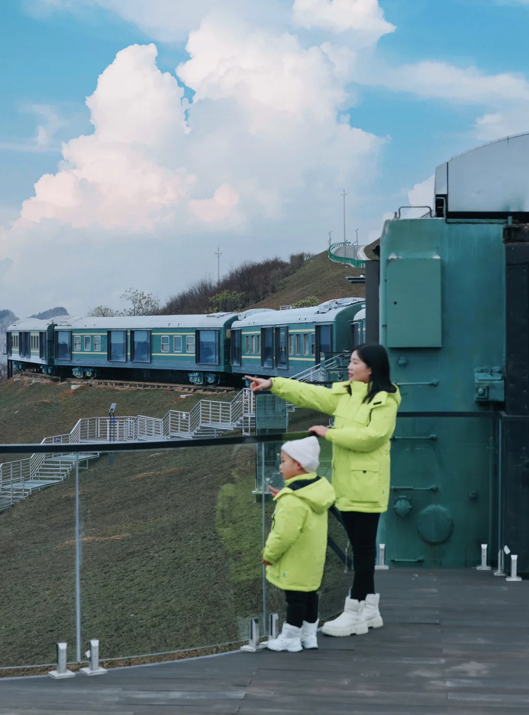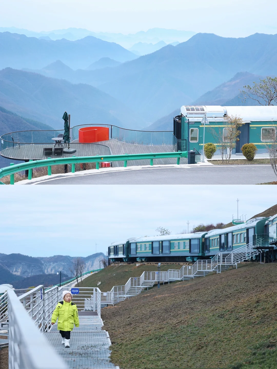 🚞去年被种草的悬崖火车民宿,今年在雪场开放的第一天终于安排上了!虽然去没赶上下大雪有点可惜,但是风景真的有被美到,山顶也还有些积雪,小盆友们玩得超开心🥳