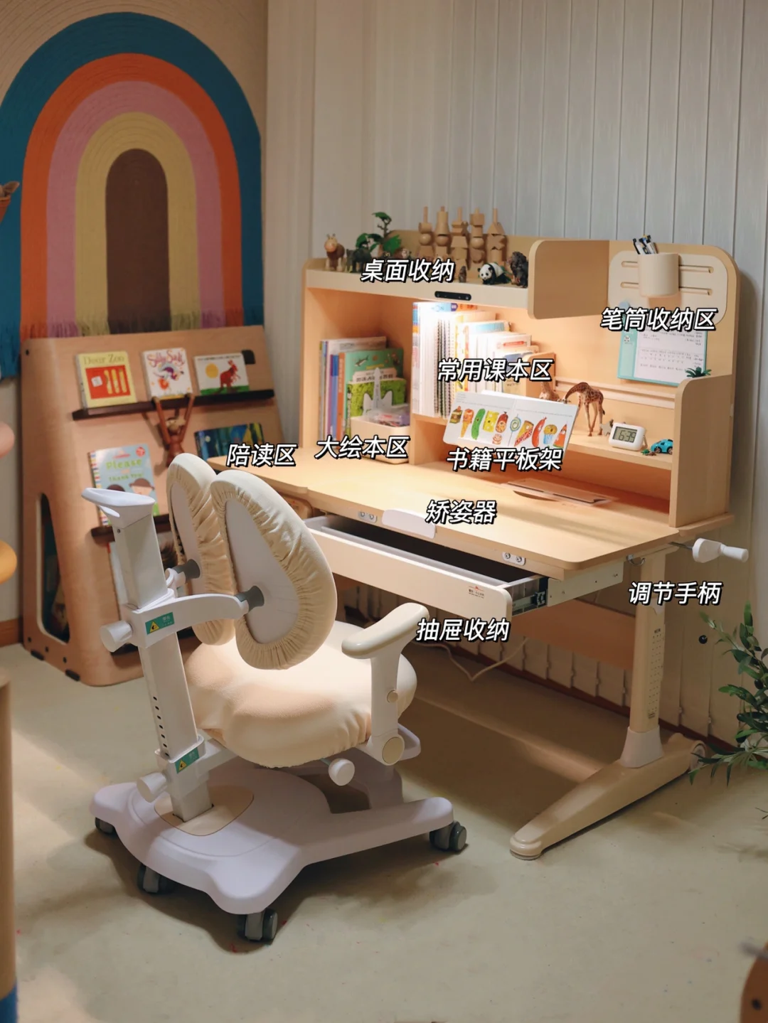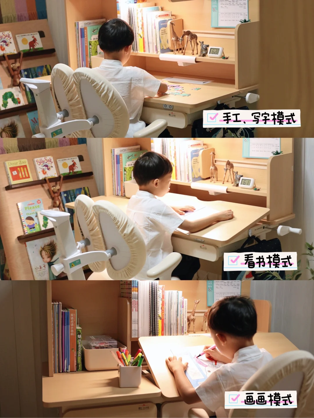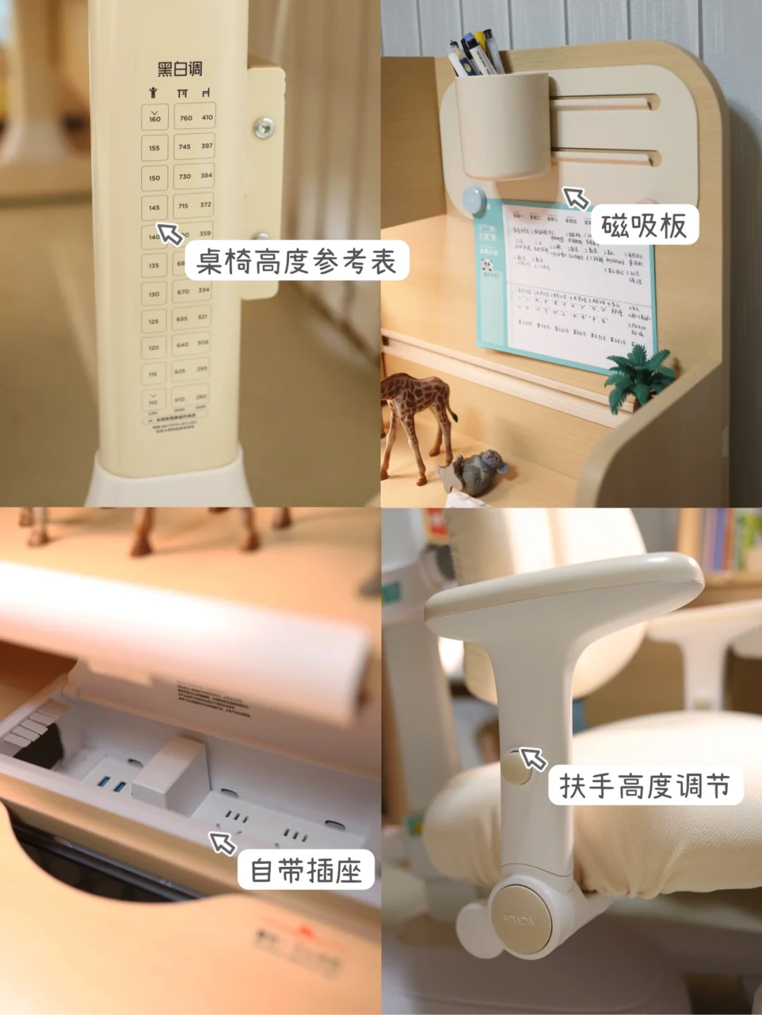 ✔️桌面空间布置很合理,有学习区和收纳区,学习区的桌面还可以调节角度,平时要上网课或者画画都可以斜升桌板。搭配可调节座椅,这样做作业时候,小孩坐姿明显标准端正。还有隐藏式排插,既美观又安全