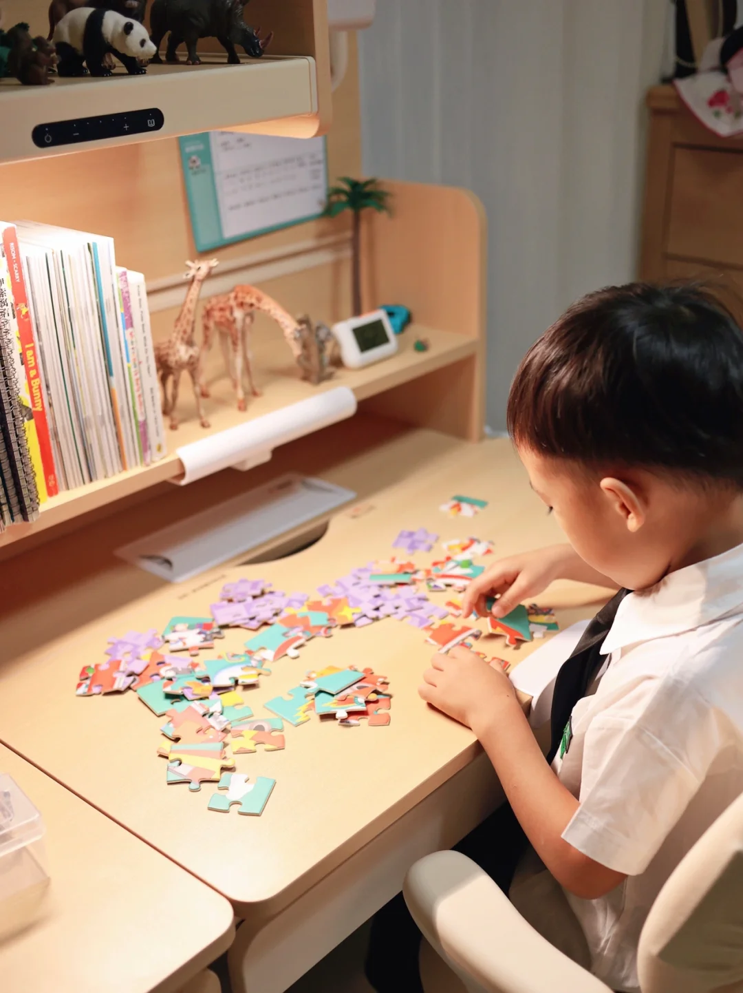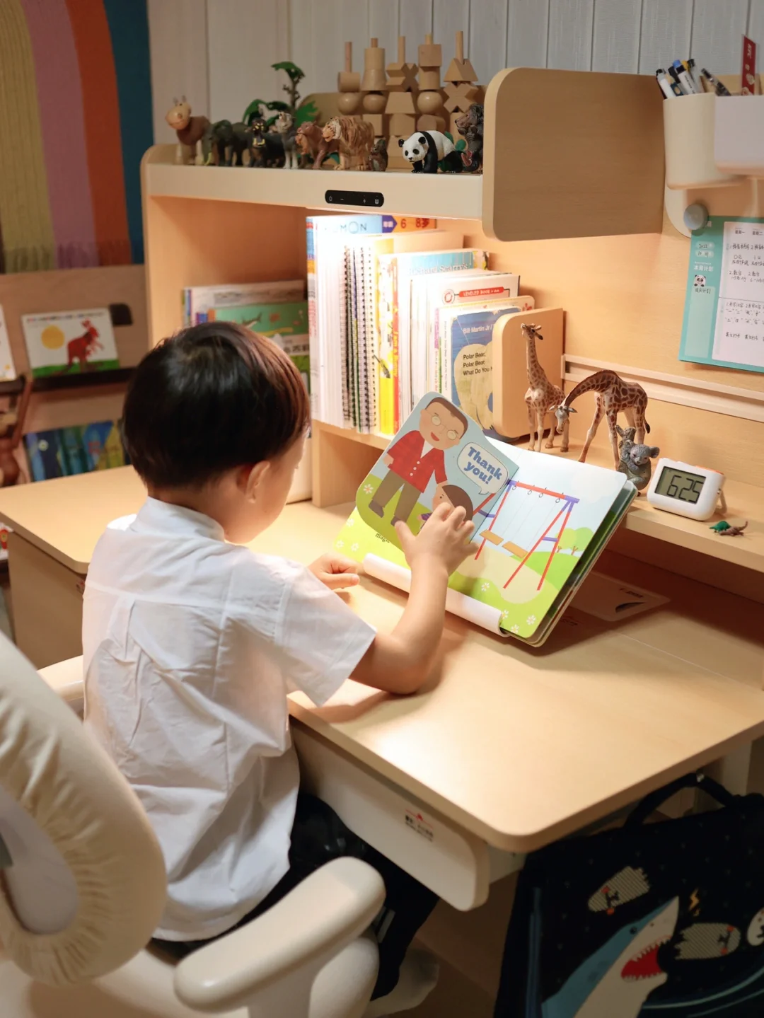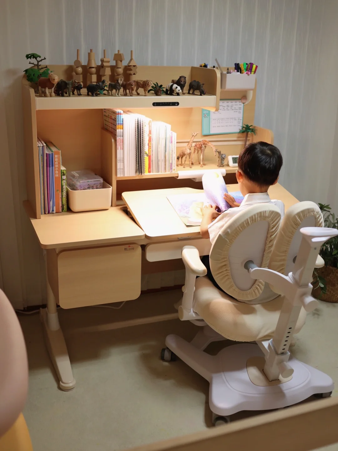 我们家哥哥特别喜欢这款学习桌椅,感觉学习都变得主动好多,每天不管是学习还是玩玩具都要在桌上。而且这种尺寸刚好的原木风学习桌跟我们家儿童房特别搭👍