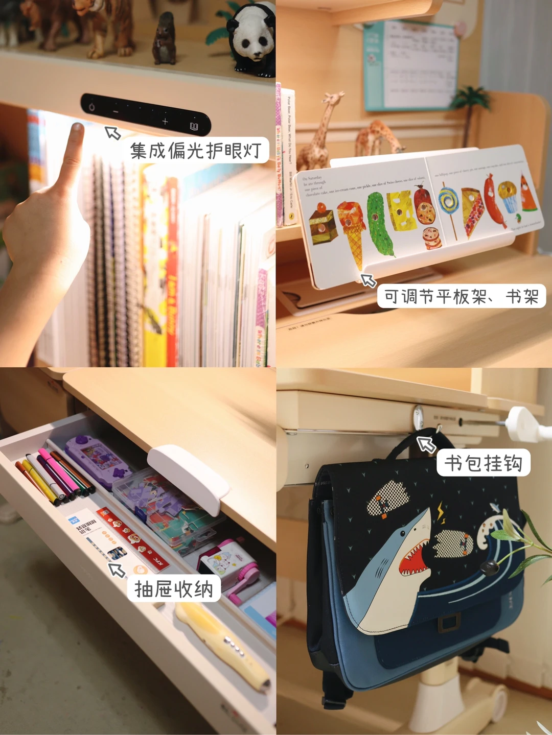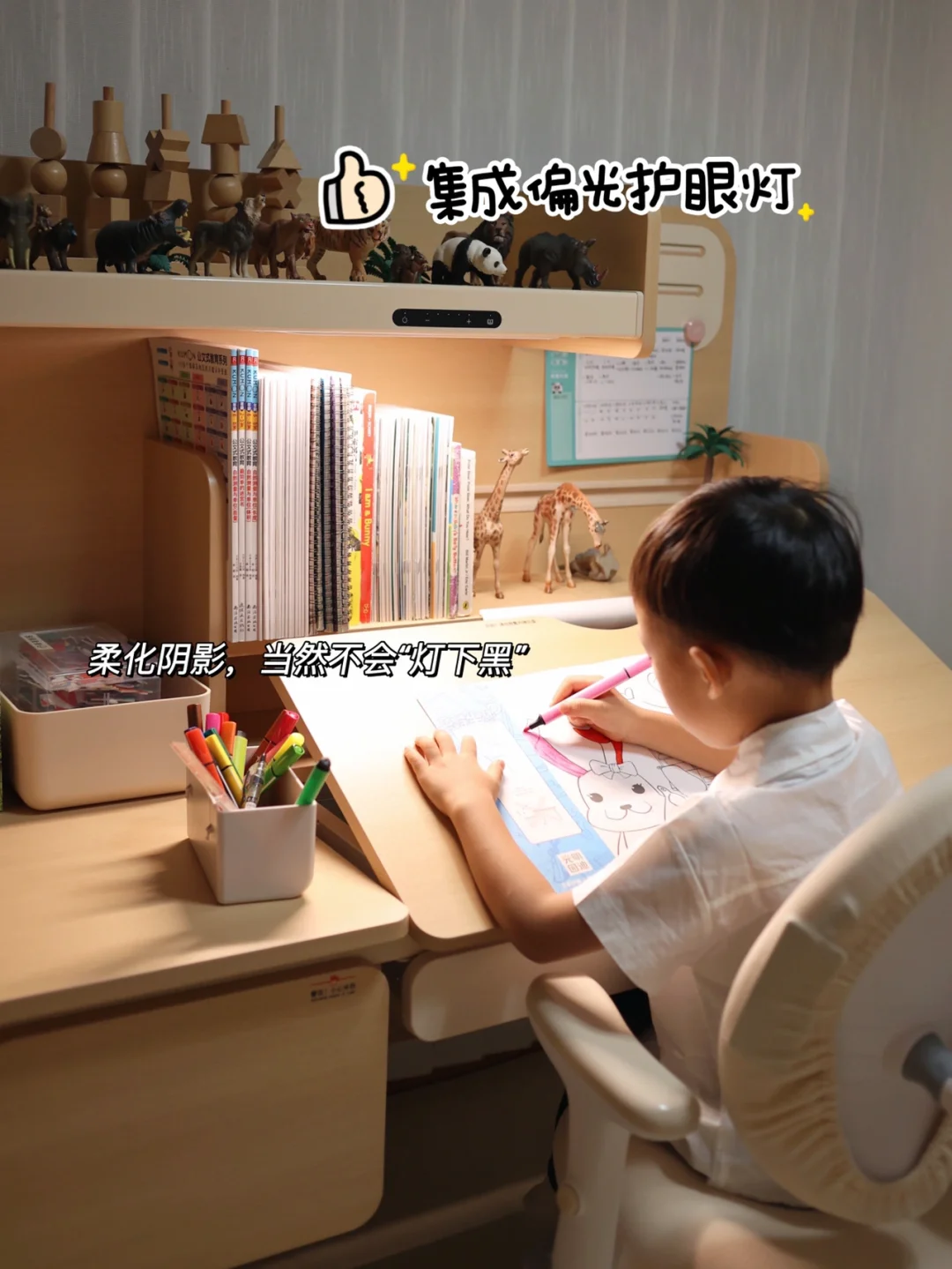 ✔️特别喜欢的就是它的集成偏光护眼灯的设计,护眼灯位于桌子的中央,不仅不会占用桌面的空间,也让照射范围变大更大了,不会直射宝宝的眼睛👀光线也更加的柔和,长时间做作业或者画画也不会感觉灯光昏沉,4000K色温模拟早晨8点的自然晨光,提升专注力和学习效率