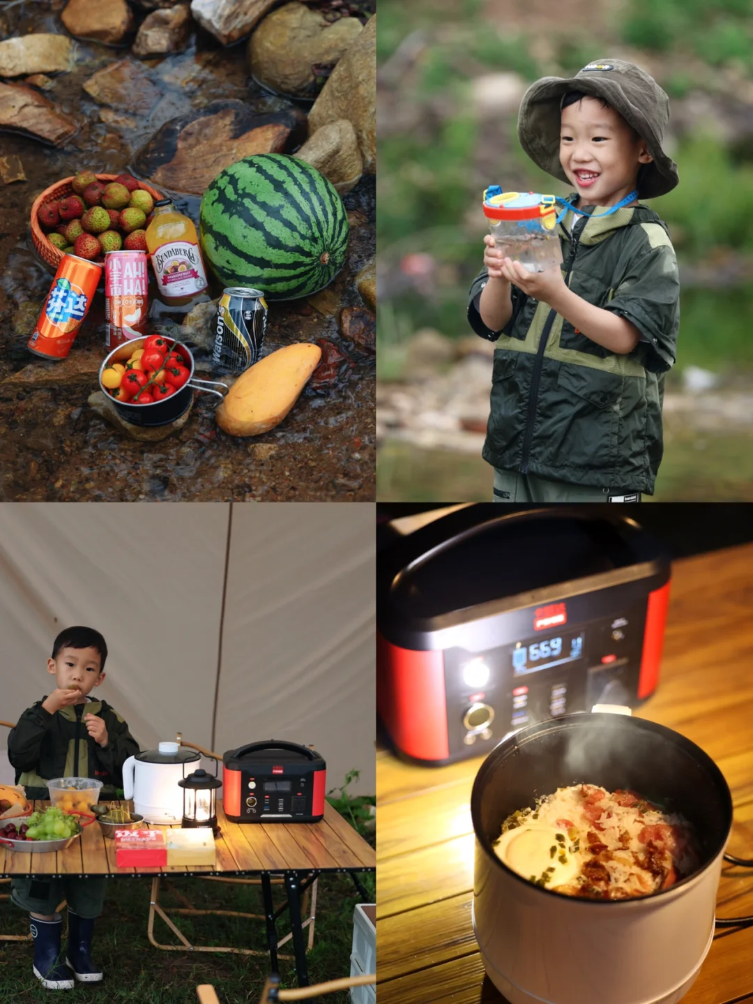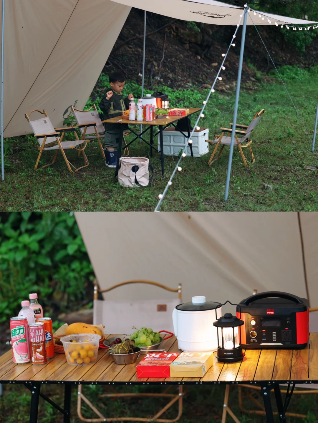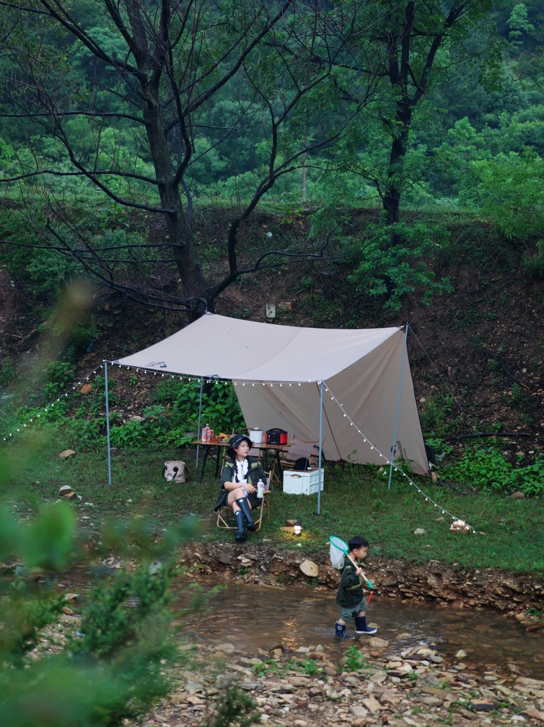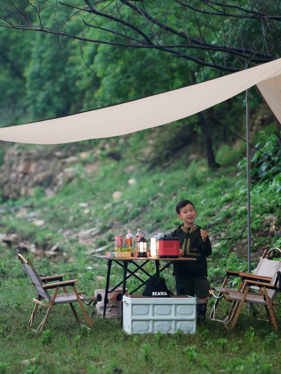⛰️因为是在山里,所以比较凉快,特意找了一颗大树底下,把天幕搭成了7字型,空间更高出入更方便,大家如果是长方形的天幕就可以试试我这种搭法哟!带了户外电源可以给娃做饭,晚上也可以照亮,我们呆到了晚上七八点才走,空气是真的好~娃儿也是玩得根本不愿意回
