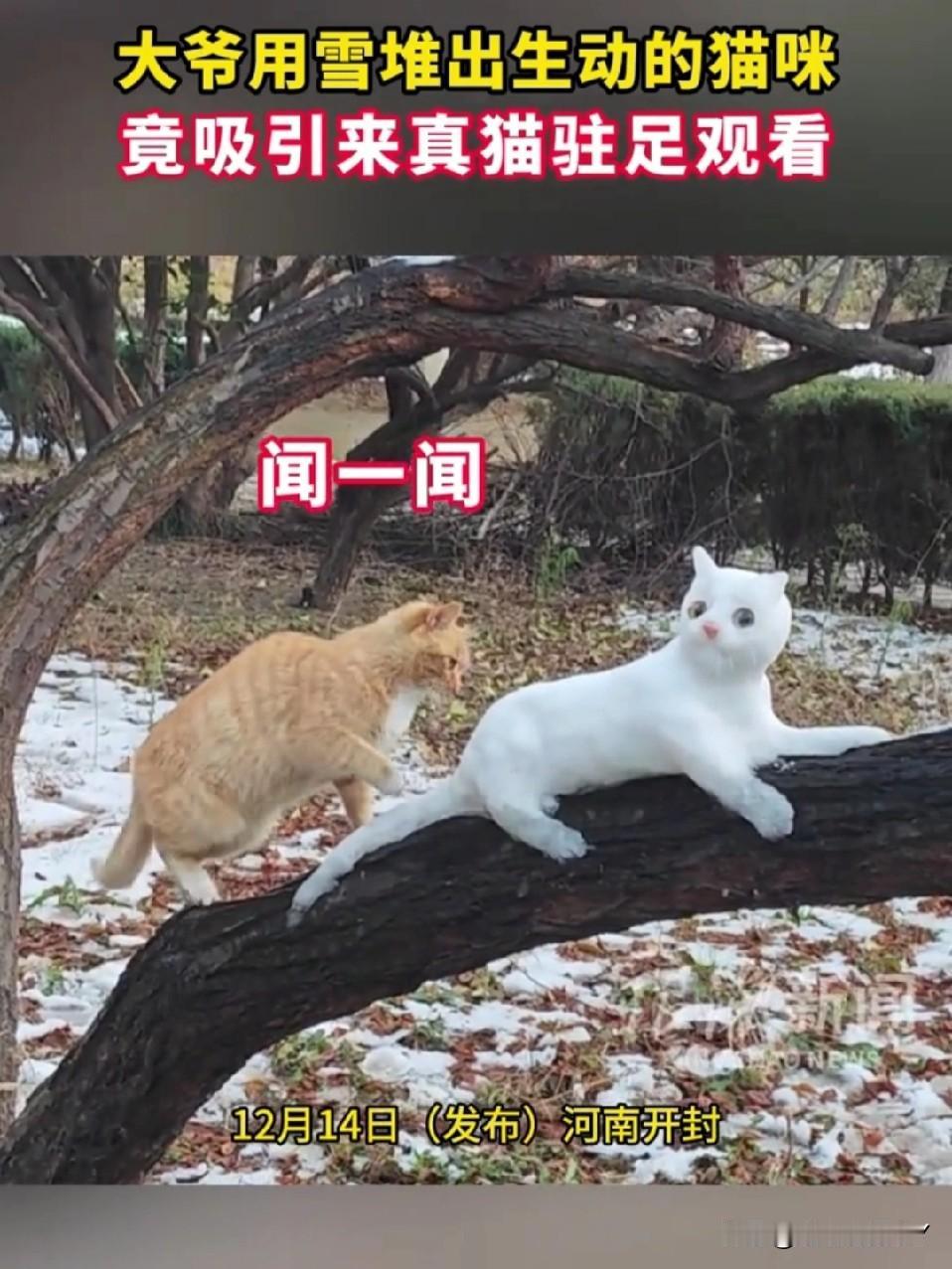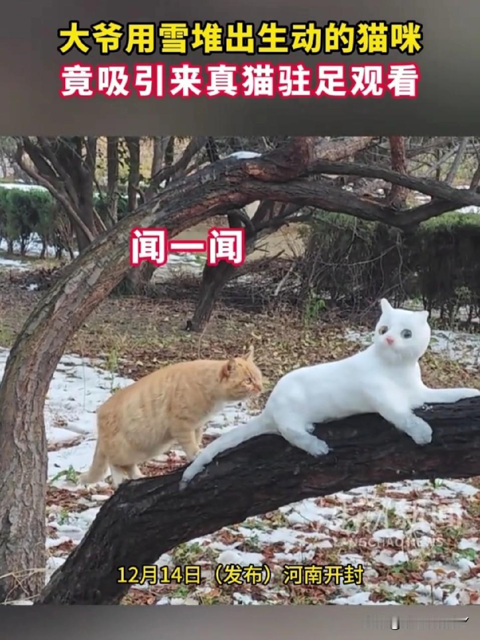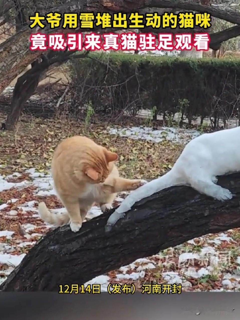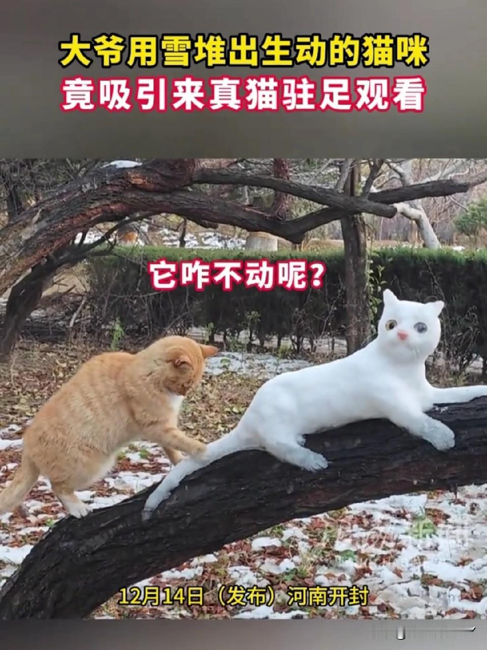 开封大爷堆雪猫 把真橘猫整懵了[笑哭] 开封的雪天充满了乐趣,大爷在树上用雪精心雕琢出一只活灵活现的白雪猫。一只路过的橘猫直接被唬住,它慢慢凑上前去,闻了又闻,小脑袋歪着满是疑惑…… 橘猫试探着伸出爪子,扒拉了一下雪猫的尾巴,结果“啪嗒”一声,尾巴直接掉了下来,橘猫瞬间愣住,盯着地上的雪尾巴,一脸懵,仿佛在灵魂拷问:这“猫兄弟”咋还掉零件呢?[大笑] 不得不说,大爷这手艺,连猫星人都被骗到啦~