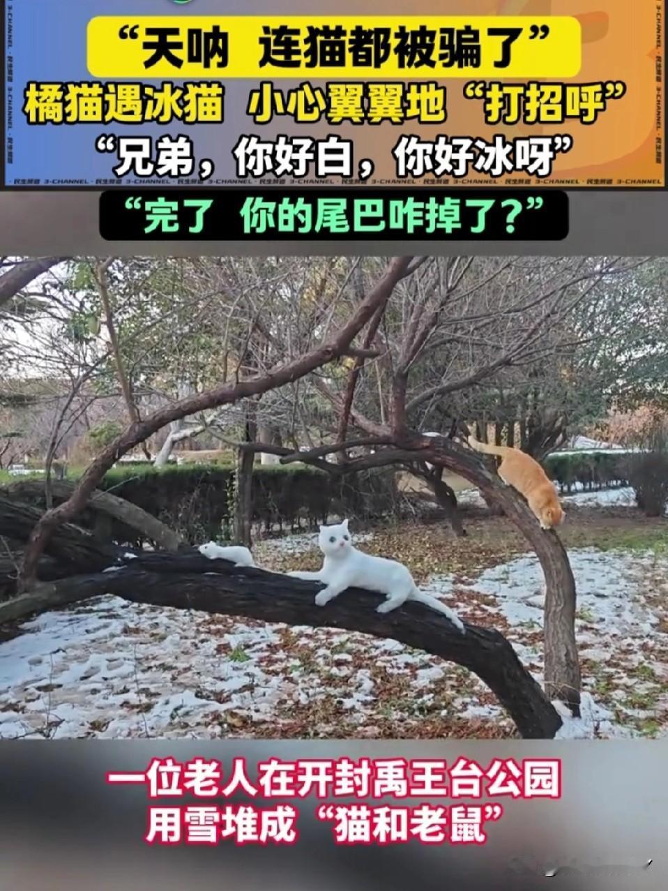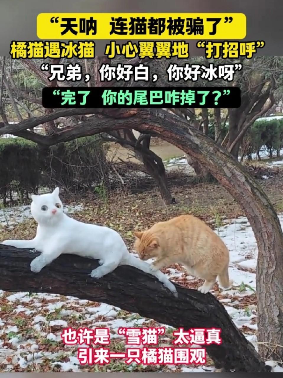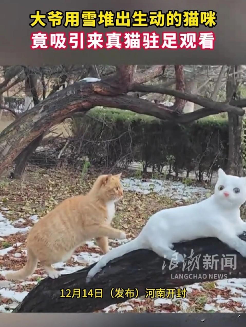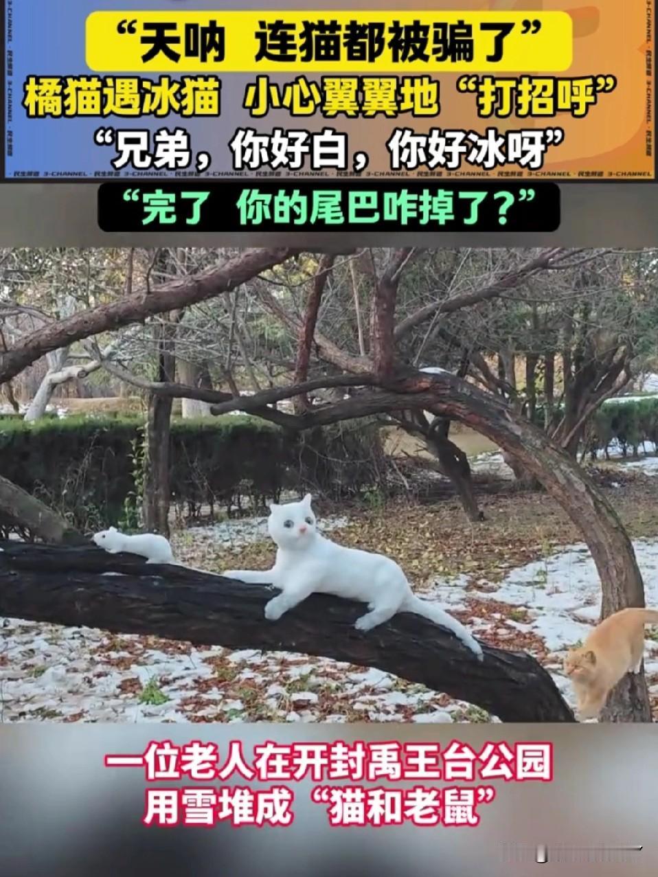 开封大爷堆雪猫 把真橘猫整懵了[笑哭] 开封的雪天充满了乐趣,大爷在树上用雪精心雕琢出一只活灵活现的白雪猫。一只路过的橘猫直接被唬住,它慢慢凑上前去,闻了又闻,小脑袋歪着满是疑惑…… 橘猫试探着伸出爪子,扒拉了一下雪猫的尾巴,结果“啪嗒”一声,尾巴直接掉了下来,橘猫瞬间愣住,盯着地上的雪尾巴,一脸懵,仿佛在灵魂拷问:这“猫兄弟”咋还掉零件呢?[大笑] 不得不说,大爷这手艺,连猫星人都被骗到啦~
