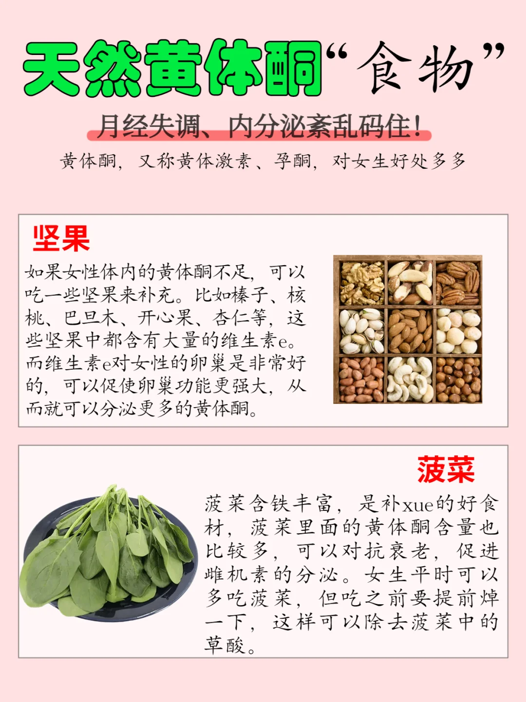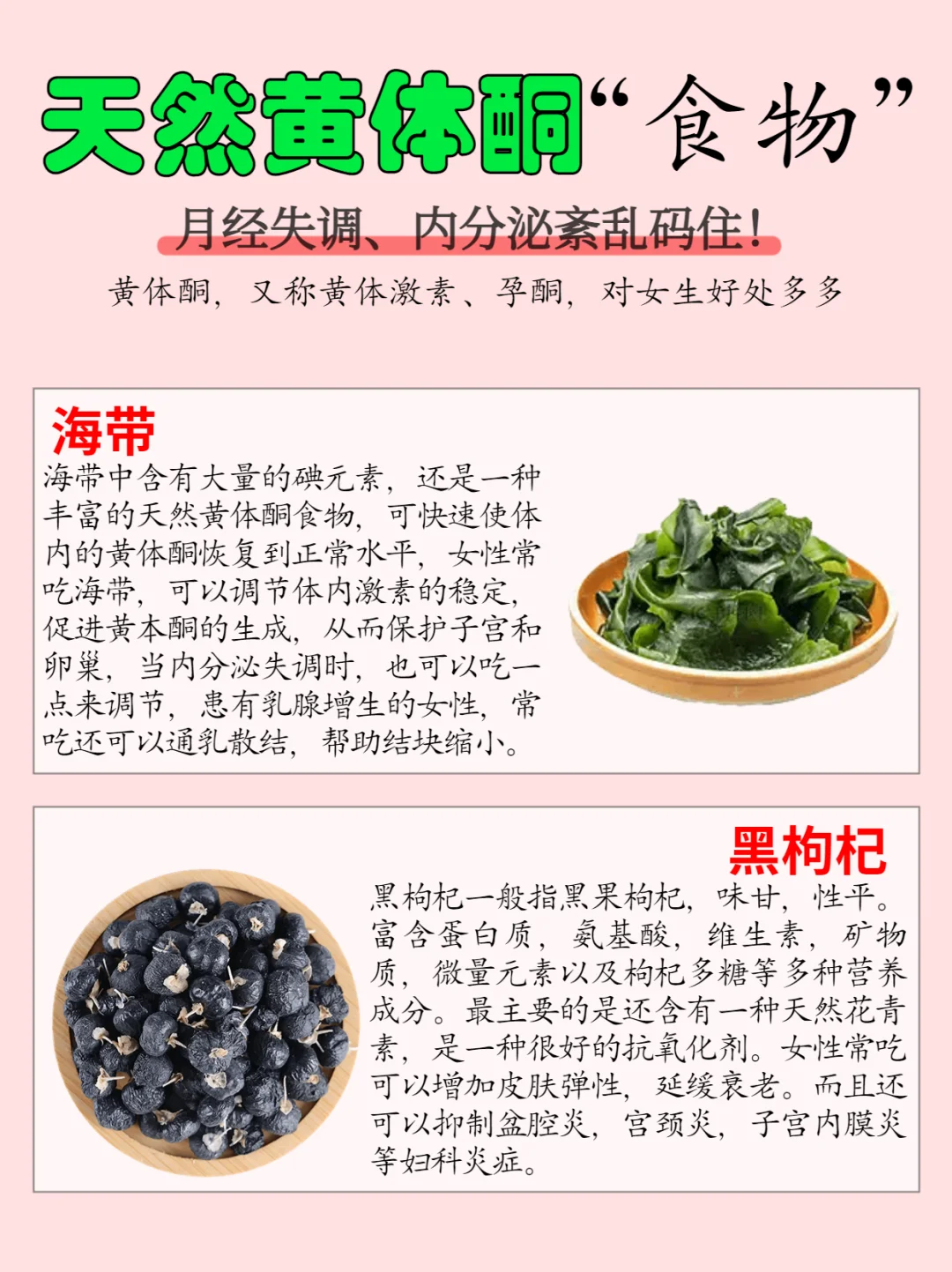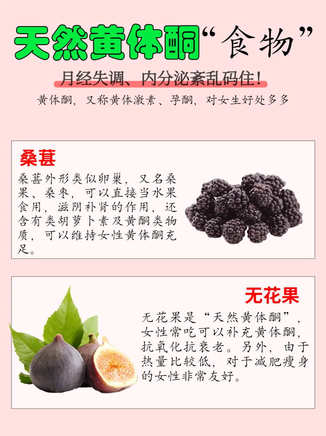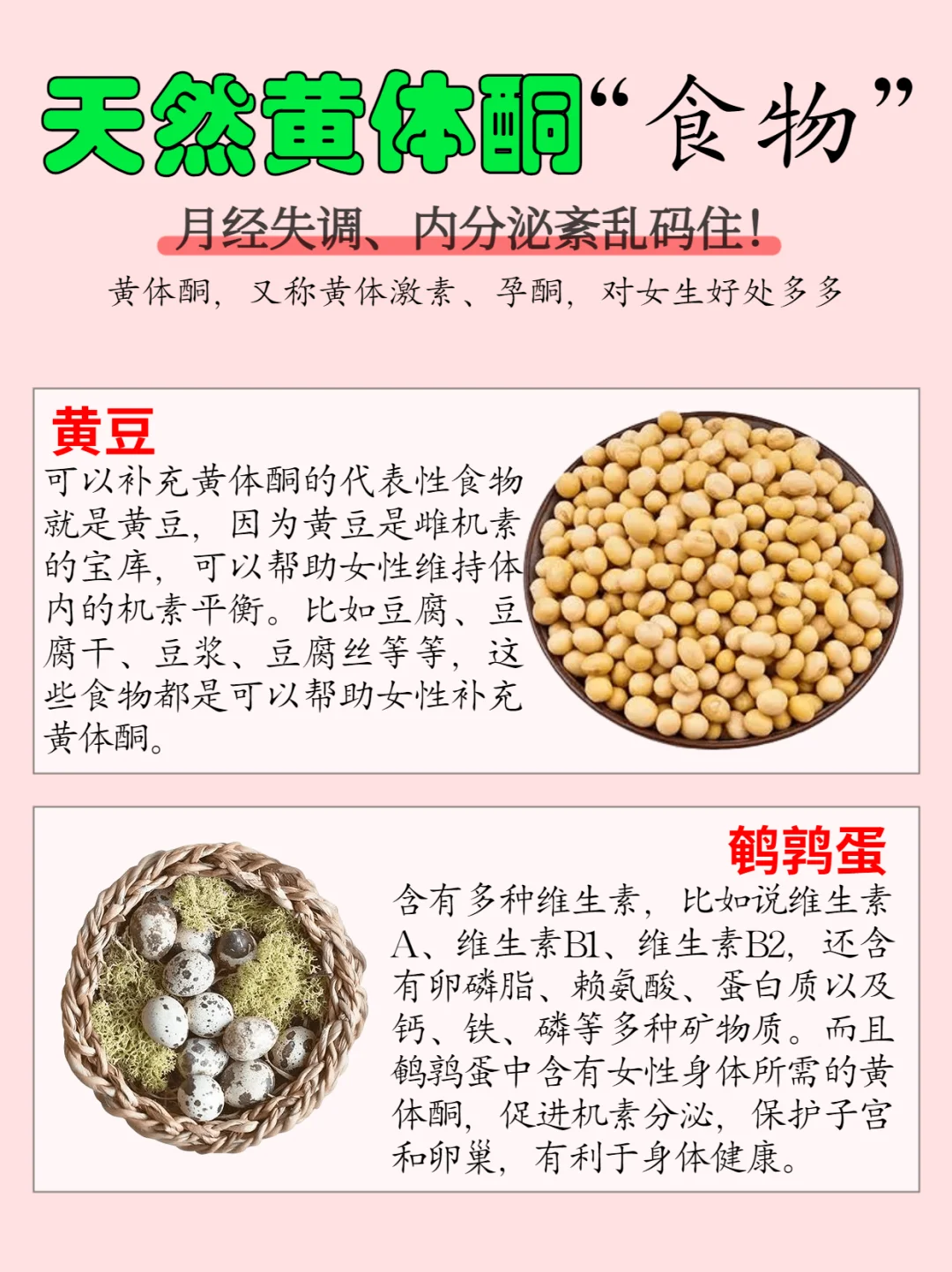 黄体酮,又叫做黄体激素、孕酮,是卵巢分泌的具有生物活性的主要孕激素,除了可保证女生月经正常、乳房健康发育外,黄体酮在保护孕妇妊娠顺利中也起到不容小觑的重要作用。 你知道不?一旦女性体内分泌的黄体酮不足,身体也会受到一定程度影响,比如面色枯黄、容易衰老、月经失调、内分泌紊乱、睡不好等情况。 今天带来10种天然黄体酮食物,日常随处可见,方便大家补充! 小吃货祝大家越来越年轻,人美心善体健康!动动小手支持下哦!“药补不如食补”,这十大自带黄体酮食物记得码住! 鹌鹑蛋:鹌鹑蛋🥚含有多种维生素,比如说维生素A、维生素B1、维生素B2,还含有卵磷脂、赖氨酸、蛋白质以及钙、铁、磷等多种矿物质。而且鹌鹑蛋中含有女性身体所需的黄体酮,促进机素分泌,保护子宫和卵巢,有利于身体健康。 葛根:葛根粉是一种营养价值高的养生食物,葛根粉中也含有植物雌机素,自带黄体酮,所以女性朋友经常吃点葛根粉,可以分泌机素,保护子宫和卵巢,也会使皮肤状态越来越好,让女性越来越年轻。 桑葚:桑葚外形类似卵巢,又名桑果、桑枣,可以直接当水果食用,滋阴补肾的作用,还含有类胡萝卜素及黄酮类物质,可以维持女性黄体酮充足。 无花果:无花果是“天然黄体酮”,女性常吃可以补充黄体酮,抗氧化抗衰老。另外,由于热量比较低,对于减肥瘦身的女性非常友好。 黑豆:黑豆含有大量的雌机素,会相比于其他的豆类能更好的帮助女性补充黄体酮。黑豆中含有丰富的蛋白质和免疫因子,可以增强抵抗力。 黄豆:可以补充黄体酮的代表性食物就是黄豆,因为黄豆是雌机素的宝库,可以帮助女性维持体内的机素平衡。比如豆腐、豆腐干、豆浆、豆腐丝等等,这些食物都是可以帮助女性补充黄体酮。 海带:海带中含有大量的碘元素,还是一种丰富的天然黄体酮食物,可快速使体内的黄体酮恢复到正常水平,女性常吃海带,可以调节体内激素的稳定,促进黄本酮的生成,从而保护子宫和卵巢,当内分泌失调时,也可以吃一点来调节,患有乳腺增生的女性,常吃还可以通乳散结,帮助结块缩小。 坚果:如果女性体内的黄体酮不足,可以吃一些坚果来补充。比如榛子、核桃、巴旦木、开心果、杏仁等,这些坚果中都含有大量的维生素e。而维生素e对女性的卵巢是非常好的,可以促使卵巢功能更强大,从而就可以分泌更多的黄体酮。