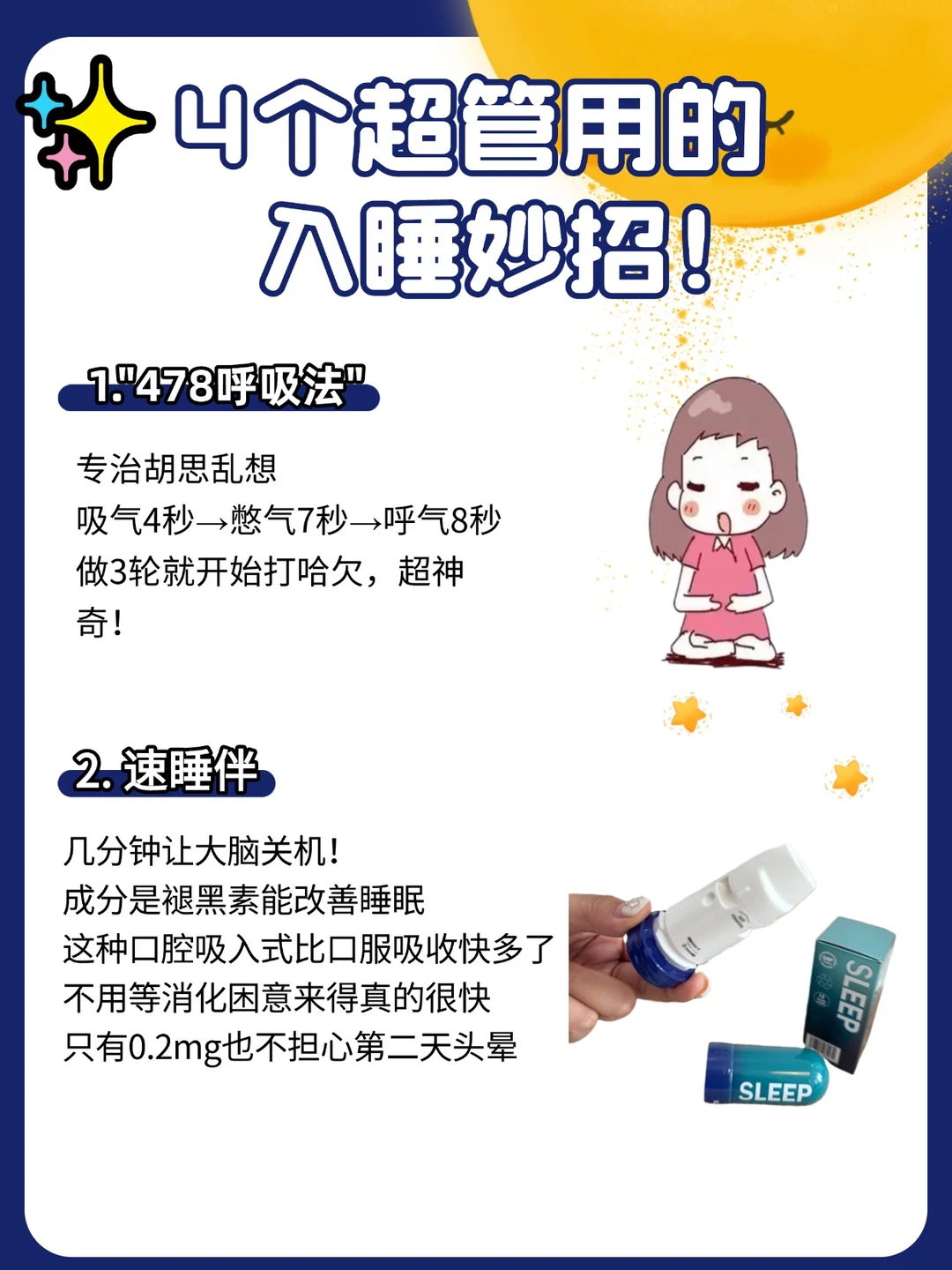😫姐妹们!睡不着觉的痛苦我太懂了!白天没精神,晚上睡不着 越想睡越睡不着!越睡不着越焦虑,眼睛酸到流泪但脑子就是不肯关机...😖 第二天整个人都昏昏沉沉的 我曾经也是这样‼️ 数羊数到羊都移民了,喝牛奶喝到半夜跑厕所... 💖所以作为资深夜猫子,我亲测出4个超管用的入睡妙招! 特别是第2个,现在我家/办公室/行李箱都备着! 1⃣"478呼吸法"专治胡思乱想 吸气4秒→憋气7秒→呼气8秒 做3轮就开始打哈欠,超神奇! 2️⃣ 速睡伴吸一吸,5分钟眼皮打架 🌟 这个小罐子是我的续命法宝!一般工作或者在外面玩到太晚,睡觉时大脑很兴奋,或者第二天我有事情需要早睡的时候,我就会用它帮我应急入睡。它里面只有褪黑素和微量乳糖,配料表超干净! 👉 口腔深吸,几分钟困意涌上来 👉 比口服褪黑素快多了,不用等消化。 👉 放枕头边,半夜醒了随手就能用! 现在出差我都带上它才安心!再也不怕在外面认床睡不好了 3⃣ 睡前1小时泡脚+足贴 水温40度泡20分钟,贴个艾草足贴 脚暖暖的超级容易入睡! 4⃣白噪音睡眠法 下雨声/海浪声循环播放 注意力被声音带着走就不会乱想了 [色色R][色色R][大笑R][大笑R]现在的我: 泡完脚→吸两口速睡伴→听白噪音... 经常还没听到第3首歌就睡着了! 睡饱了皮肤都在发光✨ 睡眠不好的姐妹一定要试试速睡伴 小小一罐能用超久,家里备着超安心!