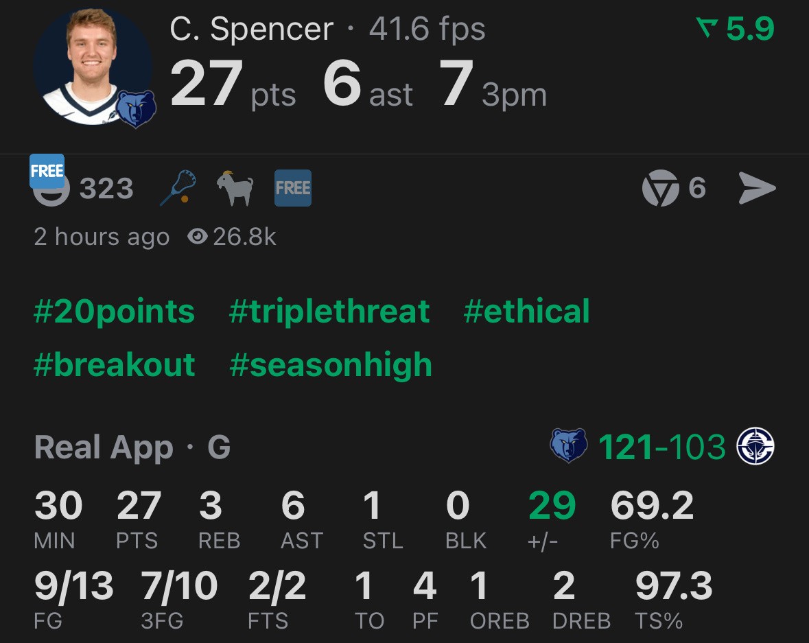 弟弟斯潘塞各位也认识一下,比勇士那个哥哥厉害。今天面对快船27分生涯新高,三分10中7(命中数生涯新高)。过去两战他合计47分,三分16中13...这场过后,斯潘塞本赛季三分命中率来到50.8%,100+出手球员里联盟第一!灰熊vs快船NBA
