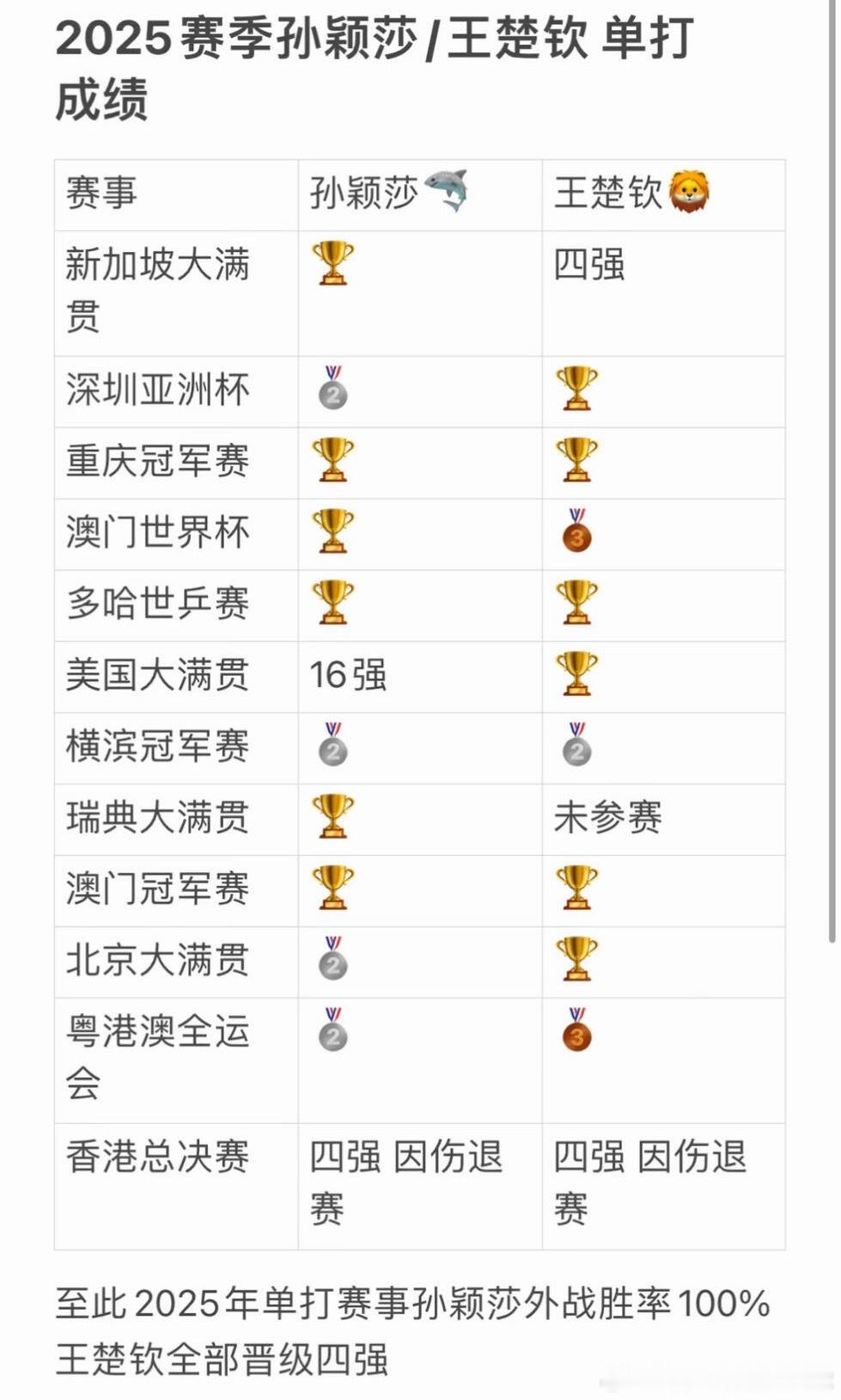 2025赛季 | 孙颖莎王楚钦单打成绩至此2025年孙颖莎单打成绩外战胜率100%🏆王楚钦全部进入到四强!你们是大家最好的榜样!一路走来辛苦了哥姐!乒出精彩
