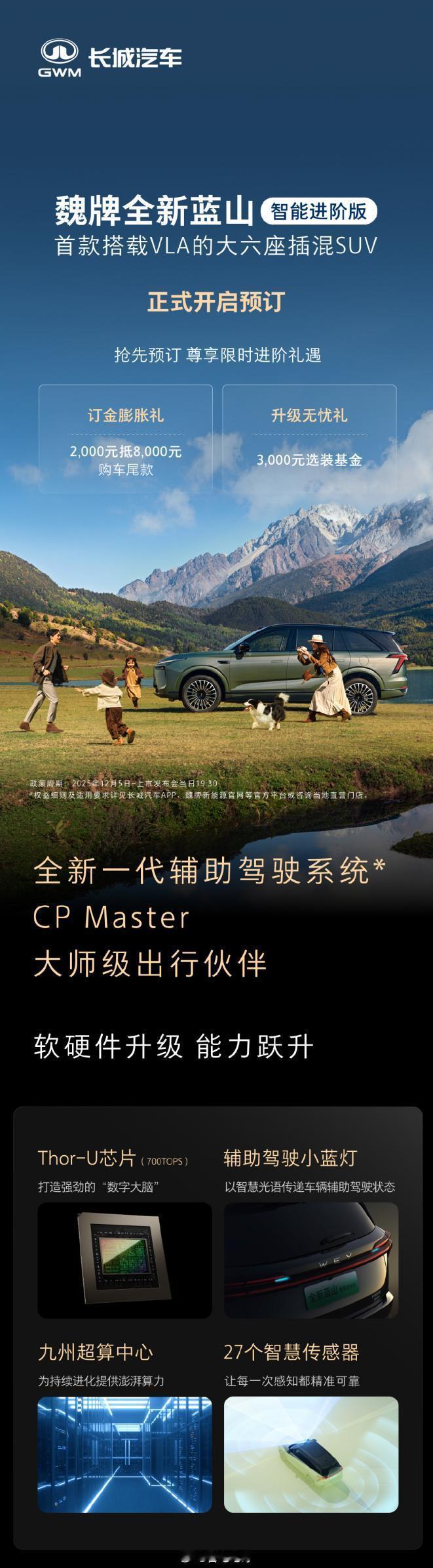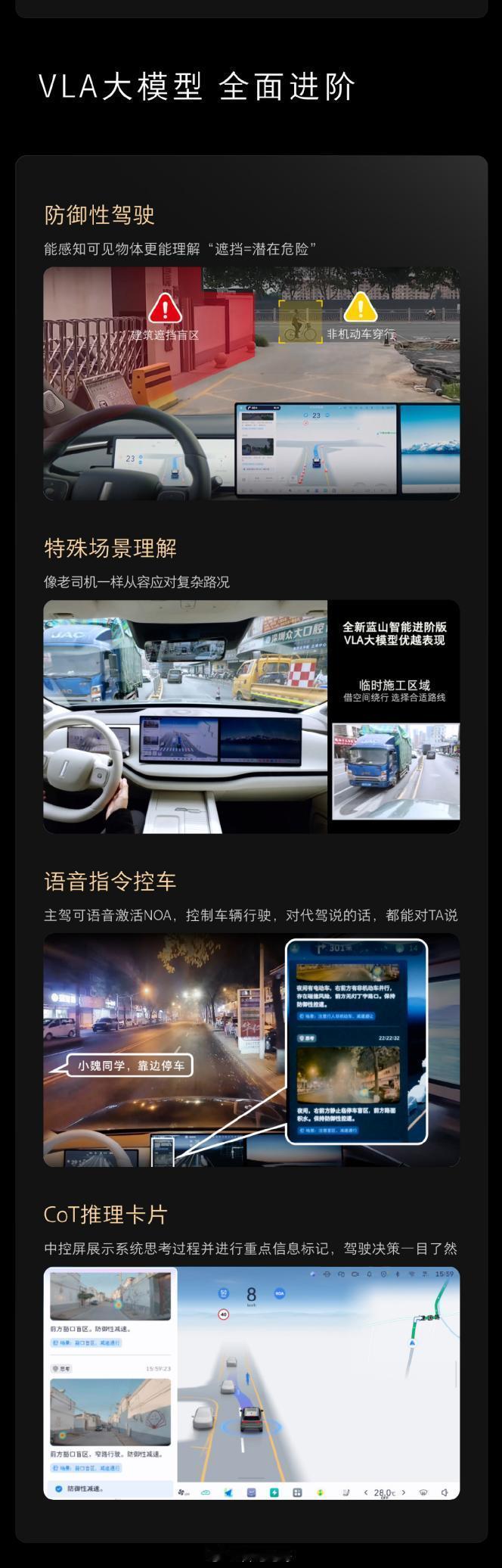 魏牌全新蓝山智能进阶版12月22日上市,首发搭载长城汽车的VLA大模型,而且配备了智驾时候开启的“小蓝灯”。采用了全新一代辅助驾驶系统CP Master 大师级出行伙伴。该系统有个挺有意思的能力,就是可以“预瞄”开启智驾之后,可以提前预判一些潜在的危险,并且会理解特殊的场景,比如施工路段封闭,车辆还会借道行驶或者选其他路线。非常期待上路实际情况的表现~魏牌蓝山智驾版魏牌蓝山