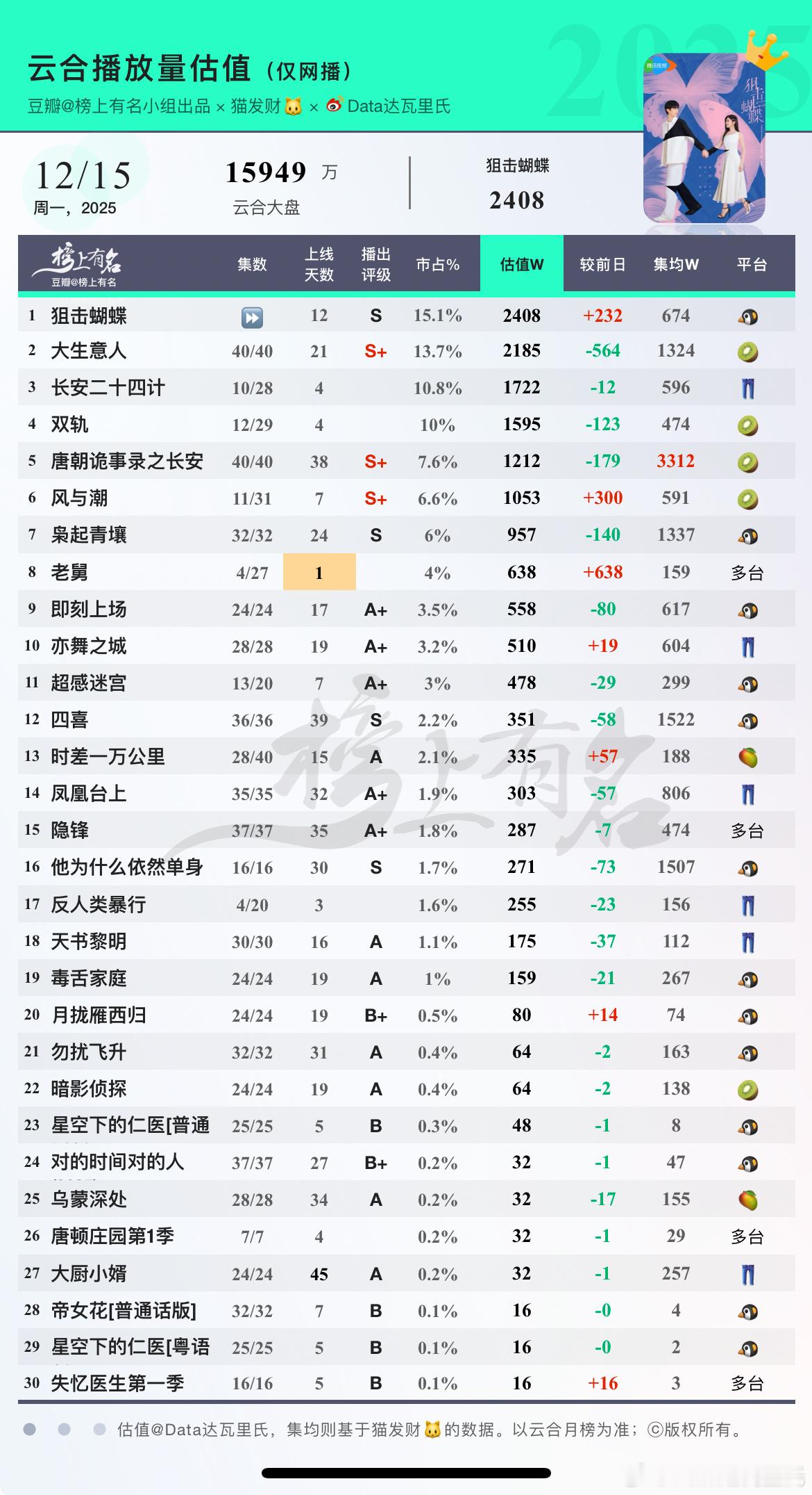 12.15云合估值,🌴豆瓣榜上有名小组出品1 狙击蝴蝶 超点完结云合登顶 ⏩ 2408 +232 集均6742 大生意人 降超500万 3 长安二十四计 横盘微降 1722 -12 4 双轨 降超100万 1595 -123 5 唐朝诡事录之长安 集均破3300万 33126 风与潮 云合播放评级升至S+ 1053 +300 7 枭起青壤 8 老舅 首播 638 9 即刻上场 10 亦舞之城 11 超感迷宫 12 四喜 13 时差一万公里 14 凤凰台上 15 隐锋 16 他为什么依然单身 17 反人类暴行 18 天书黎明 19 毒舌家庭 20 月拢雁西归 岑矜李雾寿终正寝