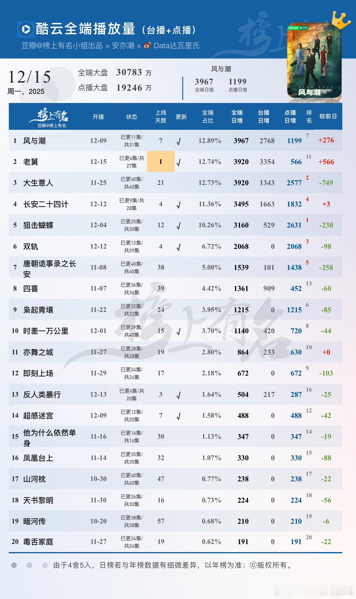 12.15酷云播放量🌴豆瓣榜上有名小组出品1 风与潮 酷云全端日冠 3967 点播1199 +2762 老舅 首播 全端3920, 点播566 3 大生意人 3920 2577 -7494 长安二十四计 横盘 3495 1832 +35 狙击蝴蝶 超点 3160 2631 -2306 双轨 微降 2068 -987 唐朝诡事录之长安 1539 1438 -2588 四喜 1361 452 -609 枭起青壤 1215 -8510 时差一万公里 1140 720 -4411 亦舞之城 12 即刻上场 13 反人类暴行 14 超感迷宫 15 他为什么依然单身 16 凤凰台上 17 山河枕 18 天书黎明 19 暗河传 20 毒舌家庭 成毅 求求你们再看一会吧