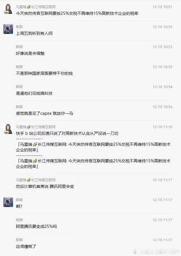 今天传中国将调整高新技术企业认定条件,平台型互联网企业不认定为高新技术企业,不再适用15%优惠税率,以后将按25%企业所得税缴税。在目前的讨论稿中,确实有针对“平台型企业”和“仅拥有软著的企业”的严格限制。核心逻辑是打击那些“伪科技”企业——即只有商业模式创新(平台模式),而缺乏核心硬科技(如发明专利、芯片、新材料等)的企业。但其实不少互联网平台是有造芯片的呀。但有首席言之凿凿地说腾讯阿里都要加到25%,所以市场很恐慌,就下跌了。但阿里又表示,部分实体按15%税率计算,其他大部分已经按25%计算,那意思就是利空早就计提了。综合以上信息,我结论是:这些互联网平台旗下的实体,其实已经部分已经被认定为高新技术企业按15%税率,其余大部分按25%税率。也就是税率利空早就大部分兑现,利空程度并没有市场一开始以为的那么大。这应该是信息差造成的误解。