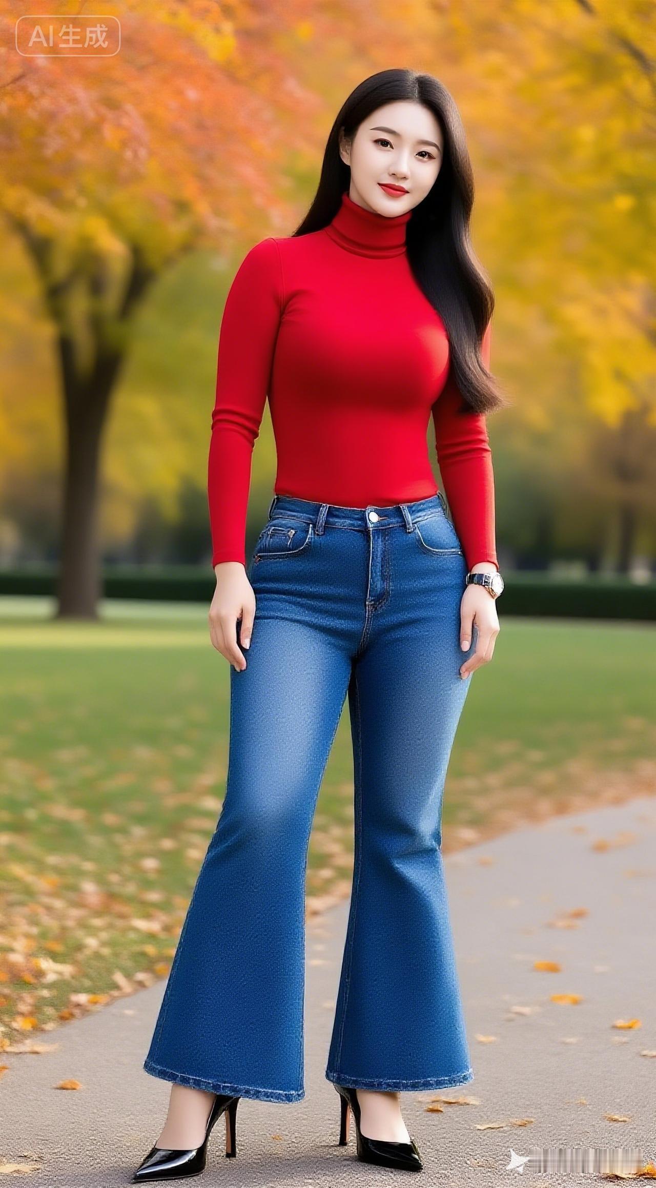 秋日穿搭指南:红色高领衫+蓝色喇叭裤,时尚又保暖!🍂👗👠