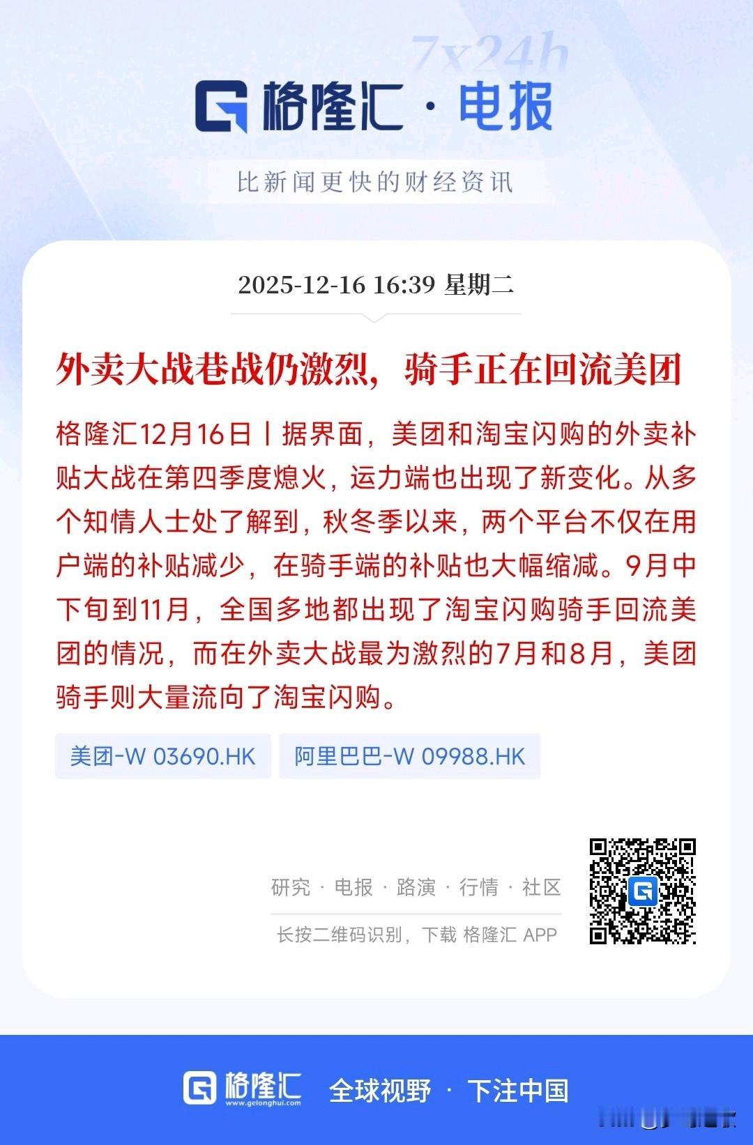 外卖大战的赢家快要出现了,事实证明还是单多才管用 现在的情况是京东和淘宝闪购的外卖员单少但是补贴多,福利也好。而美团的单多补贴少,而且福利也相对较少。 但是当补贴的金额一下来之后,就体现出单多的优势了,作为外卖员就是挣钱的,补贴再多没有单也是白搭,所以美团的外卖员正在增多。 现在很多外卖员都是三个平台都跑,但是抢单就成了问题,这样发展最后肯定会有一家外卖平台被淘汰的,现在就看谁能耗得起了。