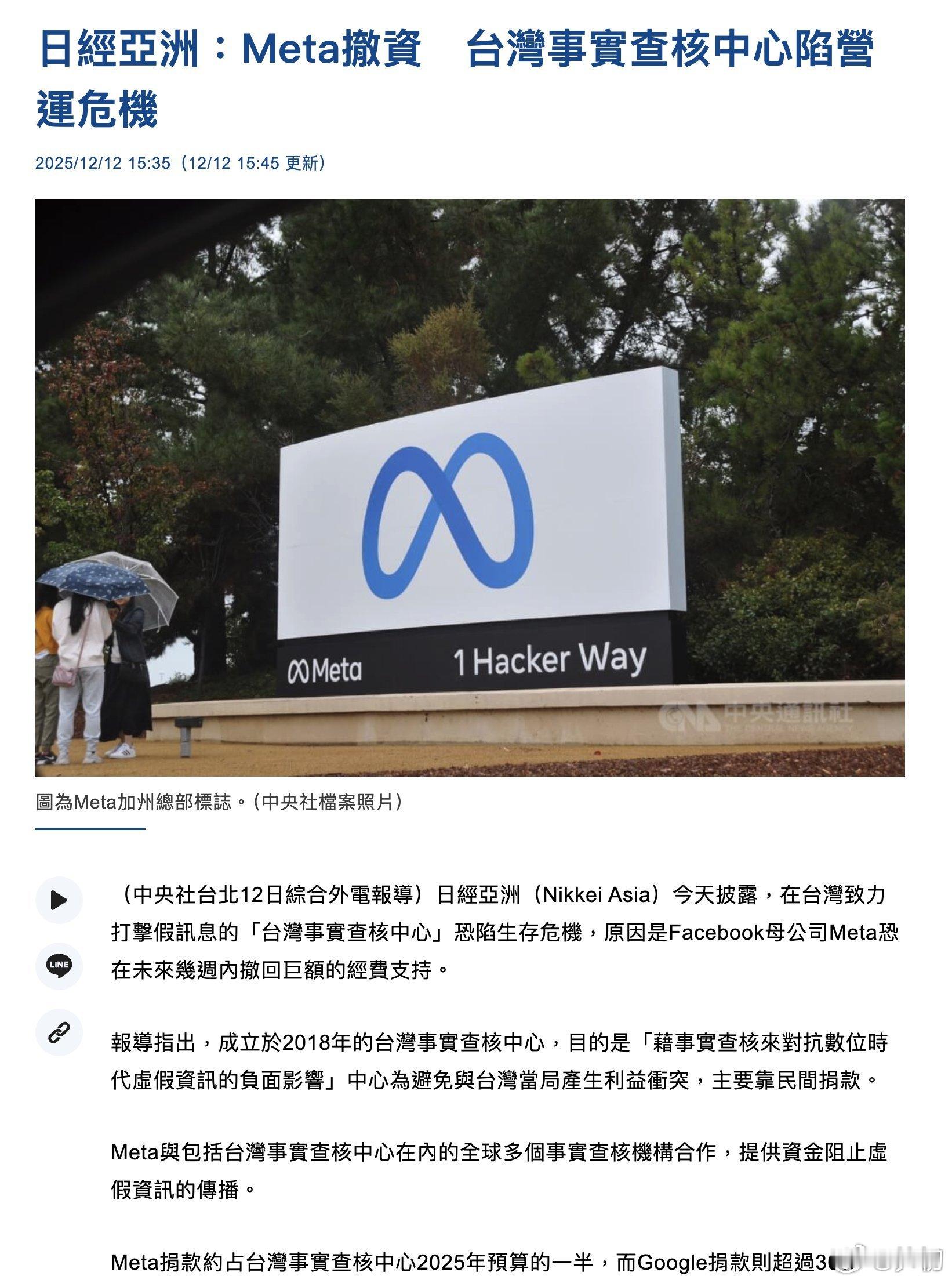 日经亚洲(Nikkei Asia) :在台湾致力打击假讯息的「台湾事实查核中心」恐陷生存危机,原因是Facebook母公司Meta恐在未来几周内撤回巨额的经费支持。Meta捐款约占台湾事实查核中心2025年预算的一半,而Google捐款则超过30%。事实上,绝大部分外网平台和西方媒体的中文内容采集和编审人员都是来自港台,其中的绝大部分都是对中国充满敌意和仇视的货色,这也是在外网和西方媒体几乎都是铺天盖地造谣抹黑中国新闻和内容的主要原因。这些人长着中国脸说着中文,进入中国进行采访工作有着天然的便利,很多时候中国人对他们也没有戒心。世界上绝大多数造谣抹黑中国的假新闻都是出自于它们之手,剩余的几乎都出自于中国自己培养输送给西方的“媒体人”。