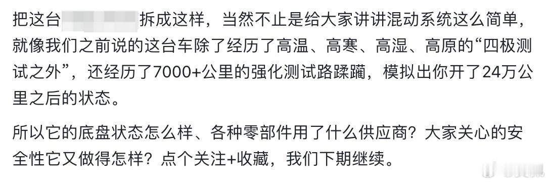 准备了一早上,准备开拆一台插混大SUV,经过7000公里强化坏路测试(模拟出开了24万公里之后的状态)的国产车,看看各部件用料和质量怎么样。问问你,拆车你最喜欢看哪个部分?后面发视频。