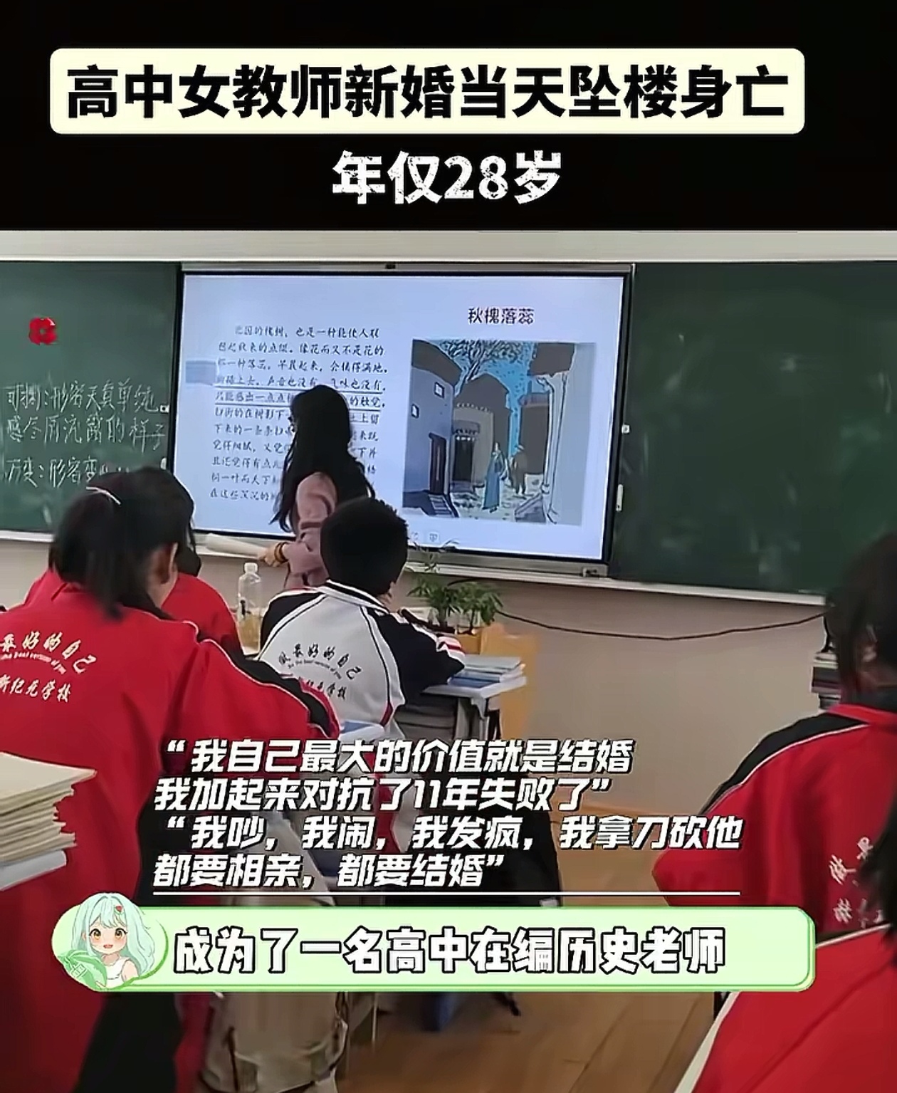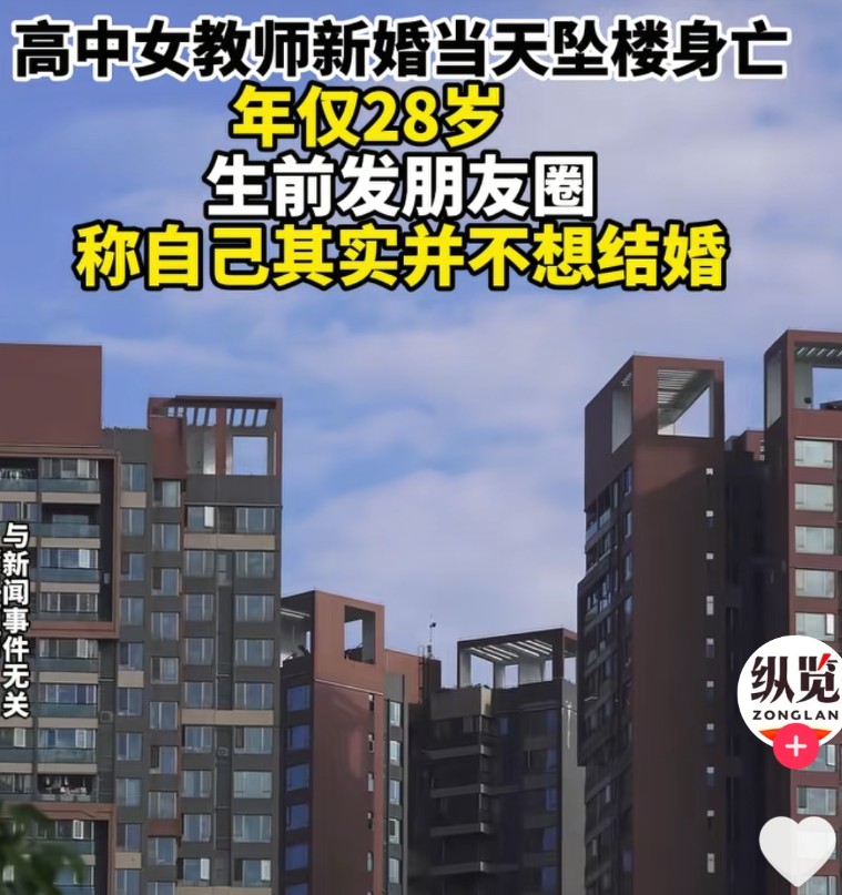 28岁高中女教师选择新婚当天坠亡。 只能说愚昧无知的父母亲害死了自己懦弱善良的受过高等教育的女儿,在现今社会婚姻不是生活的唯一。 希望此事例能给那些固执己见的为人父母以启示! 充斥着封建思想的家庭,与一群思想被传统束缚的人生活在一起,也很难生长出强大的精神力量。