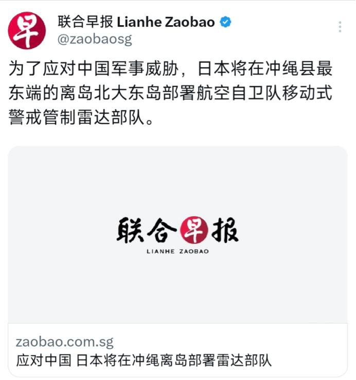 12月16日,新加坡联合早报发布:“为了应对中国军事威胁,日本将在冲绳县最东端的离岛北大东岛部署航空自卫队移动式警戒管制雷达部队。” 说白了,日本这次又是拿个中国的“军事威胁”当幌子,侵犯中国的权益。 要知道,最近中国这几日,一直在西太平洋附近军事演练,而日本这一次显然也是将雷达部署在了那边方向上,并且这次的目的并不单纯是为了防止中国的“军事威胁”,而更像是来窥探中国训练的。之前悄悄地派飞机侦查,这次直接来明的部署上了雷达,简直过分。 说实话,如果中国真的想对日本做点什么,根本就不会公开训练计划和飞行次数,也不会多次给日本挑衅的机会,虽然中国秉持着和平为核心的理念,但是不代表中国会放任自己的利益被侵犯。如若日本真要一条路走到黑,继续逼着中国采取措施,那是日本连后悔的机会估计都不会有。 说到底,公海不是日本可以肆意妄为的“后花园”,而是有明确规定,不允许搞针对“监控”的共同空间,中国已经有过多次忍让,如果日本一再得寸进尺,必然会付出惨重的代价。