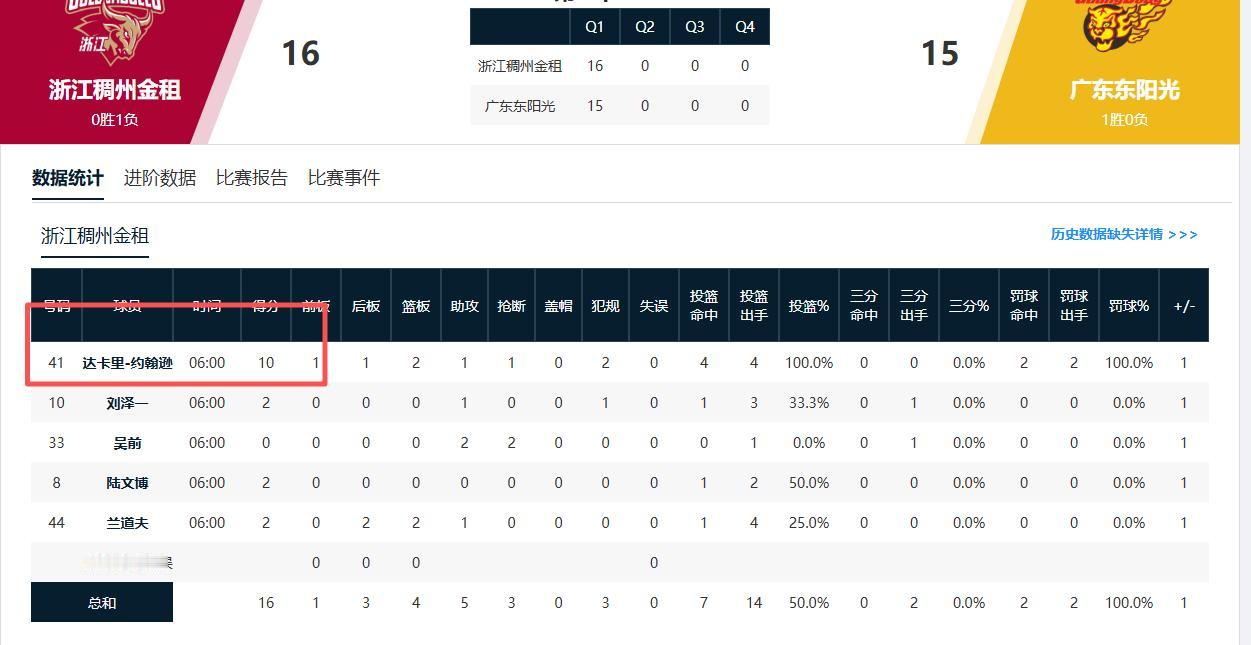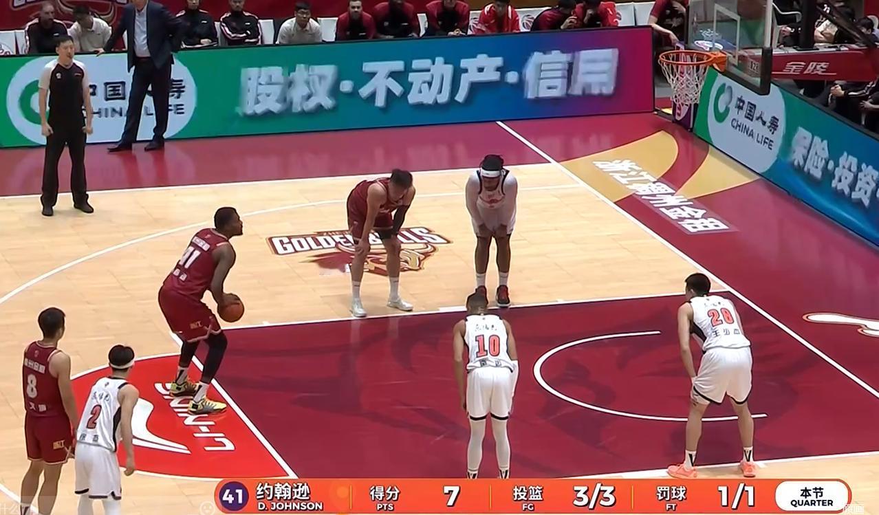 广东队打同曦队的时候广东队的两个内线球员王少杰和焦泊乔先后因为5犯被罚下后,现在全联盟都知道广东队的内线弱,浙江稠州队打广东队在开场也坚决攻广东队的内线,效果很不错。 开场不到半节浙江稠州队已经靠大外援约翰逊在低位和内线拿了全队大部分的分数。
