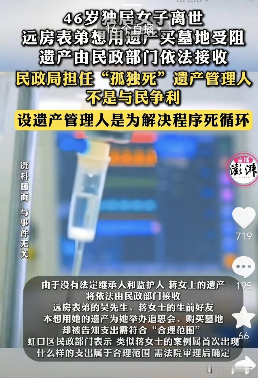 亲属想用遗产买墓地却受阻,继承权利与义务咋统一? 46岁独居女子蒋某离世,没配偶、没子女、父母也去世,只剩远房表弟和生前好友。今年10月她突发脑出血昏迷,医院要家属签字,表弟吴先生和公司一起垫了3万医疗费。 问题来了:表弟和好友想用她的遗产办追思会、买墓地,却被告知支出得在“合理范围”内,而虹口区民政表示,这类无主遗产案例首次出现,啥叫“合理”得法院先审。 这事儿又有一个关键问题:继承遗产时,权利和义务得绑在一起!要钱时找亲属垫钱,那继承遗产后,丧葬、追思这些事儿也该由继承人承担。设立遗产管理人不是跟民争利,而是为了把“谁继承谁负责”的规矩立清楚,别让遗产成了没人管、却谁都想争的“糊涂账”。