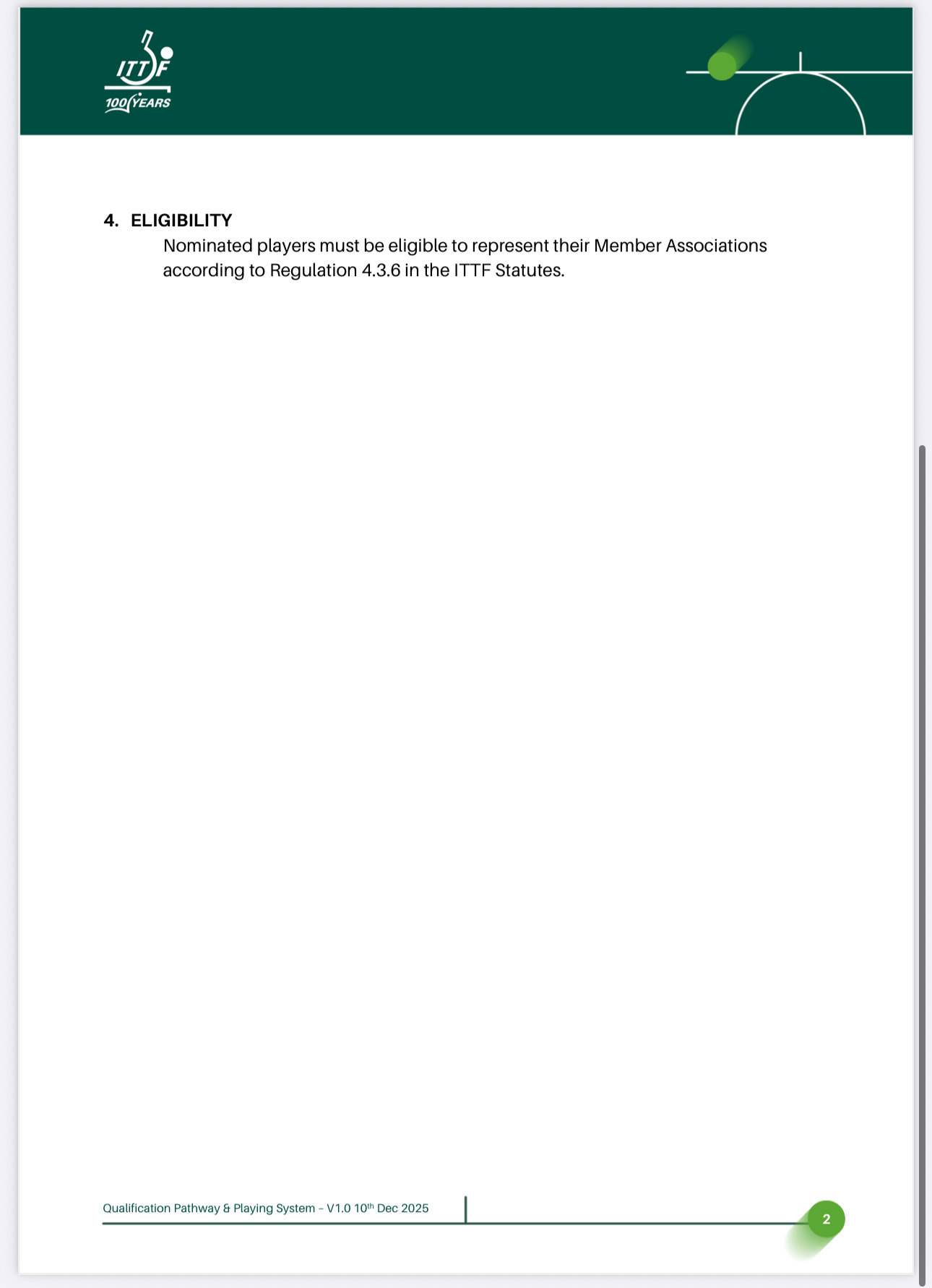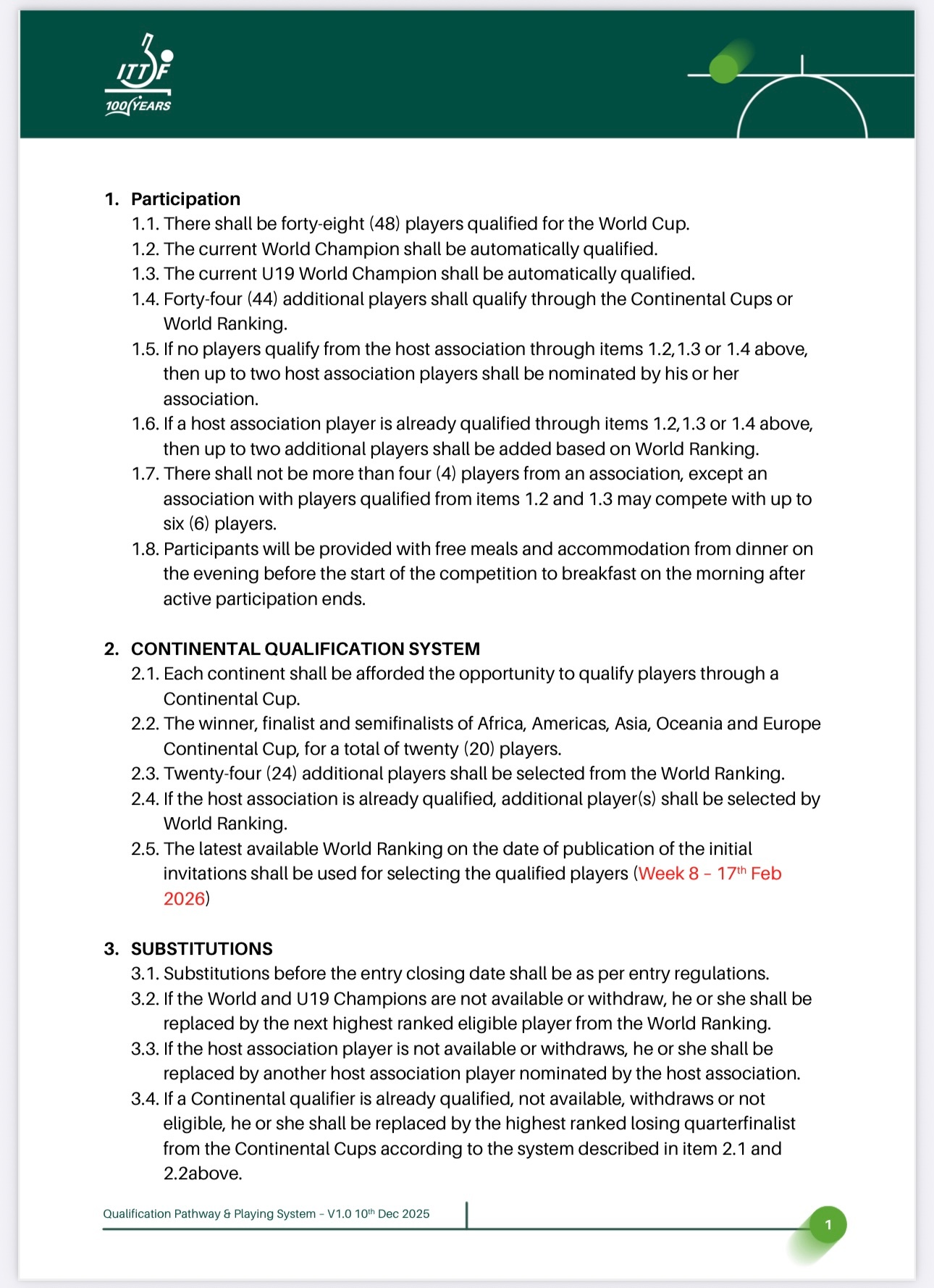 2026澳门男子及女子世界杯资格途径【名额分配】1、男、女各48名球员参赛;2、最新世锦赛单打冠军自动获得资格;3、最新U19世青赛冠军自动获得资格;4、44个名额将通过大洲杯赛、世界排名产生;5、如果没有东道主球员通过上述方式获得资格,最多2名东道主球员可获得东道主提名;6、如果东道主球员已经通过上述方式获得资格,将最多增加2个世界排名名额;7、协会限4人参赛,世锦赛冠军、U19世青赛冠军不在协会人数限制内。【大洲资格制度】1、亚洲杯、欧洲杯、非洲杯、美洲杯、大洋洲杯的【四强】,共20名球员获得大洲资格;2、24个世排名额;3、如果东道主球员已经获得资格,东道主提名名额将分配给世排名额;4、世排名额以2026年2月17日(第8周)世排为依据;【替换规则】1、如果世锦赛冠军、U19世青冠军名额球员退出,则该名额将归为世排名额;2、如果东道主提名球员退出,该名额将由另一个东道主提名球员替代;3、如果大洲资格球员退出,该名额将顺延给大洲杯赛8强中排名最高的球员。根据ITTF章程第4.3.6条,被提名的球员必须有资格代表其成员协会。