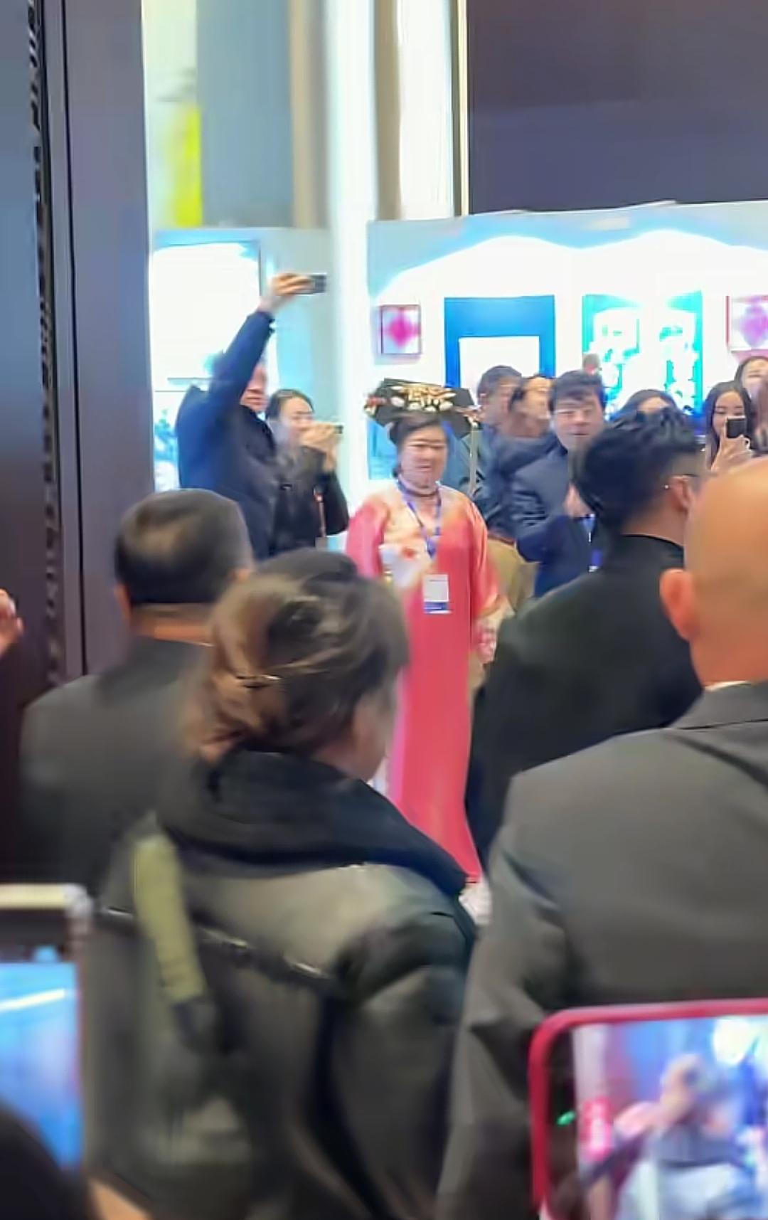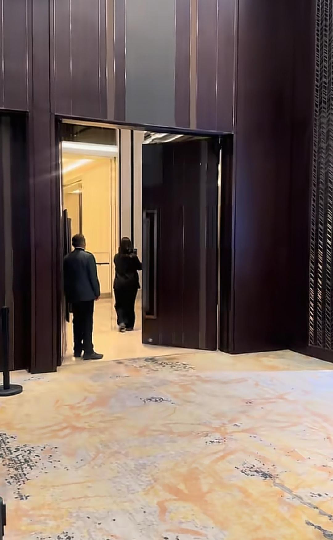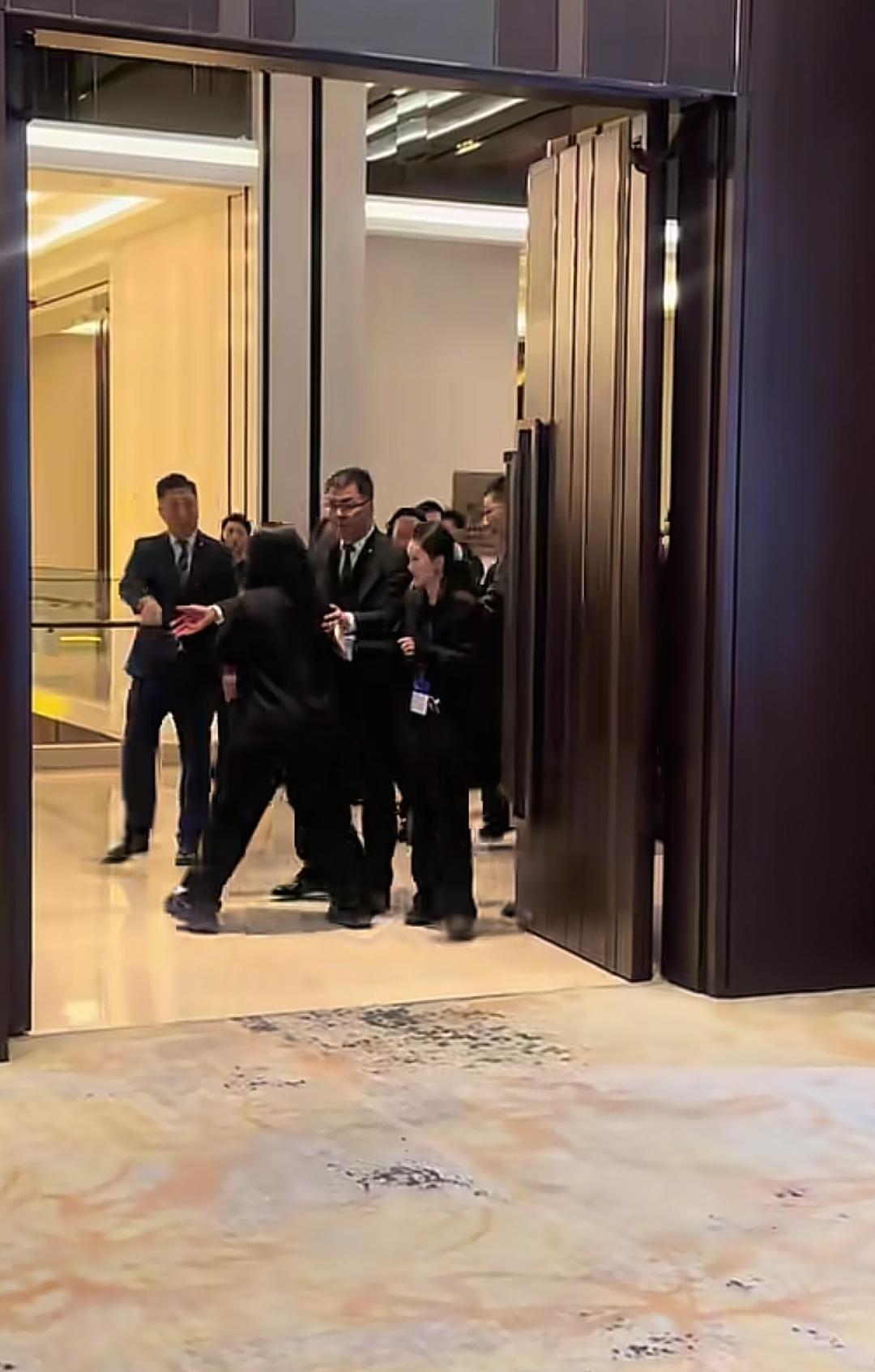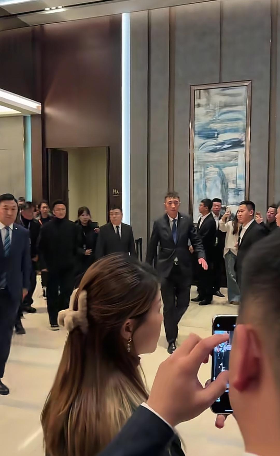 谢霆锋现身世界旅游经济论坛现场,入场仪式看起来很隆重,有两名安保工作人员在前面带道。 在进入会议室的时候,有工作人员专门负责开门,不少在场的工作人员感到惊讶,立马起身拿着手机拍照。 后面跟随了很多工作人员,有一位穿着黑色羽绒服的女士在谢霆锋的身旁,用手挡住,防止有人过来贴近谢霆锋。