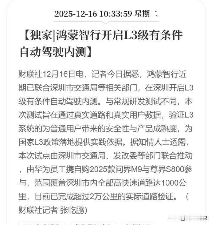 鸿蒙和小鹏拿到的L3牌照挺实用的,全市的高速和快速路都可以。北汽和长安那个限制就比较多,范围比较小。