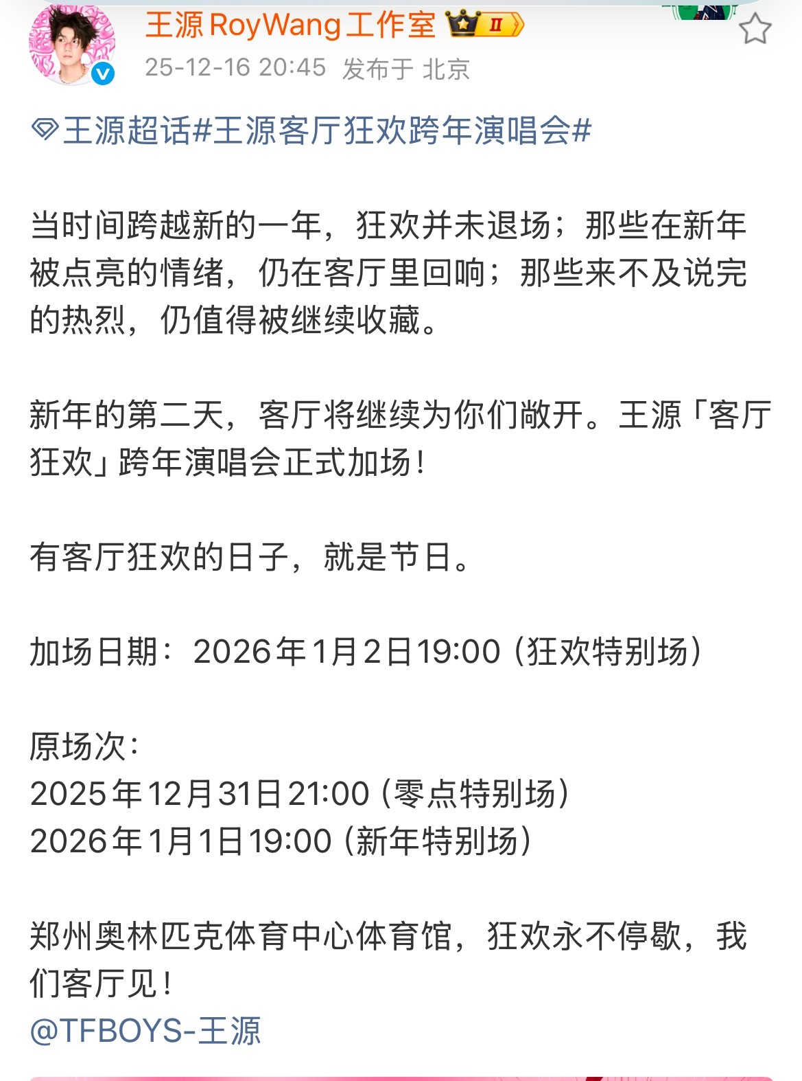 王源郑州跨年演唱会官宣加场 王源郑州跨年演唱会官宣加场!狂欢加倍,1月2日继续狂