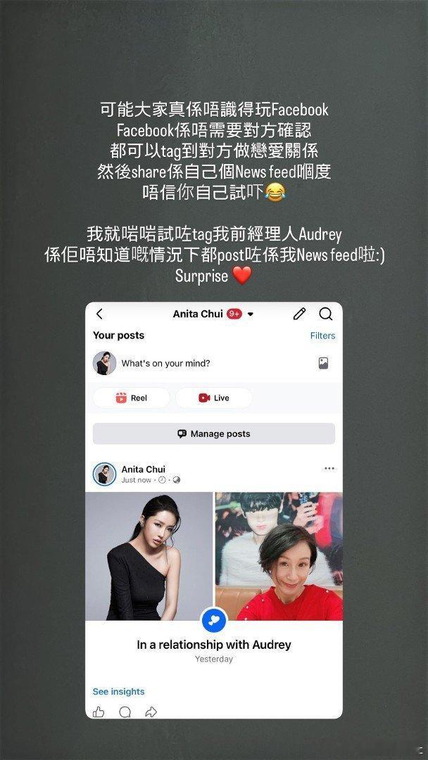 藝人崔碧珈最近被爆新戀情,近日她在社交網分享跟58歲「大隻Rocky」鄭健樂的做Gym合照,Rocky更於社交網個人狀況標註了崔碧珈並寫明跟對方戀愛中。但前日(14日)她在出席活動時,卻強調自己單身,表示「瞓醒先知道呢件事」,又指二人只是很好的朋友關係,但就給予對方很高評價:「認識的人當中最高分的男人」、「我都好單純,佢比我更單純」。網民對於呢段閃電戀情議論紛紛,有人表示社交網的感情狀況更新是需要另一方確認,質疑崔碧珈早已知情。對此,崔碧珈昨日進行實測澄清,將其社交網的情感狀況更改為與前經理人「交往中」。而今日她再度發文稱社交網的感情狀況設置,毋須雙方確認:「係唔需要對方確認,都可以Tag到對方做戀愛關係,然後Share喺自己個News feed度,唔信你自己試吓。我就啱啱試咗Tag我前經理人Audrey,係佢唔知道嘅情況下都Post咗係我News feed啦!Surprise。」不少網民見狀都到Rocky的認愛貼文留言安慰:「心痛Rocky哥1秒」、「支持你!加油唔好理其他人噏乜,最緊要自己開心」。