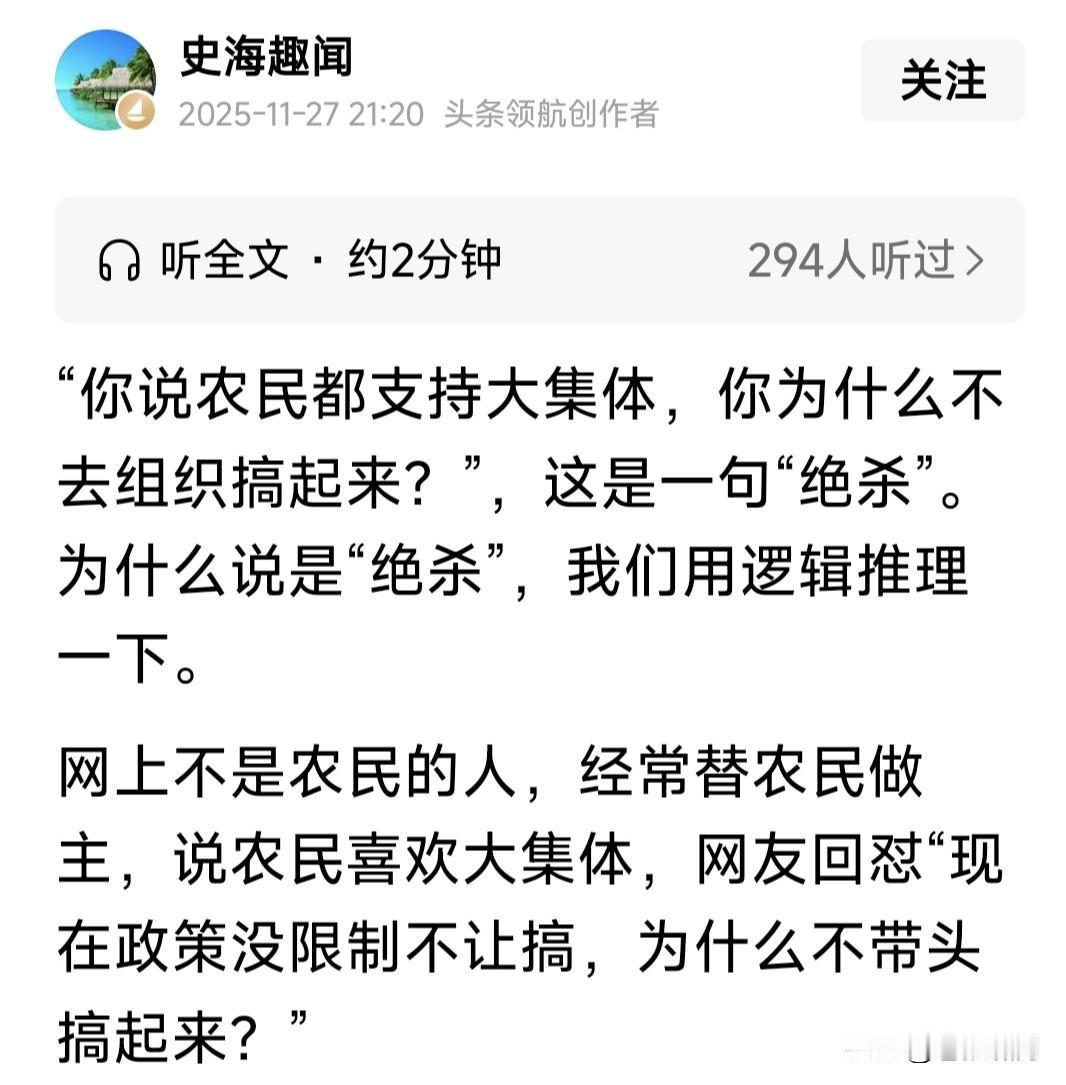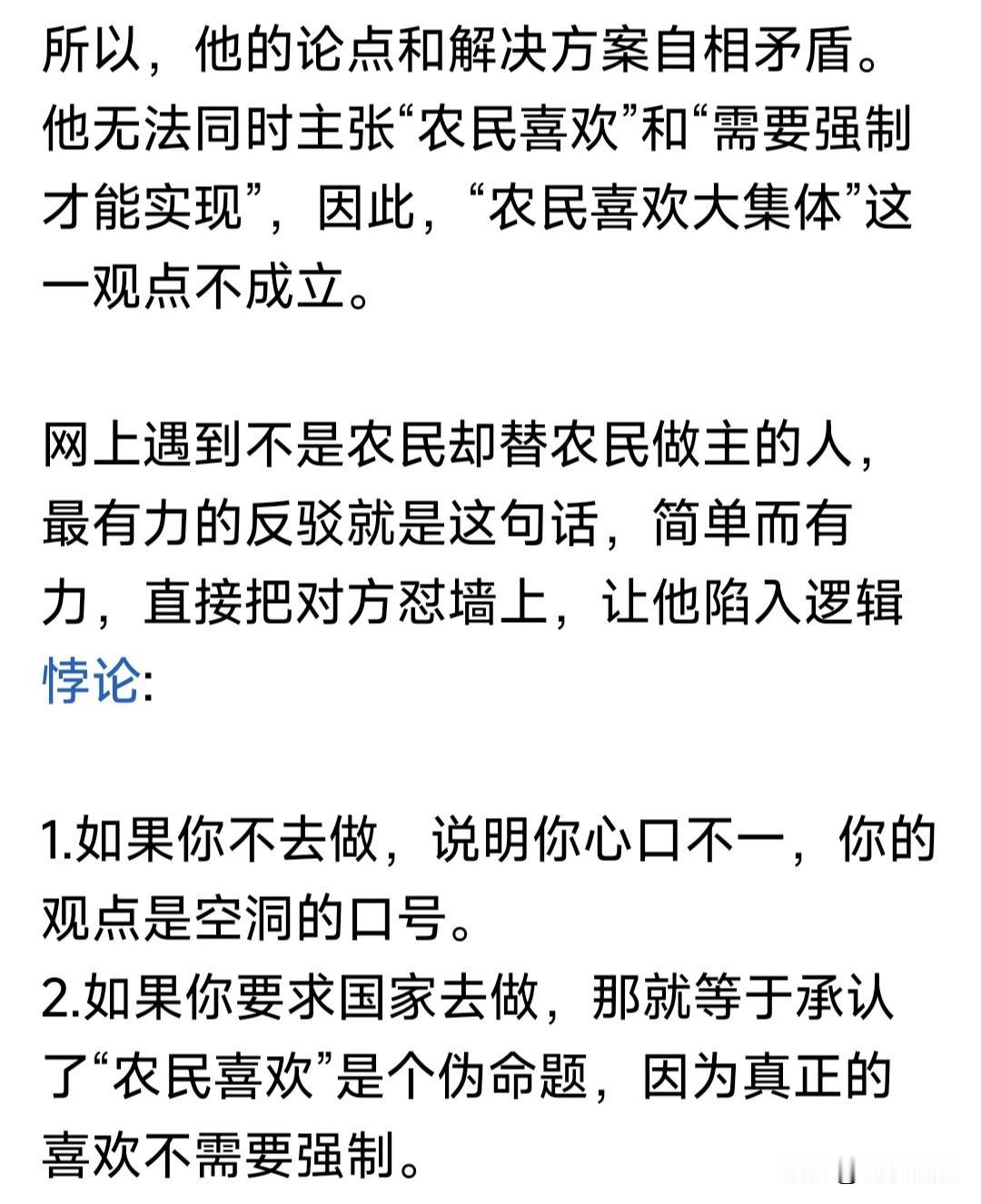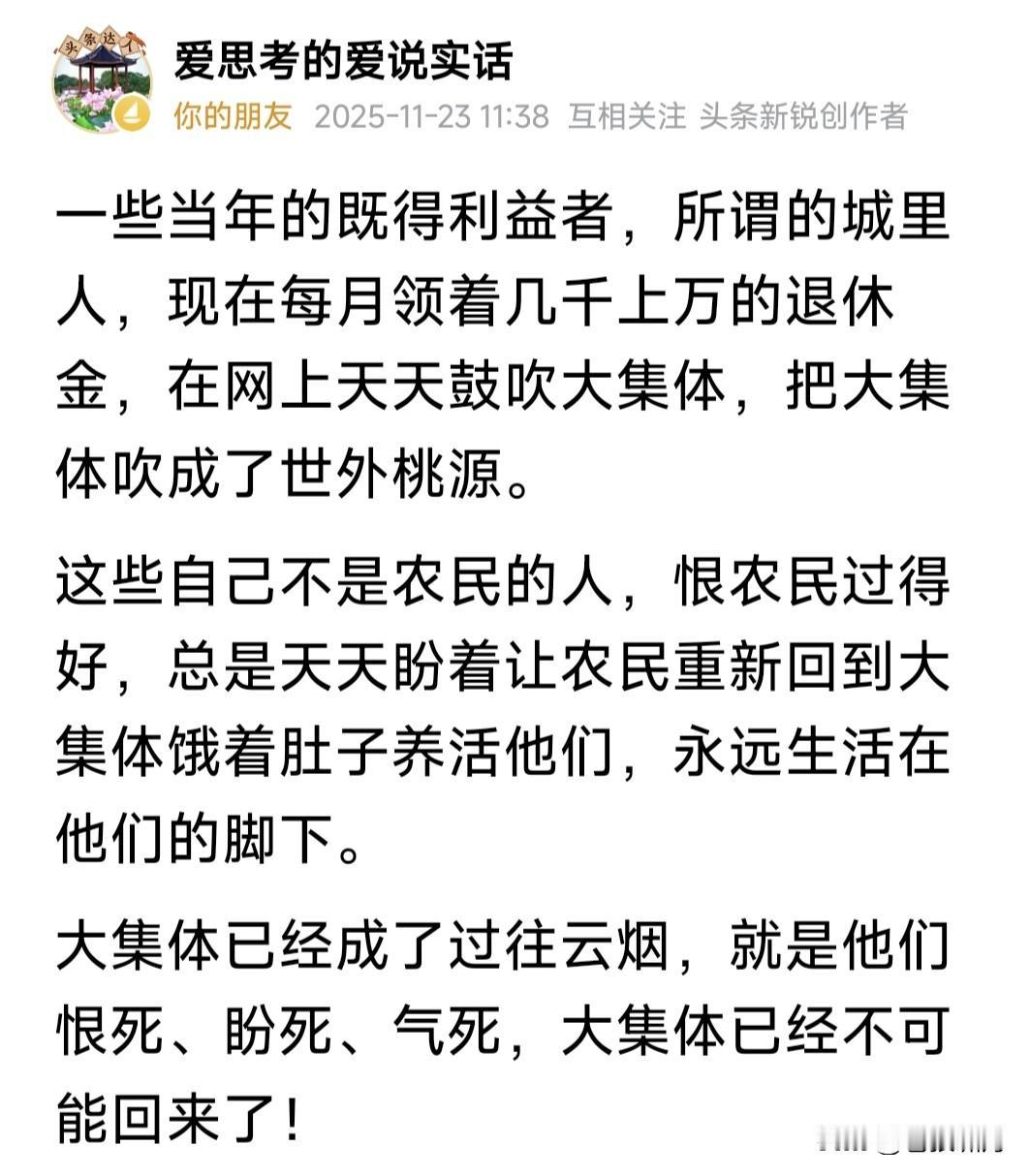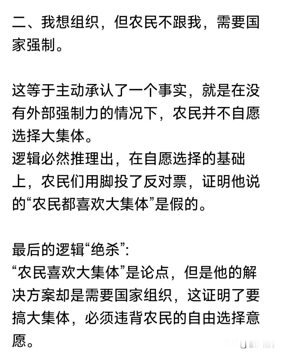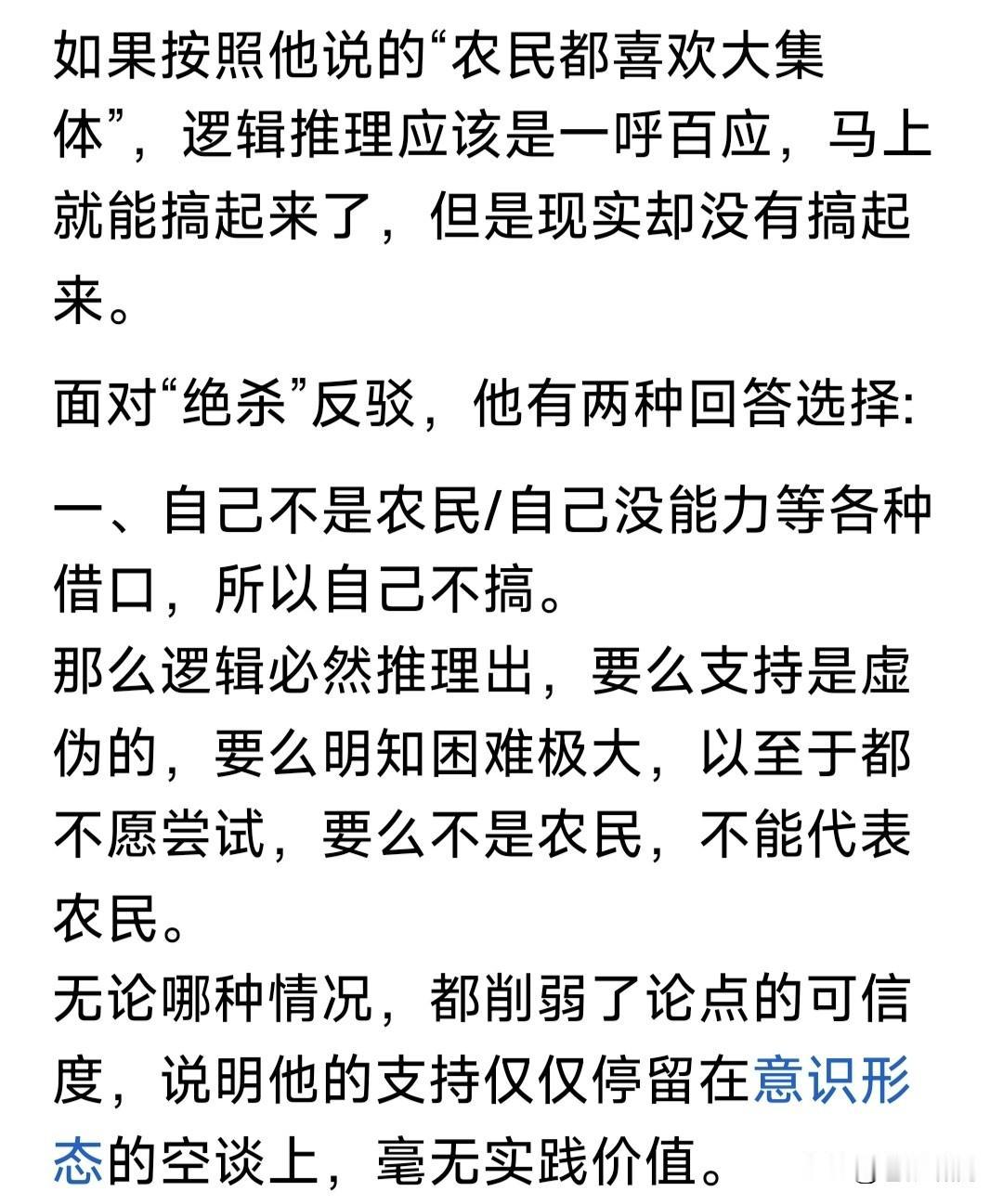 有人胡说八道:农民都支持大集体!有人怒斥:说这话的不是农民,而是每月领着几千上万退休工资,怀念大集体生活的那些当年“既得利益者”! 有网友直接了当回怼:你说农民都支持大集体,为啥不带头搞起来?政策不限制,谁都可以搞,既然农民都支持,还不一呼百应,一搞就成功了? 也有网友说:我不反对回到大集体,关键是农民同意吗?改革开放后实行土地承包,农民好不容易吃饱饭,再去搞大集体吃大锅饭,农民愿意吗? 本人是农村出身,了解农村改开前后的情况。觉得大集体与土地承包制,各有特点各有利弊。但总起来衡量,大集体弊大于利,承包制利大于弊! 大集体能集中力量办大事,但效率却不高,常年饿肚子。承包制激发积极性,效率提高了,产量上来了,农民都能吃饱饭,有本事还成了富裕户! 依个人之见,现在农村也有怀念大集体的人,但绝对是少数,大部分是不愿意回去的。那些说农民喜欢大集体的人,应该是吃饱了撑的胡说八道! 记得有个网红,曾聚集200多人,要在韶山搞集体农庄,过大集体生活。开始大张旗鼓轰轰烈烈,后来就偃旗息鼓不见消息了。为何销声匿迹了? 苍狼觉得这件事,要尊重农民朋友的意见!农民到底是支持大集体?还是喜欢现在土地承包?网上的农民网友最有发言权!你们说说自己的意见? …………