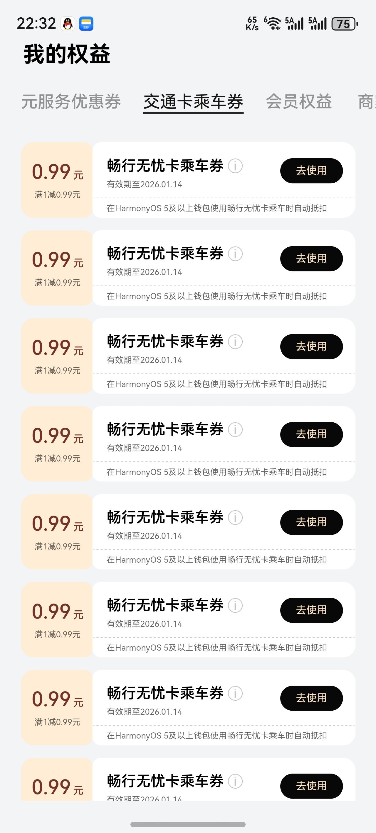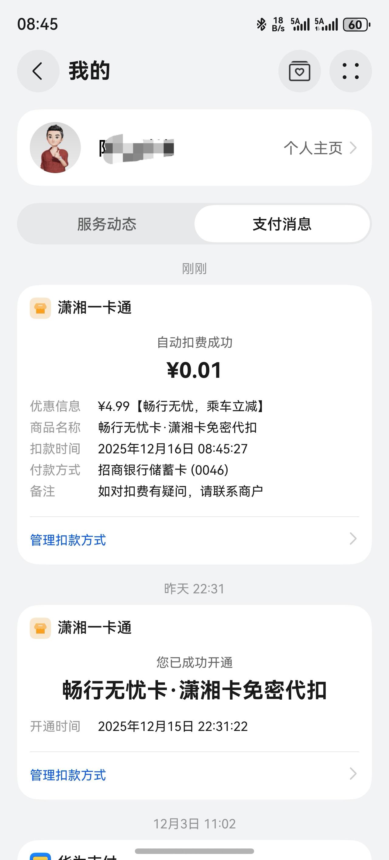 又来薅华为的羊毛了,承包我未来一个月的通勤费 先是送充100减5元的交通费,又免费开了张潇湘卡,还送了30张满1元减0.99元的交通券。首次刷卡乘车仅0.01元,后面30次都减0.99元,比用95折的本地深圳通卡还划算,而且预付款有50元额度,不用提前充值。用完30张交通券了,不想保留潇湘卡的话注销即可,没有额外费用。 入手了Mate80系列新机的用户,快去薅羊毛,别错过了! 科技快讯 华为Mate80