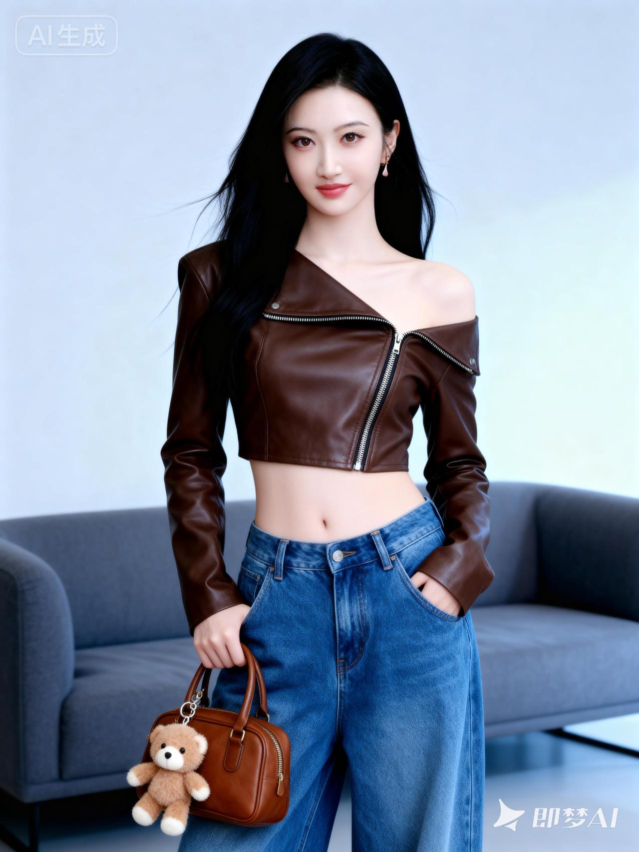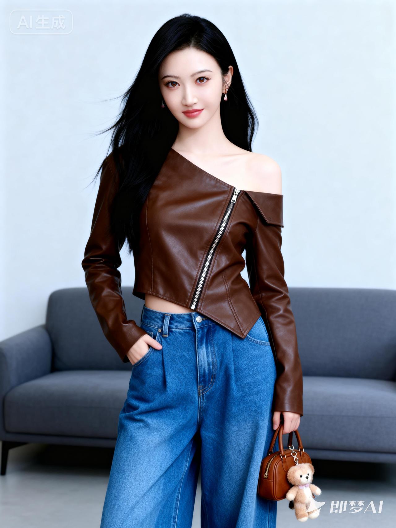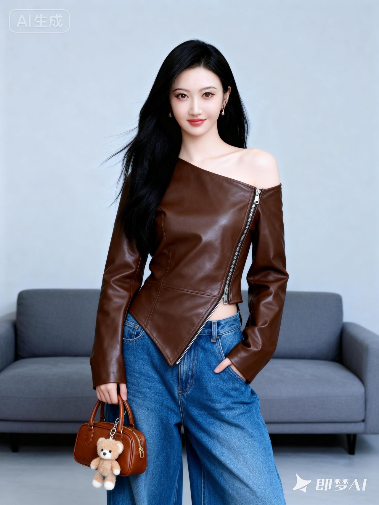 甜美少女风穿搭,棕色皮夹克搭配牛仔裤,可爱小熊包点缀!
