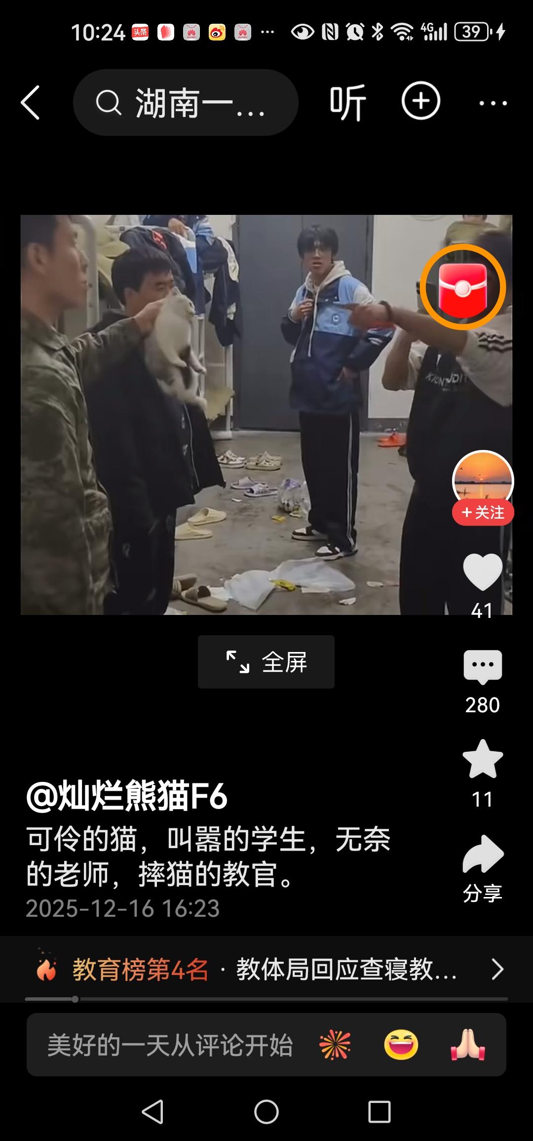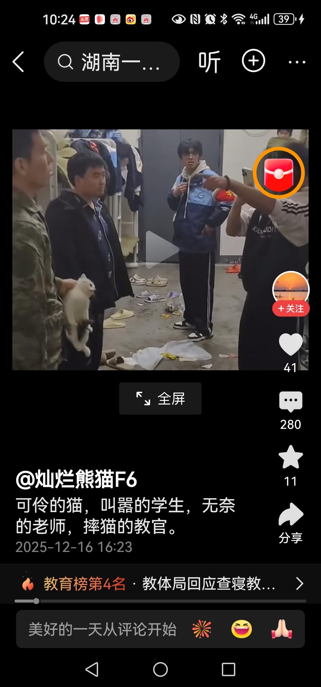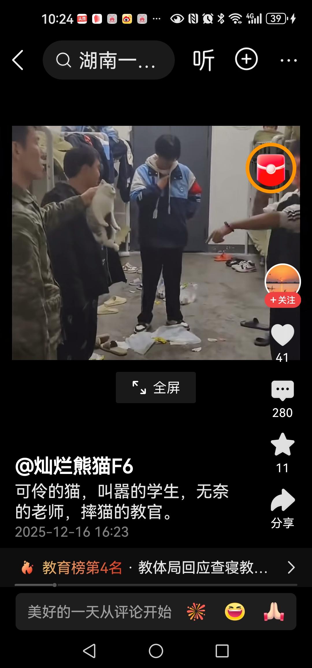 看这被激摔猫视频特心沉沉的重,这是教育悲哀。这是什么学校,什么学生? 一直激教官摔猫,结果结果最终猫被摔死,唉,可怜的猫,死都不明白“我做错什么了?” 教官最终没克制住,但再如何都不能摔猫的。 直接拿走猫交由校领导处理就好了,该开除就开除了。 国有国法,校有校规。 从这事看平时这学校的校规校纪教育是多么一塌糊涂。 这便是职业学校教育的失败,不仅仅是湖南湘西的一职业技术学校。