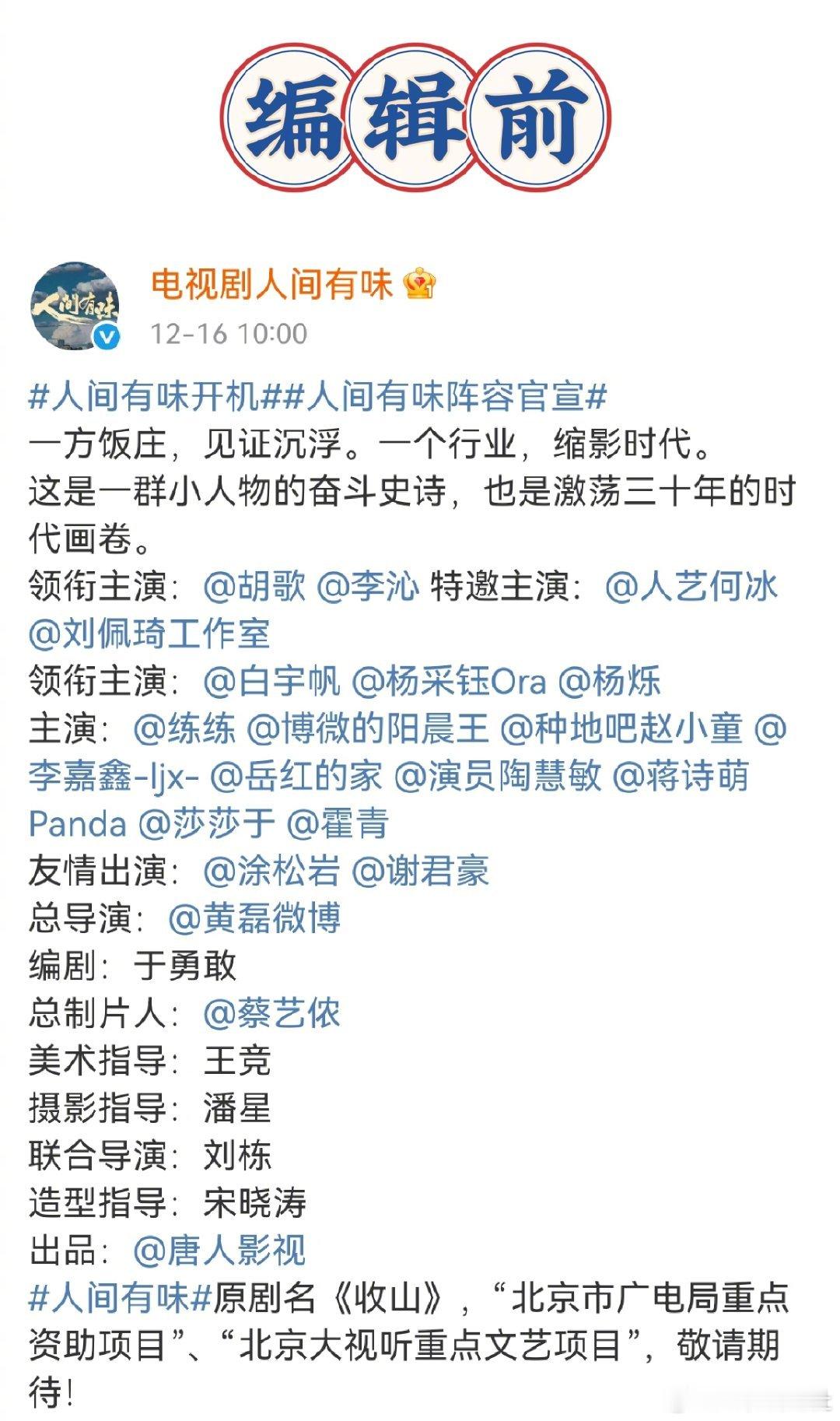 人间有味编辑人间有味编辑记录胡歌李沁新剧《人间有味》官宣阵容的编辑记录,你们内娱真的有番位癌诶!早晨刚夸了没有人在乎番位,下午就回车了……