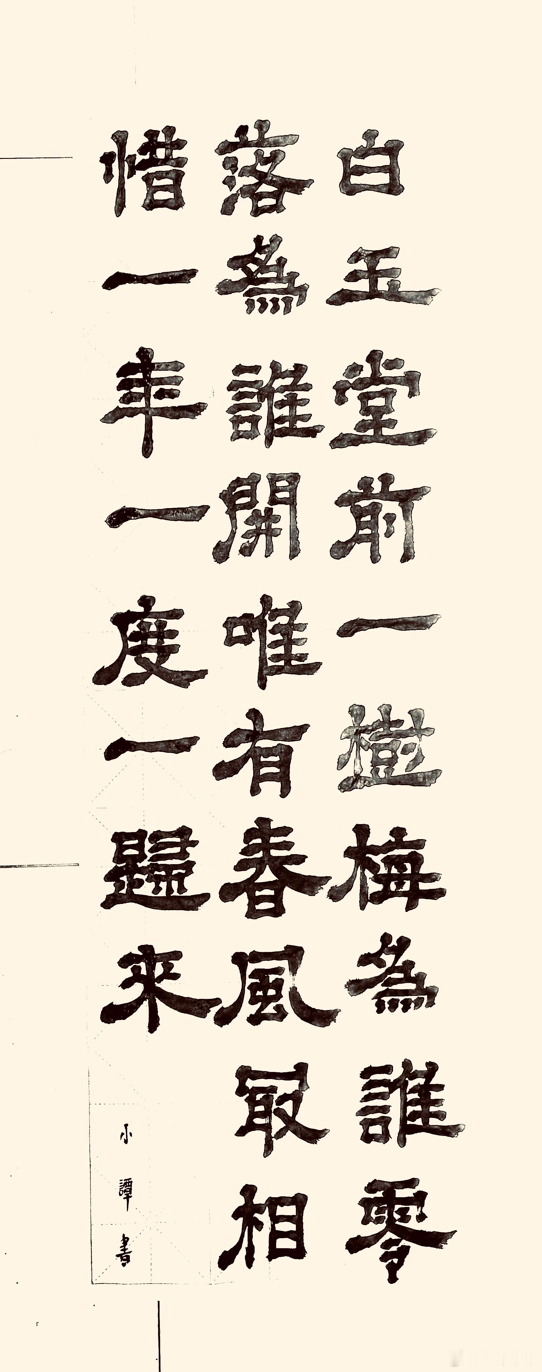 书法 梅花(宋.王安石)白玉堂前一树梅,为谁零落为谁开。唯有春风最相惜,一年一度一归来。《梅花》是一首七言绝句。此诗首联便设下了一个清雅的场景,既衬托出梅花的非凡气质,也为其后的情感抒发铺垫了基础;颔联这一问,如同在问每一个观赏者,也如同在问梅花自己;颈联突然转折,将春风引入画面;尾联既是对春风的描绘,也是对时间的感慨。全诗以梅花为线索,通过描绘春风与梅花的关系,流露出诗人的惆怅自怜情怀,但也有对“春风”的感谢之意,同时表达了对生命与时光的深度思考。