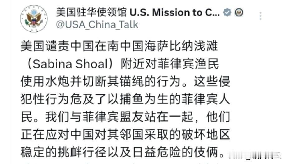 美国驻华使领馆这波表态,哪里是主持公道,分明是在拱火添乱! 嘴上喊着“与菲律宾站在一起”,实则是把菲律宾当遏制中国的棋子。近年来美国不断给菲律宾递武器、搞联合军演,还重申所谓“共同防御条约”,就是要挑动中菲对立,让南海变成冲突的“火药桶”。 自己却躲在背后,既巩固了在亚太的军事存在,又能牵制中国发展,算盘打得震天响。 南海本来能通过协商和平解决,可美国一插手就变了味。它才是地区稳定的最大破坏者,一年到头派上千架次侦察机来南海侦察,到处拉帮结派搞对抗。 所谓“破坏稳定”“危险伎俩”,不过是贼喊捉贼的套路。 美国驻华大使