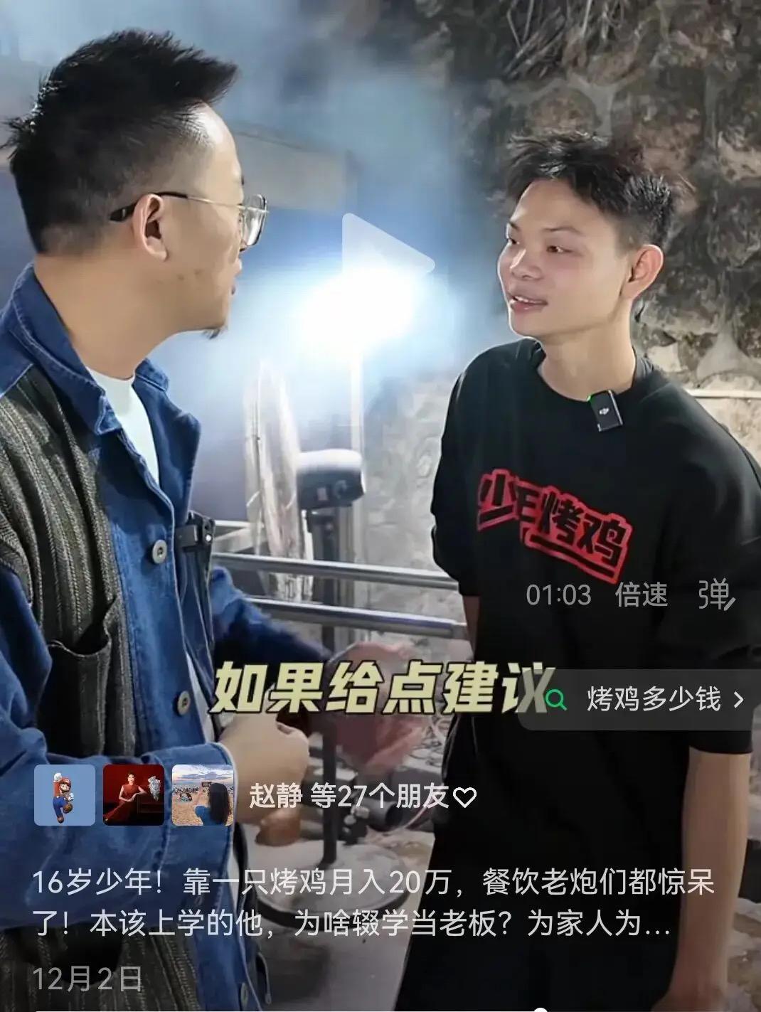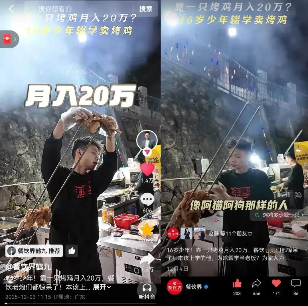 16岁少年靠一只烧鸡日入过万:青春最酷的模样,是靠双手拼出来的 你16岁时在做什么?是对着试卷愁眉苦脸,还是和同学嬉笑打闹?而深圳坂田和河南沈丘的两位16岁少年,已经靠着一只喷香的烧鸡,创下了日入过万的成绩,让无数网友直呼“破防了”——原来青春不止课本里的公式,还有烟火气里的奋斗传奇。 没人能随随便便成功,少年们的“金鸡”背后,是成年人都未必能承受的辛苦。深圳的小陈,掌心爬满炭火灼出的新旧疤痕,指关节还有长期剁鸡磨出的厚茧每天凌晨五点就去市场挑新鲜三黄鸡,手工腌制4小时以上,再用成本高出3倍的荔枝木现烤,收摊时腰都直不起来河南的张某更执着,20平米的小店只卖一款烧鸡,32味草本腌料精准配比,270℃高温锁汁,每天限量两炉过时不售顾客心甘情愿排队40分钟。他们没有靠山,没有剧本,小陈的创业本金是在工厂搬货攒下的3万,张某的生意经全是“把产品做透”的笨办法,这份踏实,比流量噱头更动人。 更戳人的是少年们的纯粹与担当。月入20万的小陈,穿39元的T恤,住800元的出租屋,却每月给父母打12万,只想让操劳半生的爸妈不用再早起干活,还想着供妹妹读完大学。他们的成功不是偶然:合规经营守底线,门店用监护人名义注册,检疫证明一应俱全;懂流量更懂初心,拒绝加盟炒作,坚持现烤现卖,复购率高达40%以上。这哪里是“少年老板”,分明是把责任刻进骨子里的实干家。 网友的热议里,藏着最真实的共鸣:有人羡慕“后生可畏”,有人敬佩“小小年纪肯吃苦”,也有人感慨“自己奋斗十年不如少年一只鸡”。但其实我们羡慕的从来不是“日入过万”的运气,而是那份敢闯敢拼的勇气,是不辜负时光的努力他们的故事证明,学历不是唯一出路,年龄不是成长枷锁,只要找准方向、踏实付出,平凡的小事也能做出大天地。 你16岁的梦想是什么?现在的你还在为它坚持吗?欢迎在评论区聊聊你的看法或是为这两位实干少年点赞——毕竟,靠双手赚钱、靠努力发光的样子,才是青春最该有的模样!
