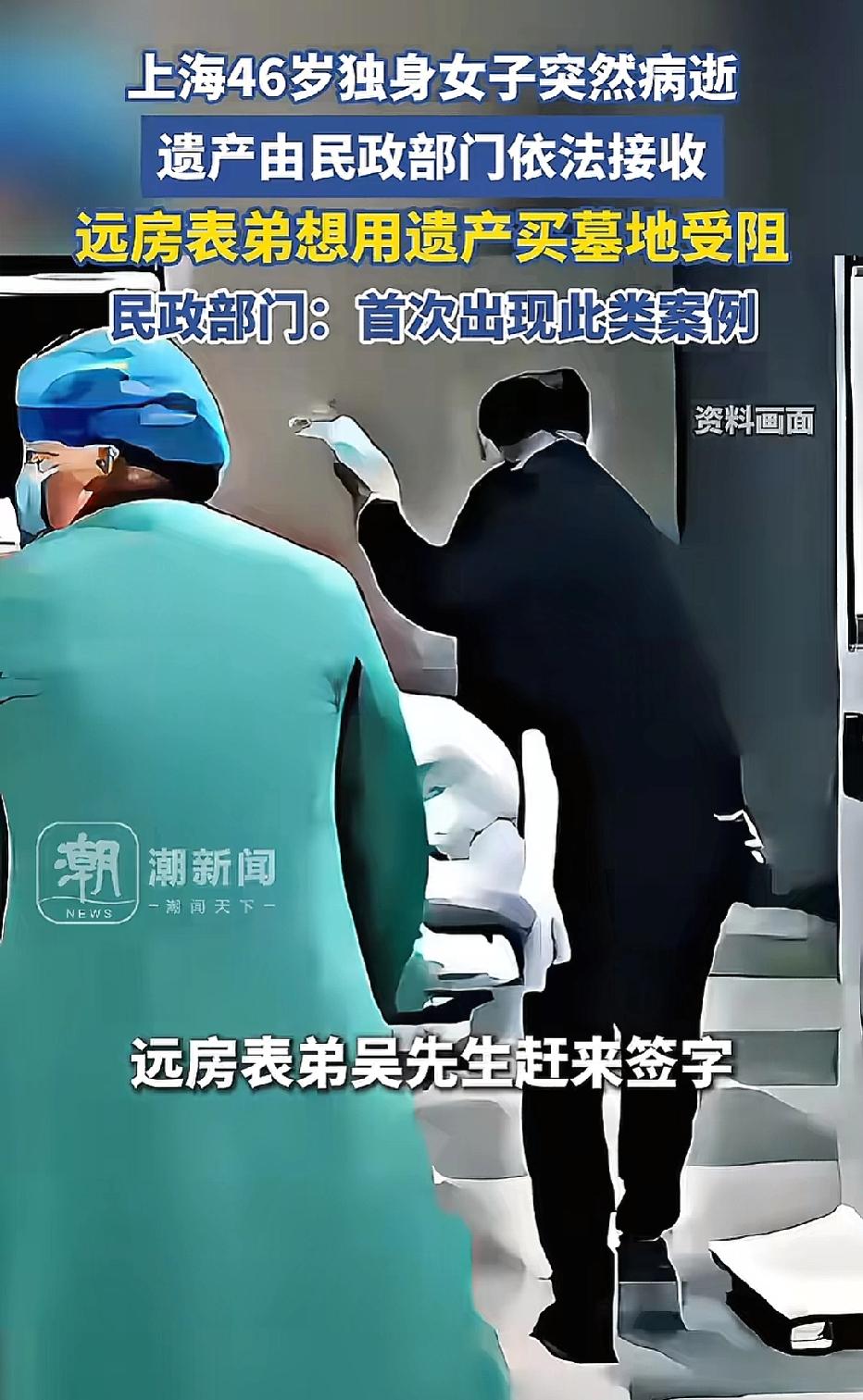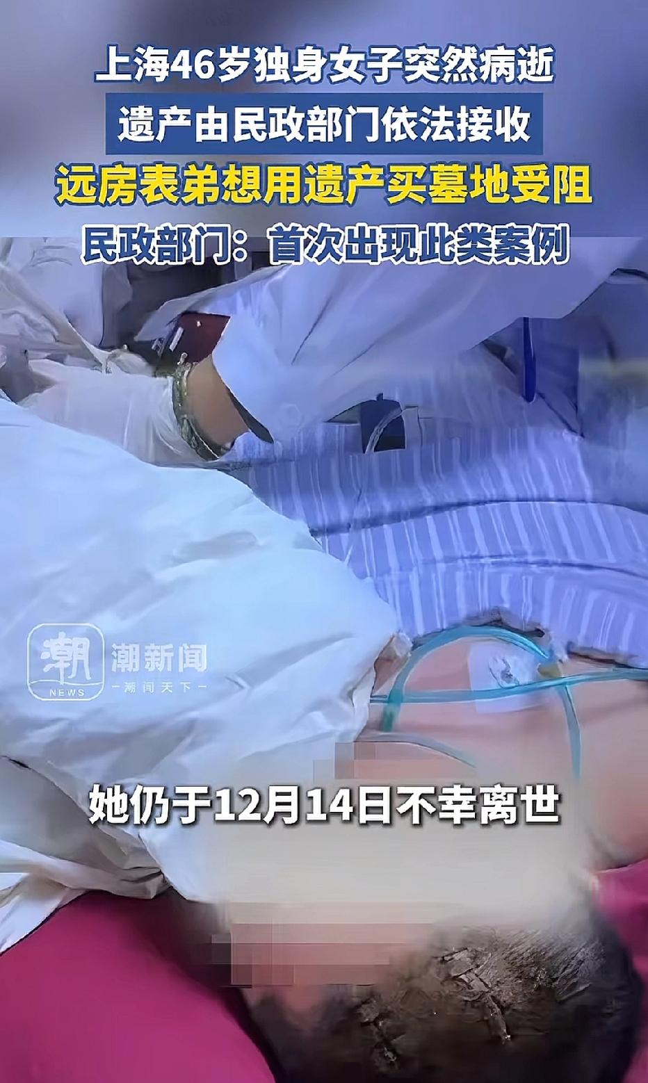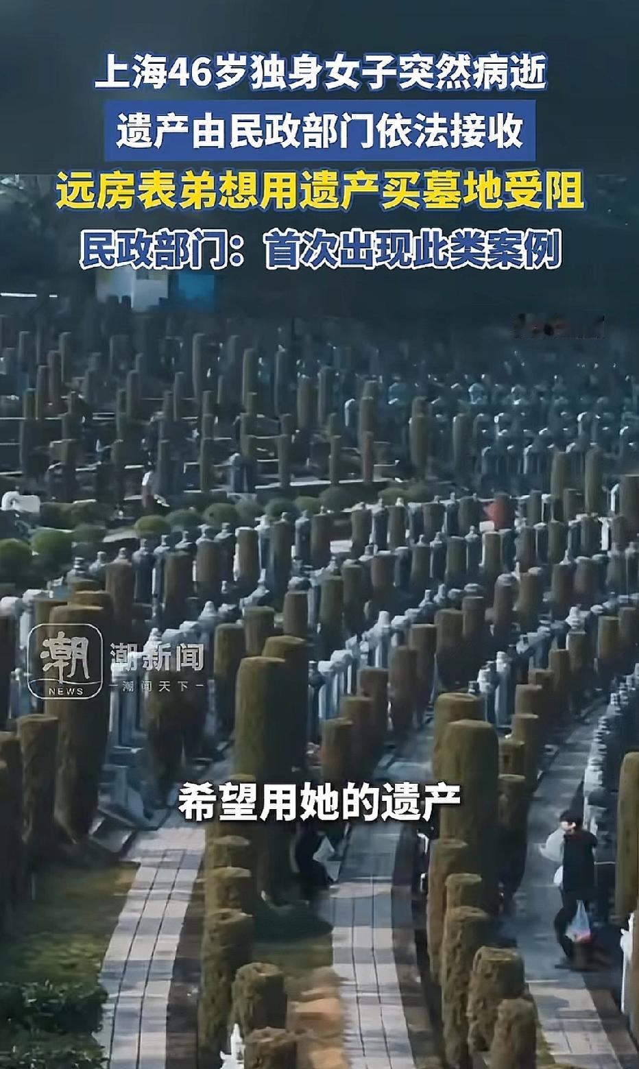 上海虹口,46岁女子突发疾病,父母不均不在世,也无儿无女,女子被送到医院抢救,远房亲戚帮垫付3万元医药费。女子还是因病去世,她的遗产被民政部门依法接受,但远房亲戚想用女子的遗产帮她办后事,买墓地,却遭到民政部门阻拦,他们接下来的话,让人傻眼。 据悉,46岁的蒋女士突发急病倒在家中,被邻居发现时已陷入昏迷。 紧急送医后,医生下达了病危通知,需要家属签字。 可翻遍蒋女士的通讯录,能联系上的只有一位多年不怎么走动的远房表弟吴先生。 蒋女士的人生太孤苦了。 父母早逝,她始终没遇上合适的人,一辈子未婚未育,平日里独来独往,靠着一份普通工作勉强维持生计。 当吴先生赶到医院时,看着躺在病床上毫无意识的表妹,有些心酸。 又听医生说抢救需要先缴纳医药费,没多想便掏出积蓄,前后垫付了3万元。 遗憾的是,纵使医护人员全力救治,蒋女士还是没能挺过来,在12月14日撒手人寰。 吴先生就犯了难,蒋女士没留下任何遗嘱,名下只有一套老旧的小房子和几万元存款。 可是她也没有继承人,吴先生正愁着谁来继承时。 更让他意外的是,民政部门工作人员找上门,告知蒋女士属于无继承人的情况,其遗产将依法由民政部门继承。 吴先生也没纠结遗产归属,他只想着表妹生前孤苦。 走后总得有块安身之地,便找到民政部门,提出想用蒋女士的遗产支付丧葬费和墓地费用,把后事办得体面些。 可这个合情合理的请求,却遭到了民政部门的阻拦。 工作人员的一番话,让吴先生彻底傻眼。 他们解释,无主遗产的处置有严格流程,丧葬费、墓地费这类支出的“合理标准”至今没有统一界定,加上第一次出现这样的案例。 如果贸然用遗产支付,后续可能面临合规性审查。 更现实的是,就算当下能解决墓地购置费用,后续每年的墓地管理费,也没有相关规定能从遗产里列支,最终还是得由亲戚承担。 最后,民政部门告知吴先生,只能海葬。 吴先生站在原地,心里五味杂陈。他垫付3万元医药费,从没想过要回报,只是不忍看表妹孤零零地走。 可如今,连让她入土为安的心愿,都卡在了制度的模糊地带里。 目前,民政部门正联合其他部门,研究临时监护操作指引。 蒋女士的遭遇,戳中了无亲群体身后事的痛点。 《民法典》第1160条规定:无人继承又无人受遗赠的遗产,归国家所有,用于公益事业;死者生前是集体所有制组织成员的,归所在集体所有制组织所有。 蒋女士父母早逝、未婚无子女,无法定继承人且未留有遗赠协议,其遗产符合“无人继承又无人受遗赠”情形,民政部门依法接收具有明确法律依据。 对于蒋女士这类无子女、无直系亲属的独居者来说,立遗嘱不仅能明确遗产归属,甚至可以指定专人负责操办后事。 总比身后之事没有得到保障好。 对此,你怎么看?