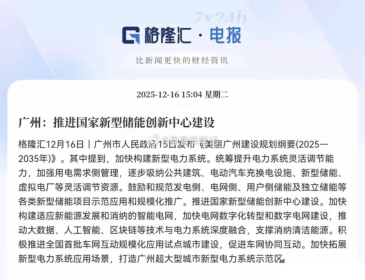 利好总是在盘后!!!一、这一板块迎来利好催化!!!广州发布《美丽广州建设规划纲要(2025—2035年)》,核心聚焦新型电力系统构建,明确推进国家新型储能创新中心建设,统筹吸纳新型储能、虚拟电厂、电动汽车充换电设施等灵活调节资源,鼓励全场景储能项目推广,同时推动大数据、AI、区块链与电力系统融合,打造超大型城市新型电力系统示范区,利好新型储能、虚拟电厂、智能电网、车网互动及电力数字化产业链。二、受益概念股Top20梳理1. 穗恒运A:广州本地能源国企,布局锂电、飞轮、全钒液流电池等储能技术,在建31个储能项目总容量373MWh,2GWh储能智造中心投产,深度受益广州新型储能创新中心建设。2. 广州发展:广州市属综合能源平台,覆盖电力、燃气、储能等业务,中标广州电网储能调频项目,新能源及储能业务毛利率超54%,是本地新型电力系统建设核心标的。3. 梅雁吉祥:参股广东吉洋能源布局飞轮储能,广州地铁18号线飞轮储能项目已挂网试验,技术获国家发改委认可,契合广州轨道交通储能场景需求。4. 国电南瑞:电力自动化龙头,虚拟电厂调度平台接入23个省级电网,2025年前三季度电力自动化营收186亿元,AI与电网调度融合技术支撑广州智能电网建设。5. 阳光电源:全球光储市占率超20%,“光伏+储能+调频”方案适配新能源消纳,海外户储订单增长,为广州新型电力系统提供光储一体化解决方案。6. 宁德时代:全球储能电池出货量第一,587Ah储能专用电芯循环超12000次,2025年三季度储能营收增58%,是广州储能项目核心电芯供应商。7. 东方电子:虚拟电厂全产业链服务商,AI现货价格预测系统误差率低于3%,实施南网首个市场化虚拟电厂项目,适配广州虚拟电厂资源聚合需求。8. 南网储能:南方电网储能平台,运营抽水蓄能与电化学储能电站总装机超12GWh,2025年前三季度储能辅助服务收入增29%,助力广州电网调节能力提升。9. 科陆电子:储能系统集成商,宜春10GWh基地供货国网项目,印尼3GWh基地在建,2025年前三季度净利润增251%,储能业务贡献超60%营收增量。10. 协鑫能科:虚拟电厂零碳服务龙头,接入可调资源超200万千瓦,江苏市场占比30%,其负荷聚合技术可复制至广州车网互动与虚拟电厂场景。11. 金智科技:源网荷储聚合平台服务商,参与长三角虚拟电厂试点,2024年储能系统集成收入增50%,技术适配广州用户侧储能与虚拟电厂建设。12. 许继电气:特高压设备龙头,国内唯一±1100kV换流阀供应商,储能变流器技术领先,为广州智能电网升级提供核心设备支撑。13. 特变电工:新能源并网与输变电龙头,海外EPC覆盖60国,柔性直流输电技术适配广州电网数字化转型,助力新能源消纳。14. 国轩高科:分布式储能标杆,磷酸铁锂电池低温性能领先,德国户储市占率超20%,可为广州工商业储能提供电池解决方案。15. 思源电气:电网智能监测龙头,AI诊断误报率低于0.1%,是国网/南网主供商,技术支撑广州电网安全监测与数字化改造。16. 林洋能源:全球最大智能电表出口商,微电网市占率40%,双向电表与海岛微电网方案适配广州电力需求侧管理。17. 积成电子:电网数字化服务商,国产调度软件市占率30%,数字孪生平台参与国网试点,助力广州电力系统数字化转型。18. 中天科技:海缆与电力传输龙头,500kV海缆技术全球领先,为广州海上风电并网及智能电网提供传输设备支撑。19. 北京科锐:虚拟电厂核心标的,完成能量管理平台技术升级,覆盖新型配电网、储能等场景,其EMS系统可服务广州虚拟电厂调度。20. 科士达:数据中心储能龙头,为阿里云、腾讯云提供光储方案,构网型储能系统毫秒级响应电网波动,适配广州数字电网建设需求。三、总结广州此次长期规划明确了新型电力系统的建设方向,新型储能、虚拟电厂、智能电网成为核心主线,本地能源国企将率先承接项目落地,而具备技术壁垒的储能设备、电力数字化龙头则有望凭借产品与方案优势参与广州市场建设。整体来看,产业链企业将从政策落地、项目招标、技术应用三大维度持续受益,行业迎来规模化发展机遇。本文涉及资讯、数据等内容来自网络公共信息,仅供参考,不构成投资建议!