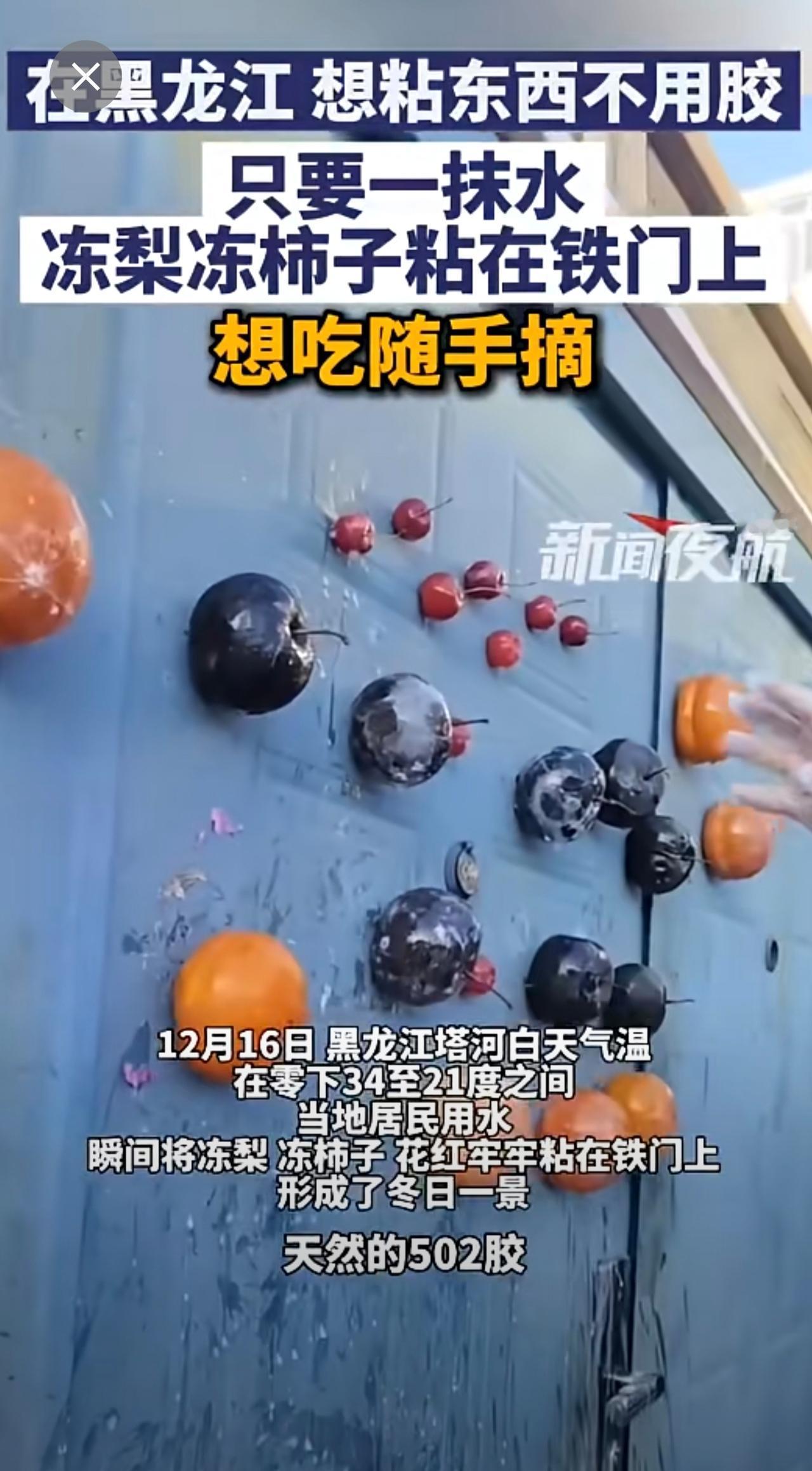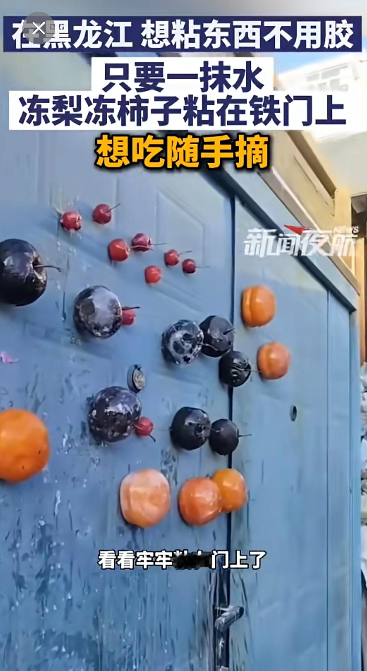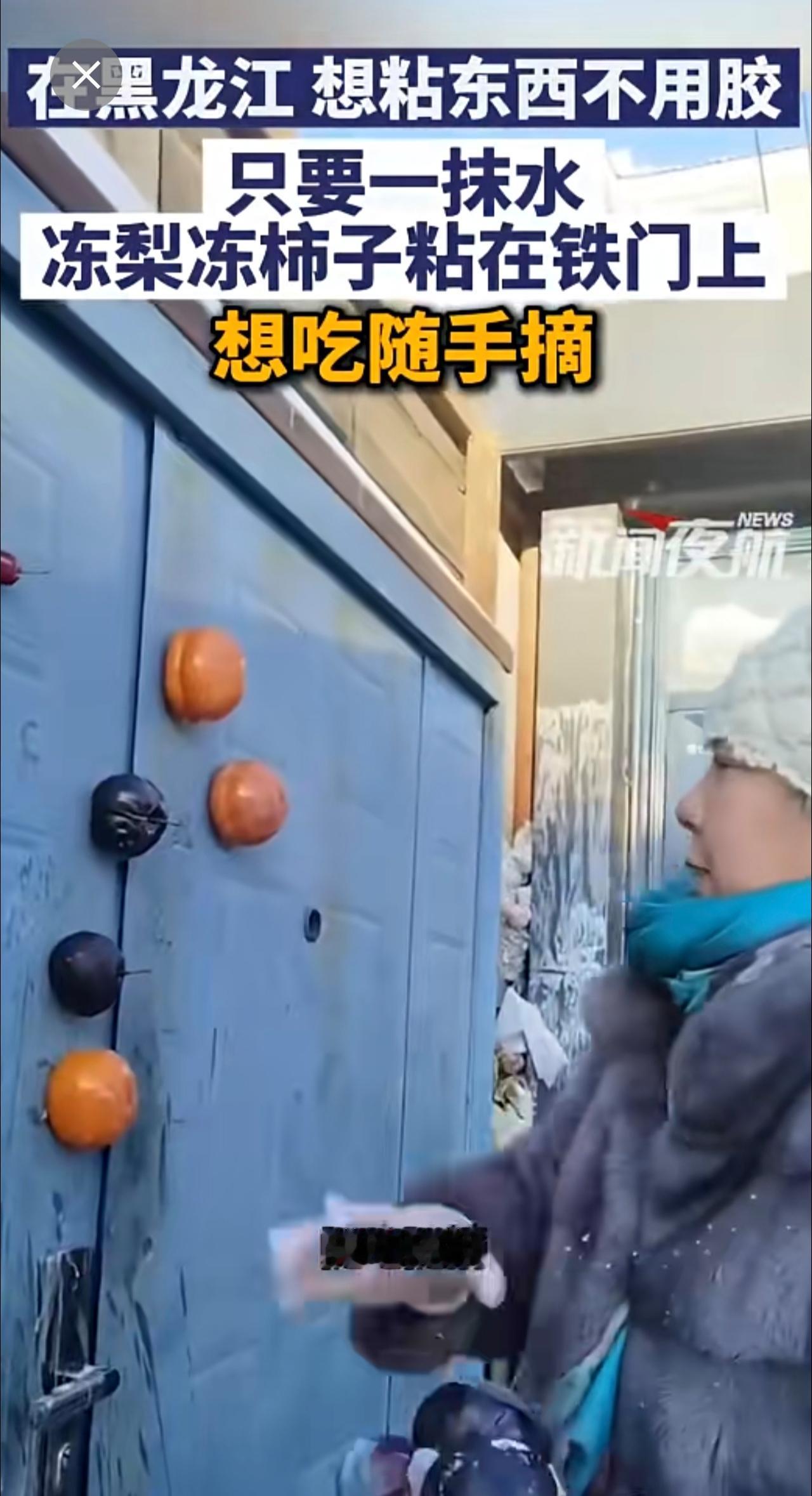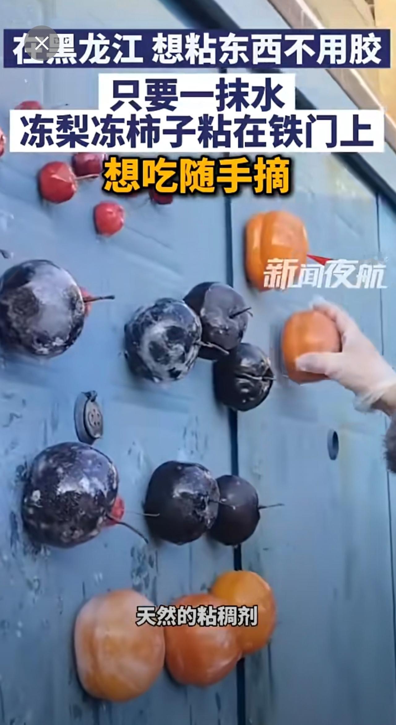 在黑龙江,想粘东西不用胶,只要一抹水:冻梨冻柿子粘在铁门上,想吃随手摘!(来源:新闻夜航)