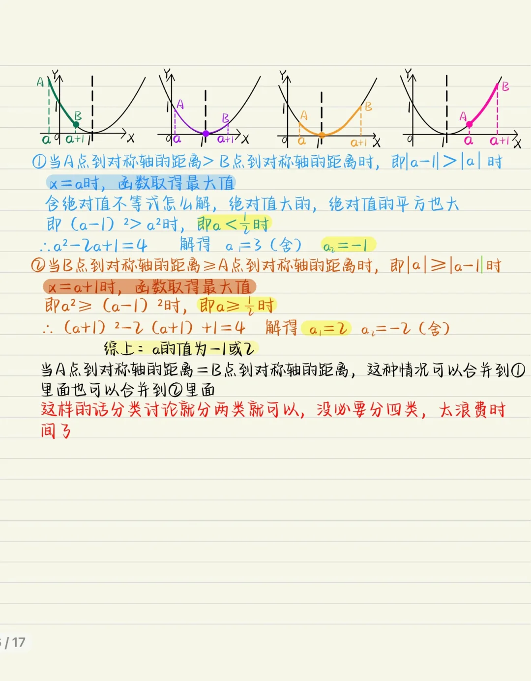 中考二次函数压轴:定轴动区间。中考来说,这个难度应该算天花板了,毕竟这类题高中我们也会碰到。分类讨论是数学一个很重要的工具,也是一个重难点,极其考验基本功,比如这题,不光考察二次函数,绝对值的含义是否真正明白,含绝对值不等式如何巧妙解决,这就要求我们平时学习要注重积累,不要看不起任何一个小知识点。 厚积薄发,方得始终。 加油吧!!!