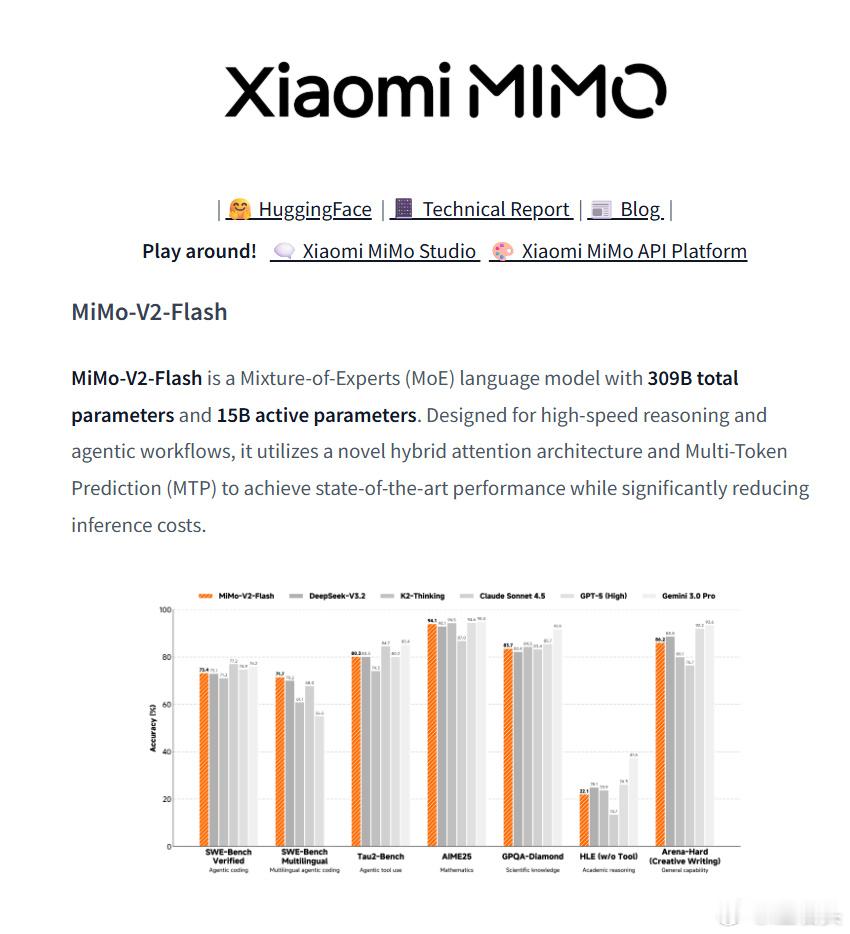Xiaomi MiMo Studio来了!小米上线了一个309B的大模型,在通用基准测试中,已经跟DeepSeek-V3.2打得有来有回了。DeepSeek-V3.2 水平接近GPT-5、Gemini 3.0 Pro。最惊喜的是它的速度,简直快到飞起,在国内的同级别模型里绝对是第一梯队,基本上你问题刚发出去,它是秒输出答案的。