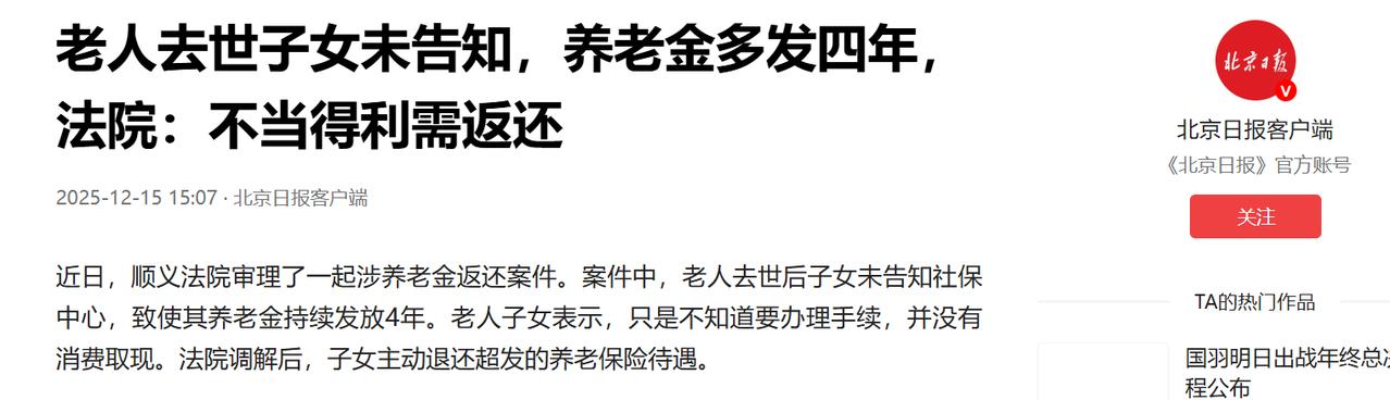 北京一老人去世后,子女却没有告知社保中心,导致其养老金多发了4年,金额达三万四千
