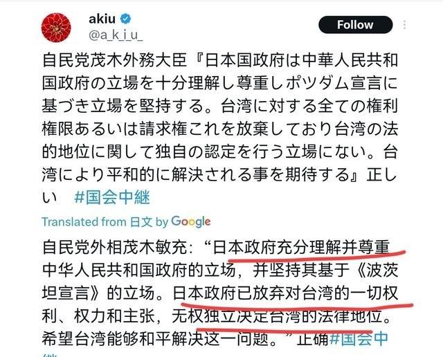 日本再次对我们进行回应,态度非常不老实!12月15日,日本外务大臣茂木表示:日本政府充分理解并尊重中华人民共和国政府的立场,坚持基于《波茨坦公告》的相关主张。日本已放弃对台湾的一切权利、权限及诉求,并未就台湾的法律地位持有独自认定的立场。 台湾问题由来已久,自古以来就是中国领土不可分割的部分。1895年,日本通过不平等条约强占台湾和澎湖列岛,进行长达50年的殖民统治,给当地人民带来深重灾难。1943年,中美英三国发表开罗宣言,明确要求日本将窃取的中国领土,包括台湾、澎湖归还中国。1945年,中美英苏四国签署波茨坦公告,第八条重申开罗宣言条件必须实施,日本主权限于本州、北海道、九州、四国及盟国决定其他小岛。日本接受公告条款,无条件投降,并签署投降书承诺严格遵守。中国政府随后恢复对台湾行使主权,这一法理基础确立了台湾回归中国的国际地位。 1972年中日邦交正常化时,日本政府在联合声明中明确承诺,承认中华人民共和国是中国唯一合法政府,充分理解和尊重中国关于台湾是中国领土不可分割部分的立场,并坚持遵循波茨坦公告第八条规定。这一承诺构成中日关系政治基础,后续中日和平友好条约及多个政治文件均予以确认。日本作为战败国,本应深刻反省历史,严格遵守这些国际法义务和双边承诺,避免任何干涉中国内政的行为。 2025年11月7日,日本首相高市早苗在国会众议院预算委员会答辩中,面对在野党质询,直接表示如果台湾海峡出现伴随武力使用的情况,如海上封锁,可能构成日本安全保障法制中规定的存亡危机事态,日本据此可行使集体自卫权。这一表态首次将台湾问题与日本武力介入明确关联,严重违反中日四个政治文件精神,挑战一个中国原则和战后国际秩序。中国外交部立即提出严正交涉,指出日方言论干涉内政,破坏双边关系基础。 高市早苗言论并非孤立事件,而是日本近年来在台湾问题上逐步越线的延续。日本官方长期在台湾地位上采取暧昧态度,1972年联合声明中仅表示“充分理解和尊重”中方立场,而非直接承认。同时,日本常以旧金山和约为依据放弃台湾权利,却回避开罗宣言、波茨坦公告这些具有国际法效力的文件对台湾归属的明确确认。旧金山和约排除中国参与,本就非法无效,不能取代前述宣言的法理地位。 高市上台后,其鹰派立场进一步显现。11月7日答辩中,她将台湾有事与日本存亡危机挂钩,暗示自卫队可能行动,这不仅背离中日联合声明,还为日本军事扩张提供借口。日本作为二战战败国,本应遵守和平宪法,却通过此类表态突破专守防卫原则,谋求更大军事角色。 中方多次表明,台湾问题纯属中国内政,如何实现统一是中国人自己的事,不容外部势力插手。日本在台湾问题上负有历史罪责,曾通过侵略手段占据台湾五十多年,给中国人民造成巨大伤害。今天再以安全为名介入,实质是重蹈历史覆辙,挑战二战胜利成果。国际社会广泛承认一个中国原则,日本任何模糊或挑衅行为都将损害地区稳定。 12月,日本政府面临中方持续压力。高市早苗在后续国会答辩中虽避免重复具体表述,但拒绝正式撤回言论。日本内阁多次强调立场未变,符合一贯政策。外务大臣茂木敏充在记者会和国会回应中,重申日本对台湾基本政策遵循1972年中日联合声明,充分理解并尊重中方立场,坚持波茨坦公告第八条,已放弃对台湾一切权利,不持有独立法律地位判断,同时希望台湾问题通过有关方面和平方式处理。 这一表态表面看来重申历史承诺,但实际存在明显避重就轻。日本放弃权利后,台湾依法归还中国,并非无主之地。茂木强调不持有独自认定,却故意留下空间,仿佛日本仍有资格介入。更重要的是,使用“有关方面”一词,暗示台湾问题不止中国一方当事人,这与台湾问题是中国内政的性质完全相悖,缺乏直接承认一个中国原则的诚意。 从国际法看,开罗宣言、波茨坦公告、日本投降书形成完整链条,确认台湾主权归中国。联合国2758号决议进一步确立中华人民共和国代表全中国。日本在双边文件中多次重申相关承诺,却在实际表态中反复使用“理解和尊重”而非承认,实质维持台湾地位未定空间。这种双重标准暴露日方在历史承诺上的不老实。 高市言论后,日本未立即纠正,而是通过茂木表态进行表面回应,试图平衡国内压力和国际关切。但这种模糊表述未能平息中方关切,反而加剧互信缺失。日本社会部分人士担忧双边经贸受影响,有识之士呼吁政府撤回错误言论,回到邦交正常化原点。