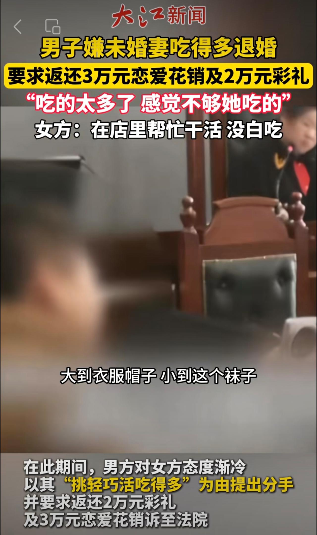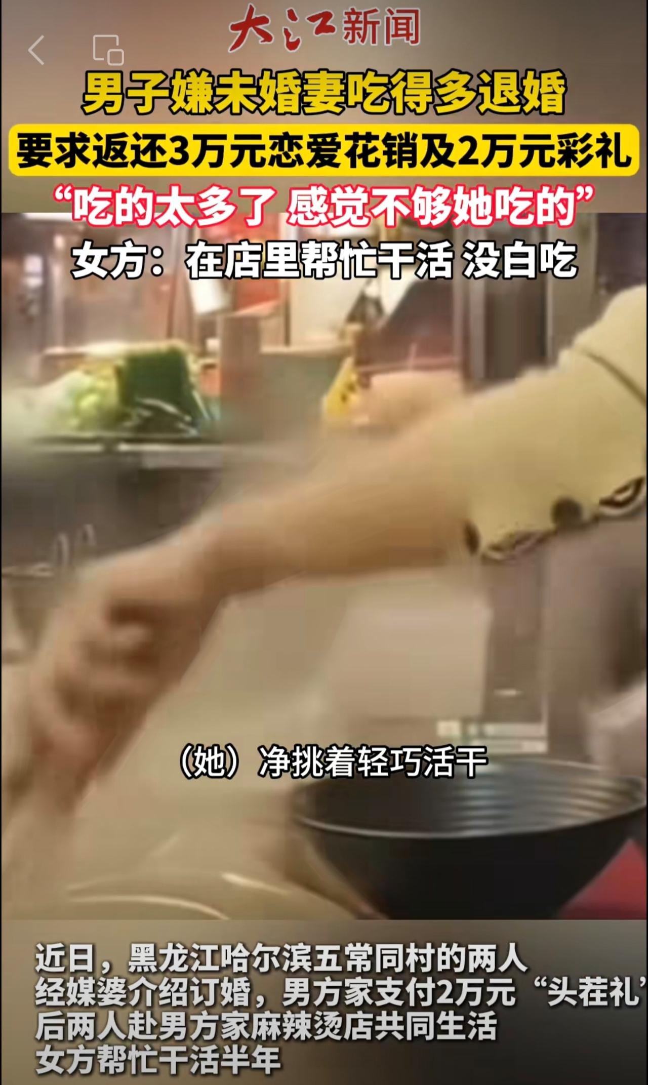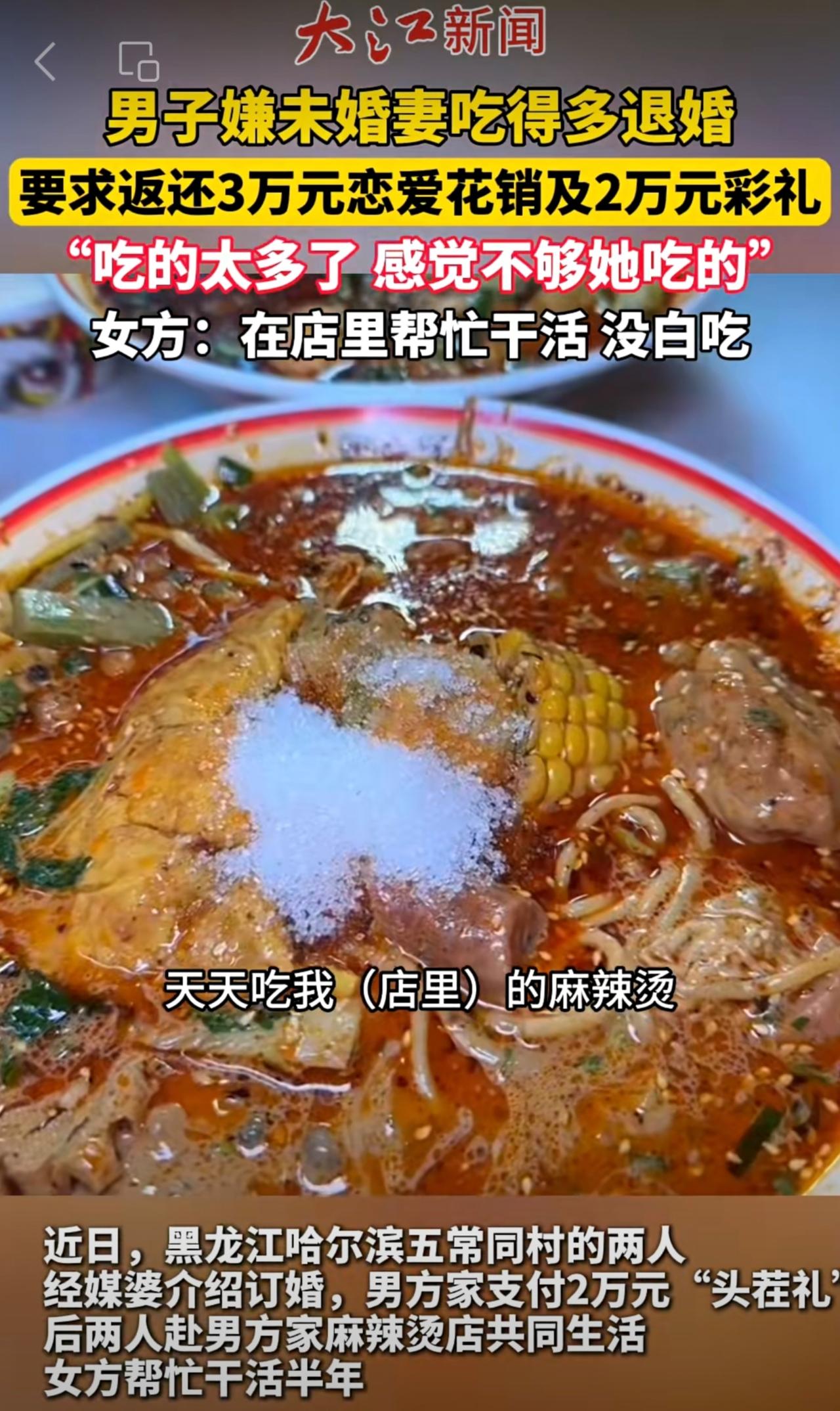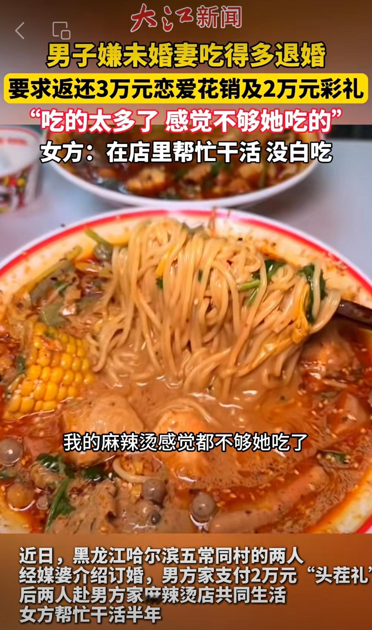 男子嫌未婚妻吃得多退婚,起诉女方退2万元彩礼及3万元恋爱开销,女方:在你麻辣烫店干活,没白吃。