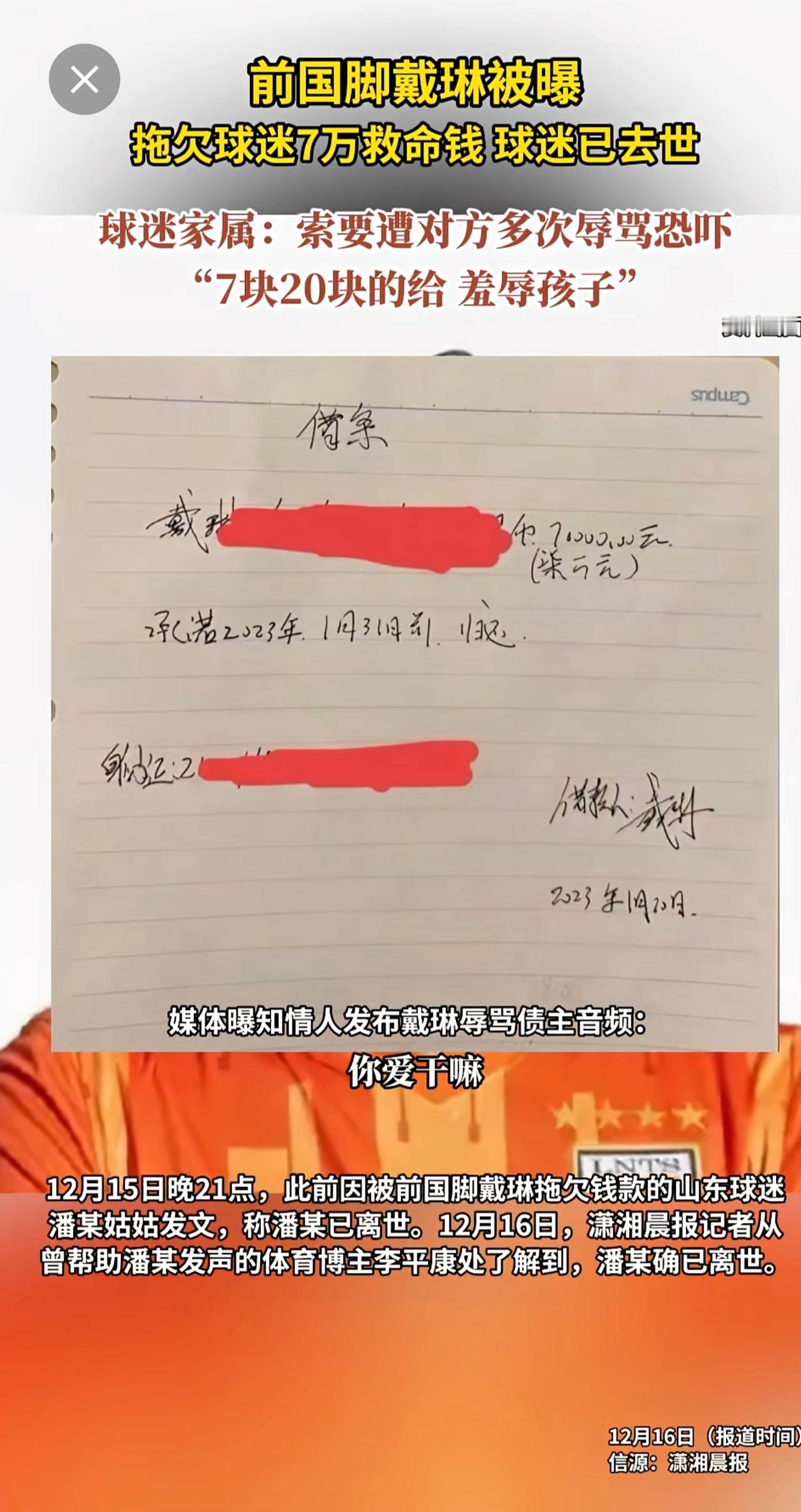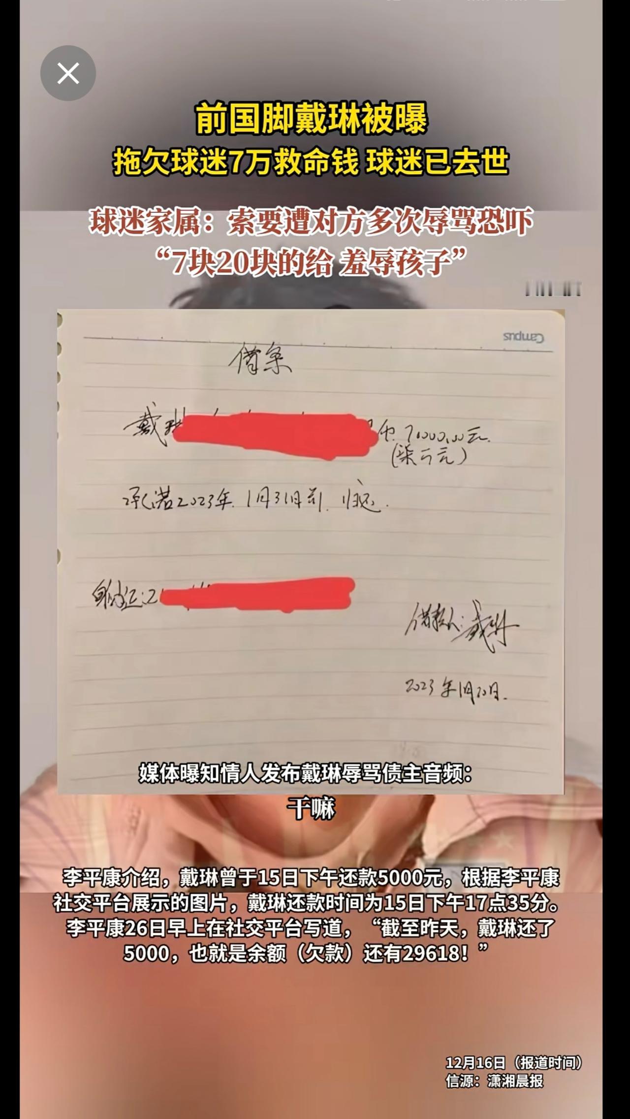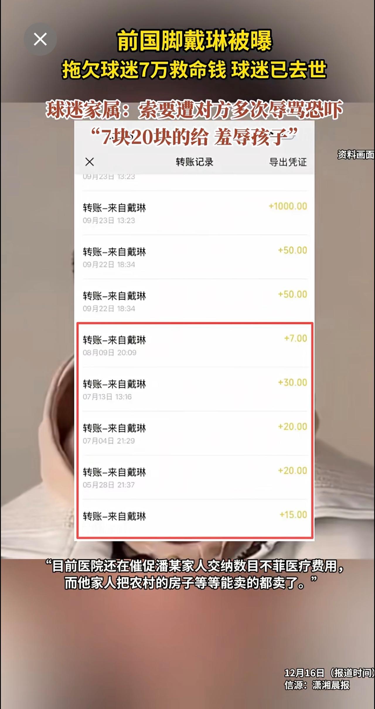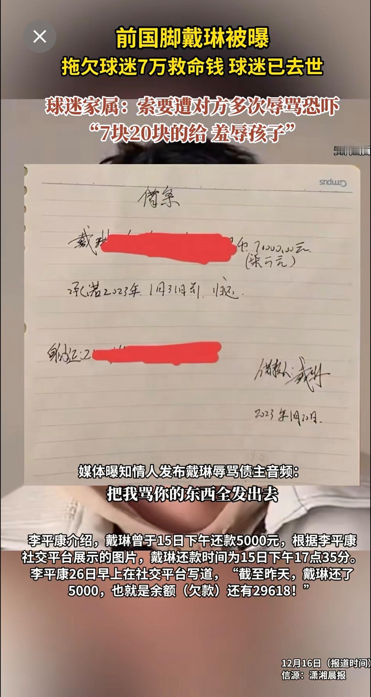 前国脚戴琳被曝拖欠球迷7万救命钱,球迷已去世,球迷家属:索要遭对方多次辱骂恐吓,7块20块的给,羞辱孩子。
