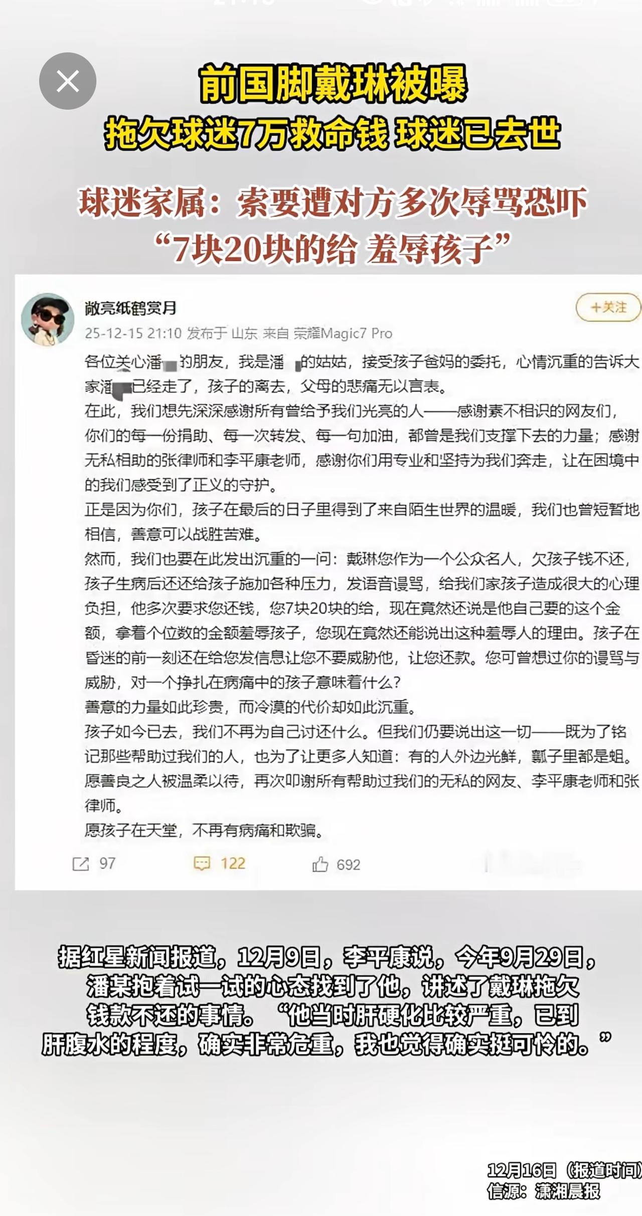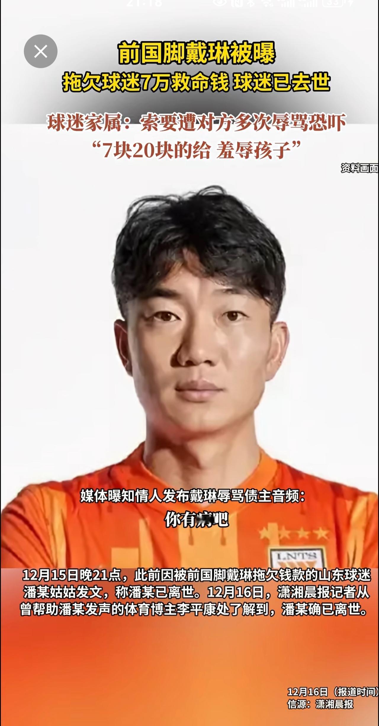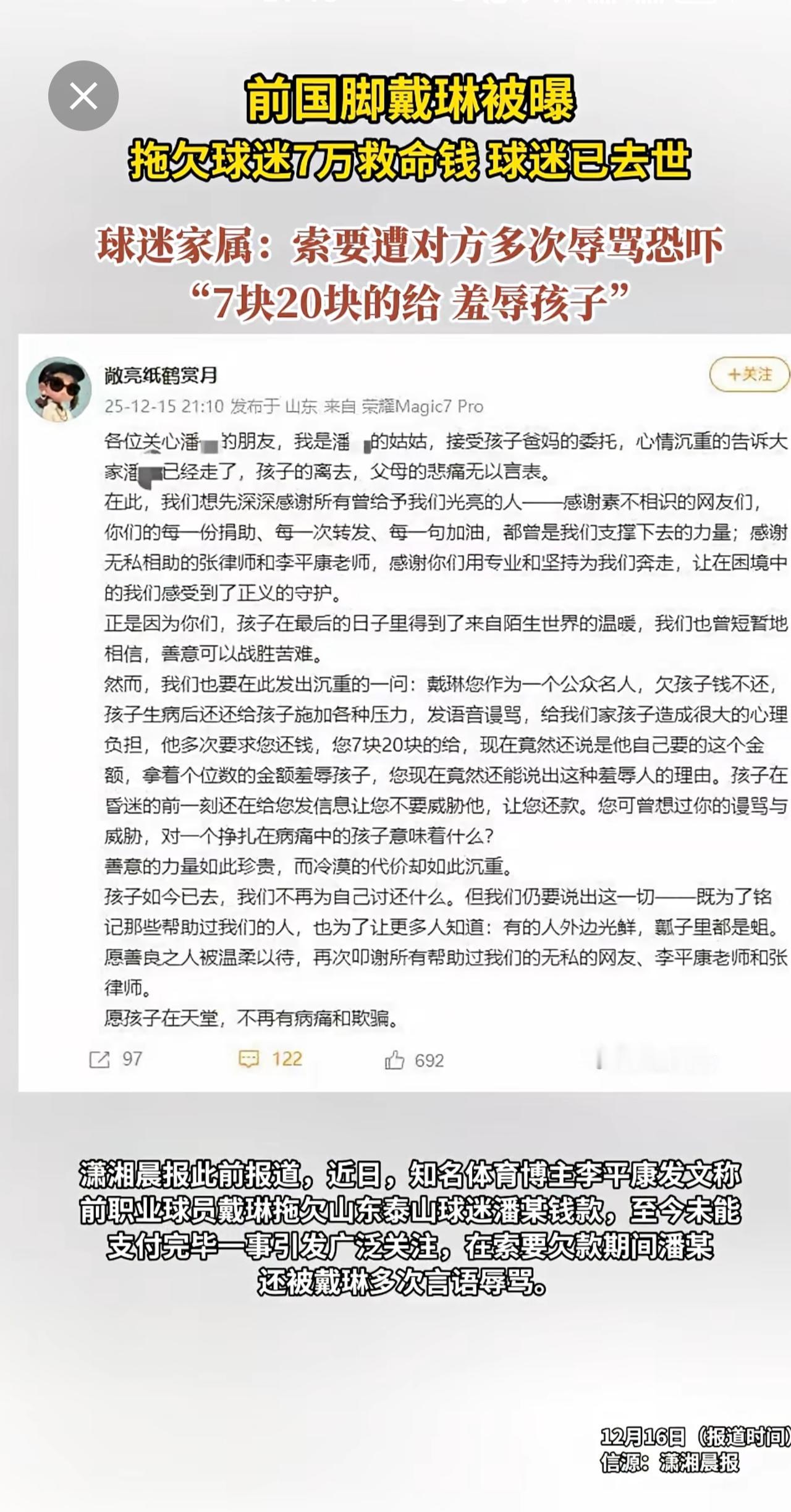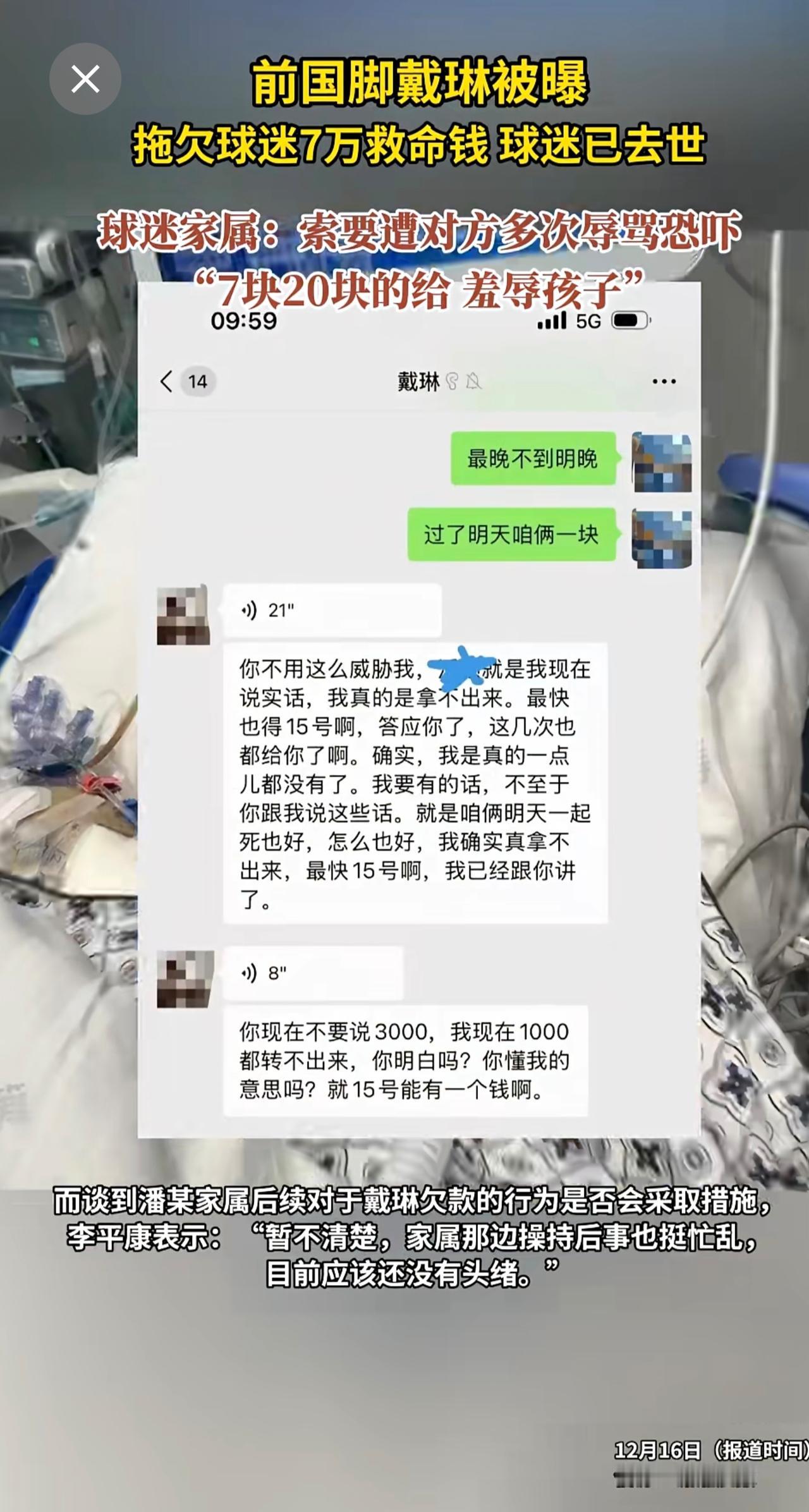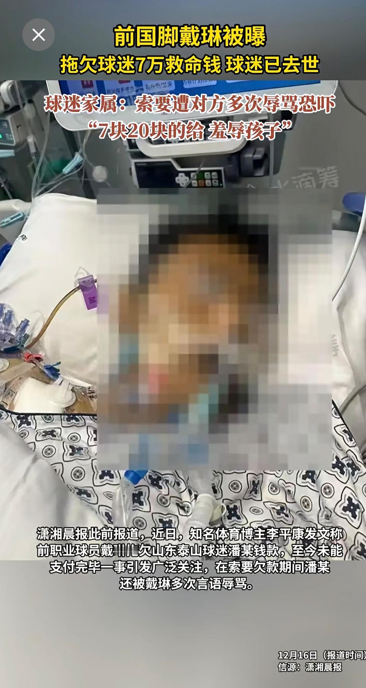 前国脚戴琳被曝拖欠球迷7万救命钱,球迷已去世,球迷家属:索要遭对方多次辱骂恐吓,7块20块的给,羞辱孩子。