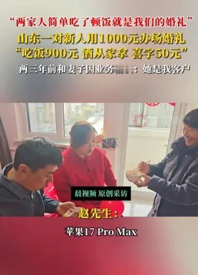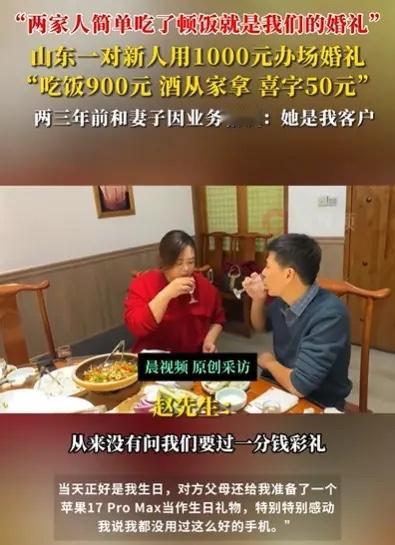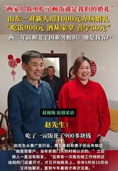 “随便发个视频,没想到就火了。”山东,赵先生和妻子举行婚礼,没有请司仪,没有婚车队,自己开车把新娘接来,花50块钱买了些喜字贴墙上,两家人简简单单吃了顿饭,花了900块钱,酒是从家里拿的,总共开销1000元左右!网友:佩服你们,不卷,不攀比,两个人是真爱! 赵先生觉得,结婚是两个人的事,排场都是给别人看的。他和新娘商量好,不搞那些虚头巴脑的流程。接亲那天,他就开着自己的车去接新娘,没有长长的车队,但车里装满了实实在在的幸福。 墙上贴的大红喜字才花了五十块钱,喜庆的气氛一点没少。酒席就是两家人坐在一起吃了顿饭,聊聊家常,祝福新人。整个过程轻松自在,没有半点压力。新娘后来也说,这样的婚礼让她觉得特别踏实,因为所有的关注点都在“人”身上,而不是在“事”上。 赵先生把婚礼视频发到网上,本意就是记录生活,没想到一下子引起这么多网友点赞评论,羡慕他们能打破面子观念,追求自己想要的幸福生活。现在很多婚礼攀比成风,反而忘了结婚的初心是什么。 像赵先生这样喜事简办的新人越来越多。有的年轻人选择集体婚礼,或者用公交车当婚车,既特别又有意义。大家渐渐明白,婚礼的豪华程度,和婚姻的幸福程度压根不成正比。 当下很多年轻人更看重内心的感受,更愿意为真实的生活投资,而不是为别人的眼光买单。一场婚礼花费几万甚至十几万,完全可以用来作为小家庭的启动资金,或者一次难忘的蜜月旅行,这比繁琐的应酬和疲惫的表演实在得多。 真正的幸福,从来不需要用盛大的排场来证明。它藏在柴米油盐的平淡里,藏在相濡以沫的默契中。婚礼只是一天的仪式,而婚姻才是漫长的修行。 各位读者你们怎么看?欢迎在评论区讨论。