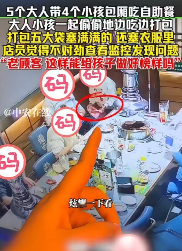 新疆,5个大人带4个孩子吃自助餐,吃到一半时,店员发现不对劲,这几个人竟然点了41份榴莲,22份三文鱼,其他海鲜也基本是10份起点,店员马上调取监控,果然发现猫腻,这9人居然边吃边打包,不仅把食材塞口袋,连衣服里也塞得满满的。老板吐槽:这样能给孩子做好榜样吗? 那天餐厅生意挺火,包厢基本都坐满了,其中一间包厢里坐了 9 个人,5 个大人带着 4 个孩子,看着就是一家人出来聚餐的样子,店员一开始也没多想,正常上菜、添水,没觉得有啥异常。 等到饭点过半,负责核对点单数据的店员整理后台时,目光一下被这桌的单子黏住了,这 9 个人竟然点了 41 份榴莲,紧接着是 22 份三文鱼,后面跟着 10 份 M9 牛肉,就连捞汁章鱼须、扇贝肉也各点了 11 份,无骨鸡爪都要了 9 份,更让人纳闷的是,但凡海鲜类的食材,这桌基本都是 10 份起步点,而且还在不停追加。 店员越看越觉得不对劲,9 个人就算都是大胃王,也架不住这么点啊,尤其是榴莲和三文鱼,都是饱腹感强、价格也不低的食材,这数量实在超出了正常用餐的范畴,心里犯嘀咕的店员赶紧跟主管说了这事儿,主管也觉得蹊跷,当即决定调取这个包厢的监控,看看里面到底是什么情况。 监控画面一调出来,大家算是看清了这伙人的 “操作”,原来这 5 个大人从进店时就带着好几个大布袋子,一开始袋子瘪瘪地堆在角落,没人在意。 可吃到一半孩子们就先动起了手,一个小孩机灵地把袋子撑开,另一个就帮忙把桌上还冒着热气的榴莲、三文鱼往袋子里塞,塞完还一脸得意地跑到大人身边,像是完成了什么了不起的任务,而旁边的大人们不仅没阻止,反而默认了这种行为,有的甚至亲自上手,把盘子里的食材快速往袋子里倒。 等到布袋都装满了,这伙人还没停手,几个大人干脆把剩下的食材用纸巾或者保鲜膜裹了裹,往自己的口袋里塞,连衣服内侧都塞得鼓鼓囊囊,看着就像是揣了不少东西。 整个过程中孩子们有样学样,一会儿帮忙递食材,一会儿帮忙拉袋子拉链,完全没觉得这种行为有什么不对,反而觉得挺有意思,监控里能清楚看到,他们一边假装吃饭,一边偷偷打包,动作还挺麻利,显然是早有准备。 等到这伙人吃饱喝足,提着鼓鼓囊囊的布袋,揣着藏在身上的食材,若无其事地去前台退押金时,店员们看着他们的背影都挺无奈,老板得知情况后,更是气不打一处来,忍不住吐槽:“开餐厅这么多年,见过想多吃点回本的,没见过这么明目张胆打包的,还是带着几个孩子一起来的。 自助的规矩就是按人付费、现场食用,哪能这么搞?这些家长当着孩子的面偷拿食材,这不是教孩子学坏吗?能给孩子做好榜样吗?” 其实在新疆,不管是餐厅还是食客,都挺讲究实在和规矩,自助餐厅愿意把好食材拿出来让大家敞开吃,图的是大家吃得开心、吃得放心,而食客们也大多能遵守 “适量取用、不浪费、不外带” 的默契。 这 5 个大人带着 4 个孩子,为了多拿点食材,就这么破坏规矩,不仅让餐厅受了损失,更重要的是给孩子传递了错误的信号,孩子们年纪小价值观还在形成,家长的一言一行都是他们学习的榜样。 当着孩子的面偷偷打包自助餐厅的食材,看似占了点小便宜,却在孩子心里埋下了 “规则可以随便打破”“投机取巧能获利” 的种子。这种影响,可比损失几份榴莲、三文鱼严重多了。 后来不少知道这事儿的本地人都觉得,不管是过日子还是出门吃饭,规矩不能丢,尤其是做家长的,更得给孩子做好示范,自助餐厅的食材再好,也得凭着良心吃、守着规矩吃,可不能为了点小利,毁了孩子的品行,这实在是得不偿失。