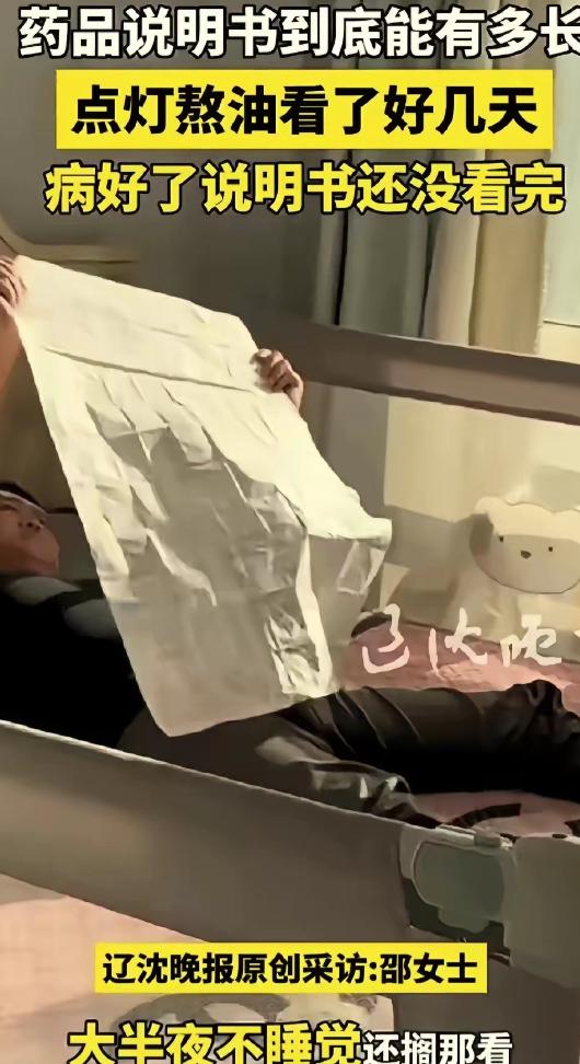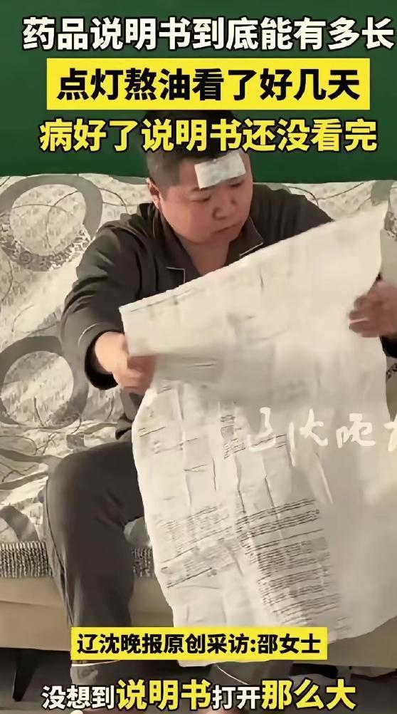辽宁一男子发烧买了点药,想看看吃的剂量,结果,当他打开说明书,直接就懵圈了,摊开说明说后,竟然有一大张,比A4纸还大,他仔细从头开始看,看了几天时间,烧都退下去了,说明书还没看完。网友:这就是现在药品贵的原因,你看懂了说明书,你的病也能自己医了! 咱平时买药就是图个救急,不管是头疼脑热还是发烧感冒,拿到药第一反应就是找 “一次吃几粒”“饭前还是饭后吃”,可现在有些药的说明书,真是让人哭笑不得。 就说辽宁那位老兄,前阵子发烧了,浑身没力气,头昏脑涨地去药店买了盒退烧药,本想着赶紧按说明吃了好退烧,结果打开药盒拿出说明书的那一刻,直接就懵圈了。 那说明书哪儿是说明书啊,简直就是一张 “巨幅海报”,摊开了比 A4 纸还大一圈,上面密密麻麻全是字,黑黢黢的一片,看着都让人眼晕,这哥们当时烧得迷糊,但也知道吃药不能瞎吃,剂量不对可不行,于是就强撑着精神,打算从这堆字里把用法用量给找出来。 谁能想到这一看就陷进去了,一开始他还坐在桌前,逐字逐句地往下捋,可越看越头疼,上面全是些生涩的化学名词、专业的药理描述,好多词儿别说理解了,连认都得琢磨半天,没办法他只能一边看一边拿手机查,碰到不懂的术语就搜一下,生怕漏了关键信息。 白天他烧得难受,躺着的时候也不忘把说明书放在枕边,趁清醒点就翻两页,吃饭的时候手里拿着筷子,眼睛还得瞟着那张大纸,琢磨着刚才看到哪儿了,晚上睡觉前本来就因为发烧睡不踏实,还得硬撑着搞 “睡前研读”,就想把这说明书给啃完。结果呢? 整整三天过去了,他身体底子还算硬朗,烧慢慢退了精神头也回来了,甚至都能正常去上班了,回头再看那本说明书,进度条才刚过三分之二,后面还有一长串的不良反应、禁忌事项没看完呢。 这事儿被他分享到网上后,立马引发了好多人的共鸣,网友们的吐槽也是一针见血:“现在药品贵是有原因的,合着买药还附赠‘半个医学院课程’呢,等你把说明书看懂了病自己都好了,压根不用吃药了!” 这话听着是玩笑,可仔细想想,真是说到了大伙儿的心坎里。 咱普通人买药,需求特别简单,就是想快速知道核心信息,一次吃多少、一天吃几次、有没有什么不能一起吃的、需要注意啥,可现在的说明书,偏偏把这些最关键的内容,藏在成千上万的小字里,跟大海捞针似的。 那些化学成分表、详细的性状描述、一长串的不良反应,堆得比啥都多,厂家像是生怕漏写一个字就要担责任,把说明书搞得跟法律免责声明一样,全是专业壁垒就是不想让人轻松看懂。 药品是用来治病救人的,说明书的初衷也是为了让大家安全用药,可现在有些说明书却跑偏了,变成了 “阅读障碍”,反而给安全用药添了堵。希望厂家能多站在普通人的角度想想,把说明书做得实用点、好懂点,让大家不用再拿着放大镜 “考古” 式看说明书,毕竟咱买药是为了治病,不是为了考医学院啊。