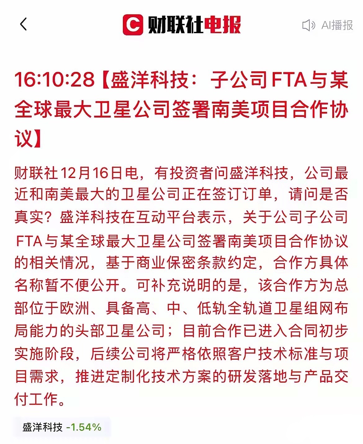 大利好!“盛洋科技”拿下全球卫星巨头大单!子公司已签署南美合作协议,股价或迎催化!盘后,盛洋科技发布一则公告:其欧洲子公司FTA已与某“全球最大卫星公司”签署南美项目合作协议。这标志着其自主研发的卫星通信技术获得了国际顶级巨头的认可。公告中强调基于保密协议,未透露具体公司,但补充了其总部位于欧洲、拥有高中低轨全轨道布局的行业绝对龙头,全球用户规模近23亿。合作基于盛洋科技子公司FTA的DVB-NIP技术,这是一种融合卫星广播与互联网的先进解决方案,是切入新兴卫星互联网市场的关键。目前,协议已进入“合同初步实施阶段”,公司正按客户需求推进定制化研发与产品交付。此消息无疑是重大利好!·想象空间巨大:与行业龙头的绑定,为公司在全球卫星互联网市场打开了广阔的成长预期。·商业化里程碑:不再是实验室技术,而是进入实施交付阶段,意味着技术变现的通道已经打开。但此合作已于10日首次被报道,当时公司股价直线涨停,短期热度能否持续,拭目以待!